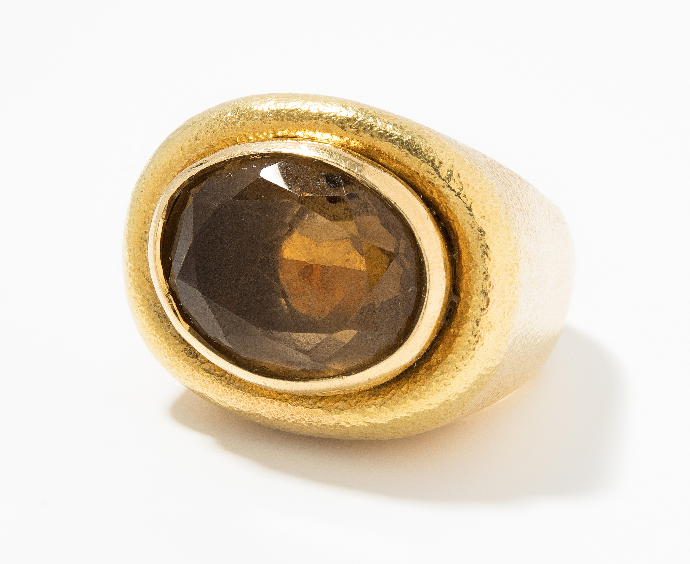 1980er Jahre. 750 Gelbgold. 1 oval fac. Rauchquarz ca. 17x14-9 mm. Massive Ringmontur mit strukturierter Oberfläche. Gr. 54,5. 35,2 g.