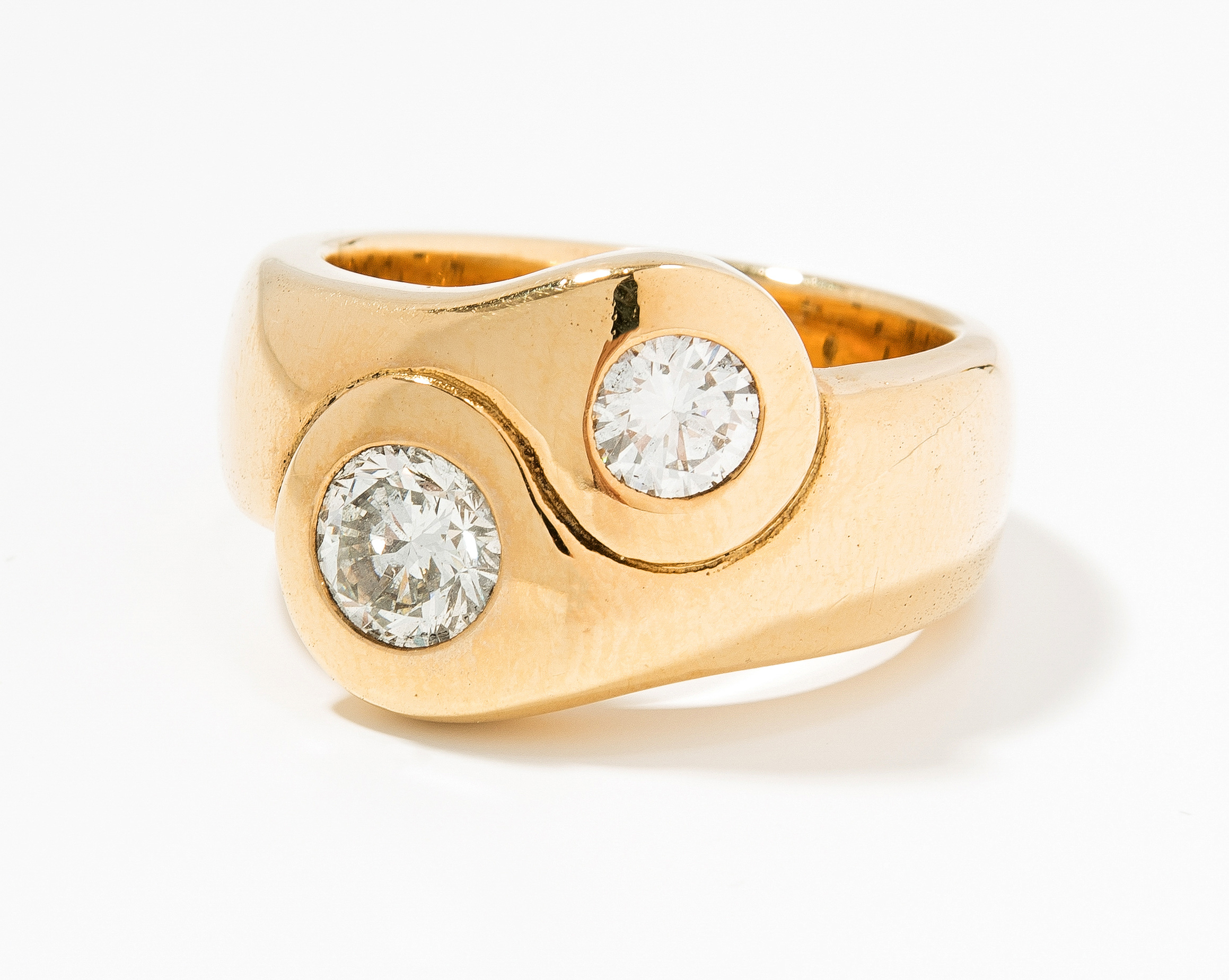 750 Gelbgold. Massiver Ring mit 2 eingeriebenen Brillanten, 0.45 ct/0.90 ct, H/I-si. Gr. 61, 27,8 g.
