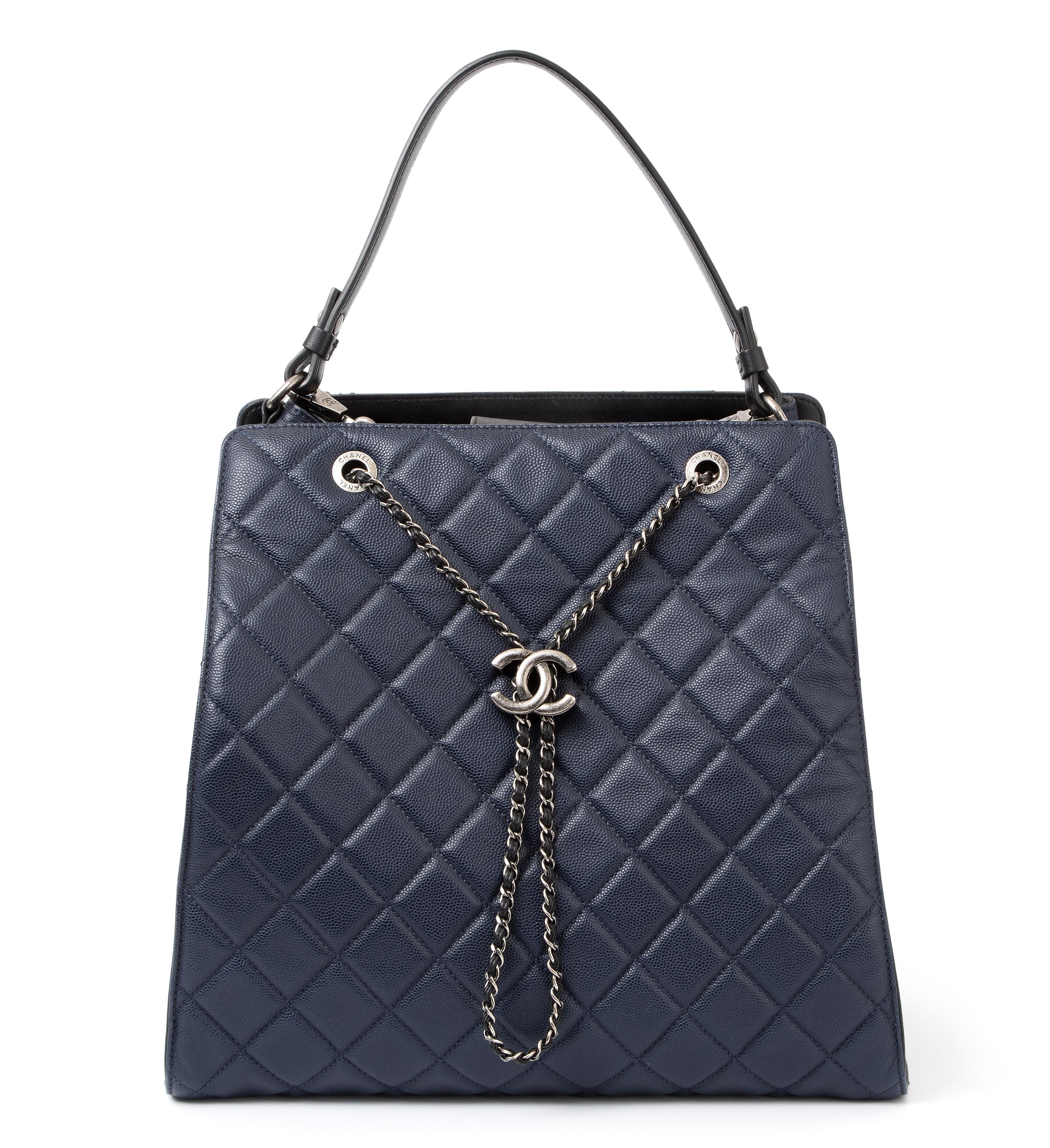 Aus dem Jahr 2016. Handtasche aus dunkelblauem Kaviar-Leder mit gestepptem Rautenmuster. Kordelverschluss mit CC-Logo und Magnetverschluss. Tragegriff aus Leder und langer, abnehmbarer Kettenriemen aus geschwärztem Metall. Mit Authentizitätskarte. 31x28x15 cm. In Original-Schutzbeutel. Sehr guter Zustand.