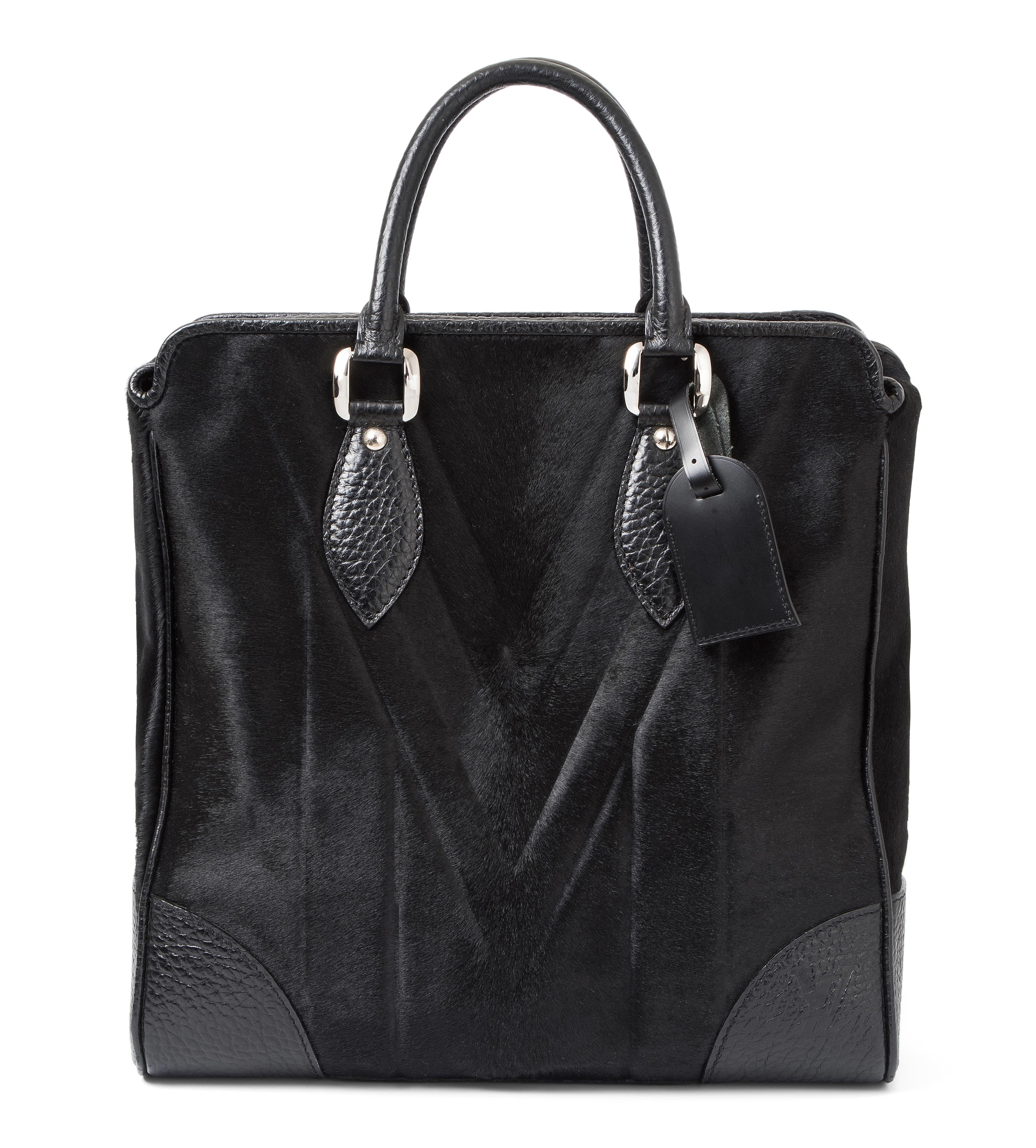Aus dem Jahr 2006. Aus schwarzem Ponyfell und schwarzem genarbtem Leder. Silberfarbene Metallbeschläge. Doppel-Tragehenkel. Adressanhänger (monogrammiert CH). Druckknopfverschluss. 39x38x11 cm. In Original-Schutzbeutel. Sehr guter Zustand.