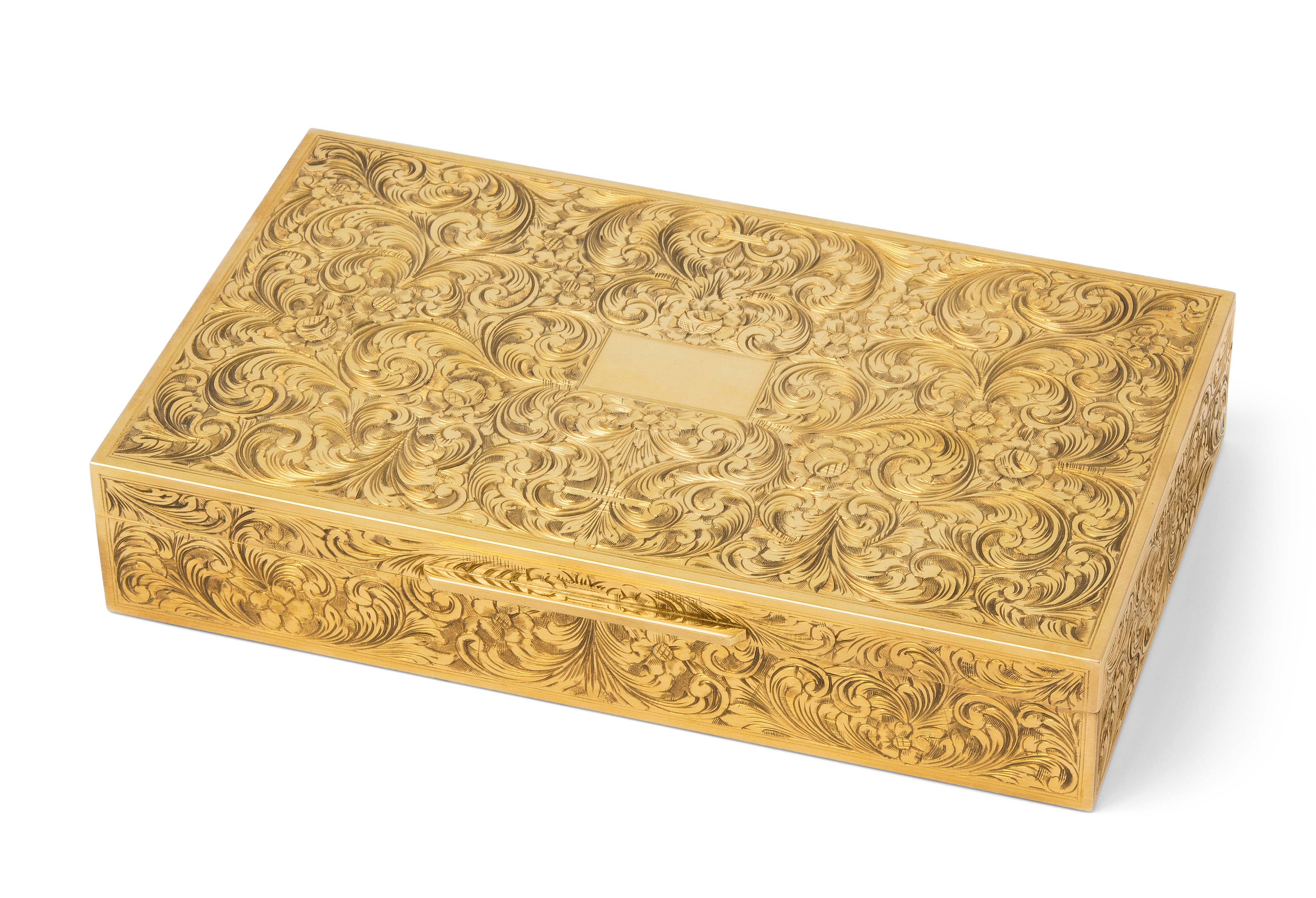 Italien, nach 1935. 18K-Gold. Rechteckige Form mit scharniertem Deckel. Allseitig gravierter Akanthusblattdekor, begleitet von Blüten, Schauseite mit blanker Kartusche. Garantiemarke, Feingehalt 750, 17x10x3,2, cm, ca. 540 g.