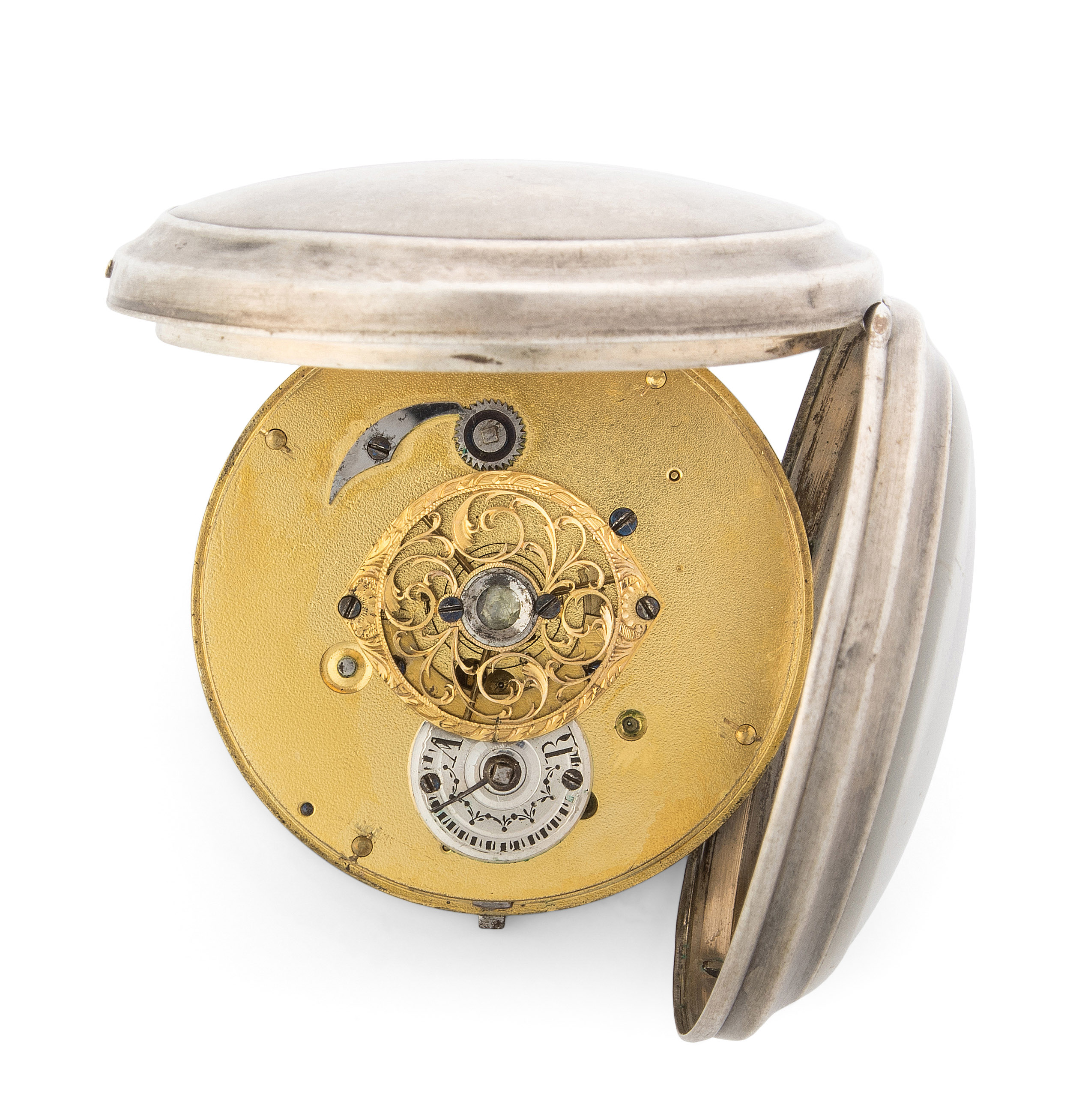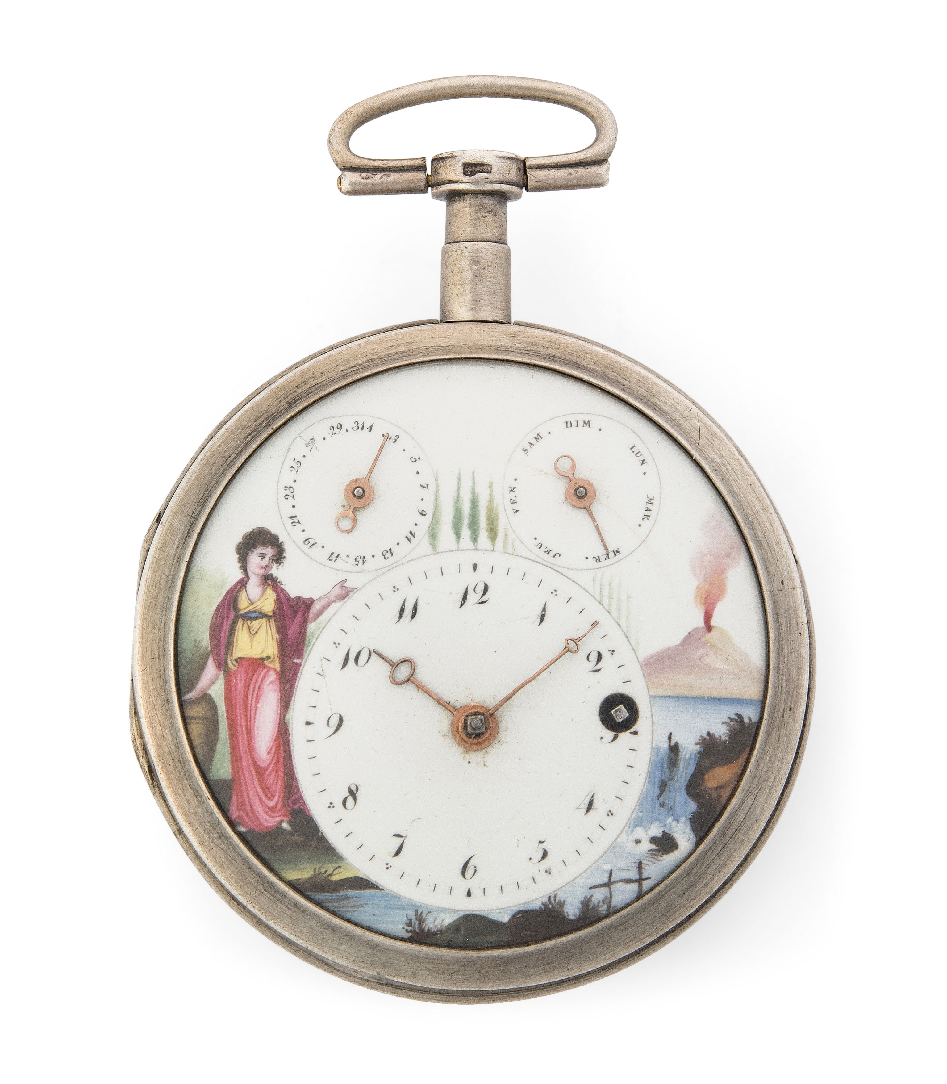 Runde, mechanische Spindeltaschenuhr um 1835 mit Schlüsselaufzug in Silbergehäuse. Fein gearbeitetes Messing-Uhrwerk, Kette, Schnecke, und grosse Unruhe unter durchbrochenem, verzierten Coq, D 55 mm. Weisses Emailzifferblatt mit Emailmalerei, Zifferblatt mit schwarzen, arabischen Stundenzahlen und Indizes, goldfarbene Breguet-Zeiger, kleines Datumzifferblatt und kleines Tageszifferblatt, Bügel bei 12 Uhr. Gebrauchsspuren. Schlüssel beigegeben.