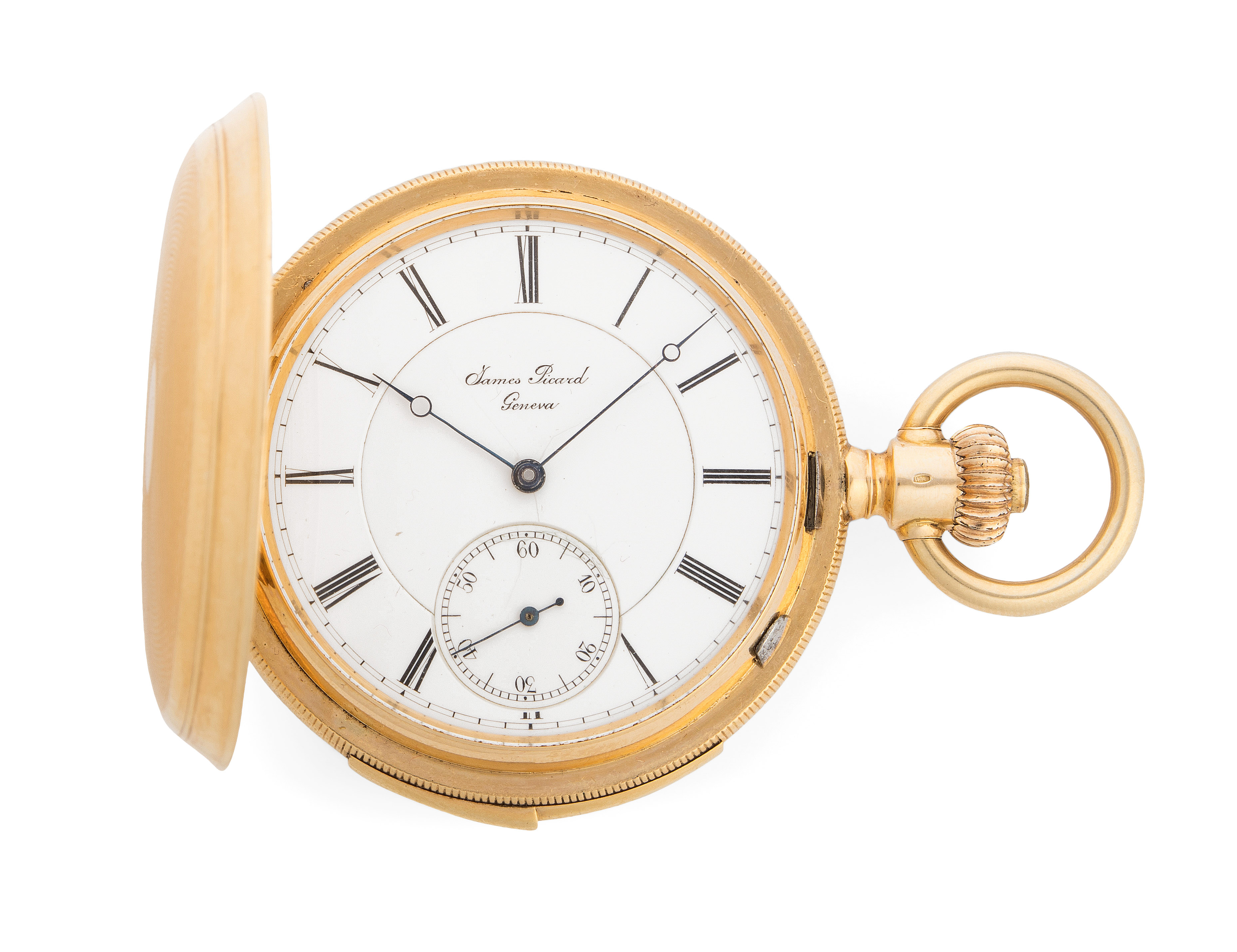 Runde, mechanische Herrensavonnette um 1895 mit Handaufzug in 750 Gelbgoldgehäuse ca. 70 g. Rücken- und Frontdeckel guillochiert, später eingebautes Sichtglas auf das Werk, Werkdeckel graviert, Referenznummer 4797, D 51 mm. Weisses Emailzifferblatt mit schwarzen, römischen Stundenzahlen, Minutenindizes. Schwarze Breguet-Zeiger, kleine Sekundenanzeige bei 6 Uhr. Krone, Bügel und Drücker für den Frontdeckel bei 3 Uhr, Schieber für die Minutenrepetition bei 6 Uhr, Schieber für die Zeiteinstellung auf der Lünette. Gebrauchsspuren.