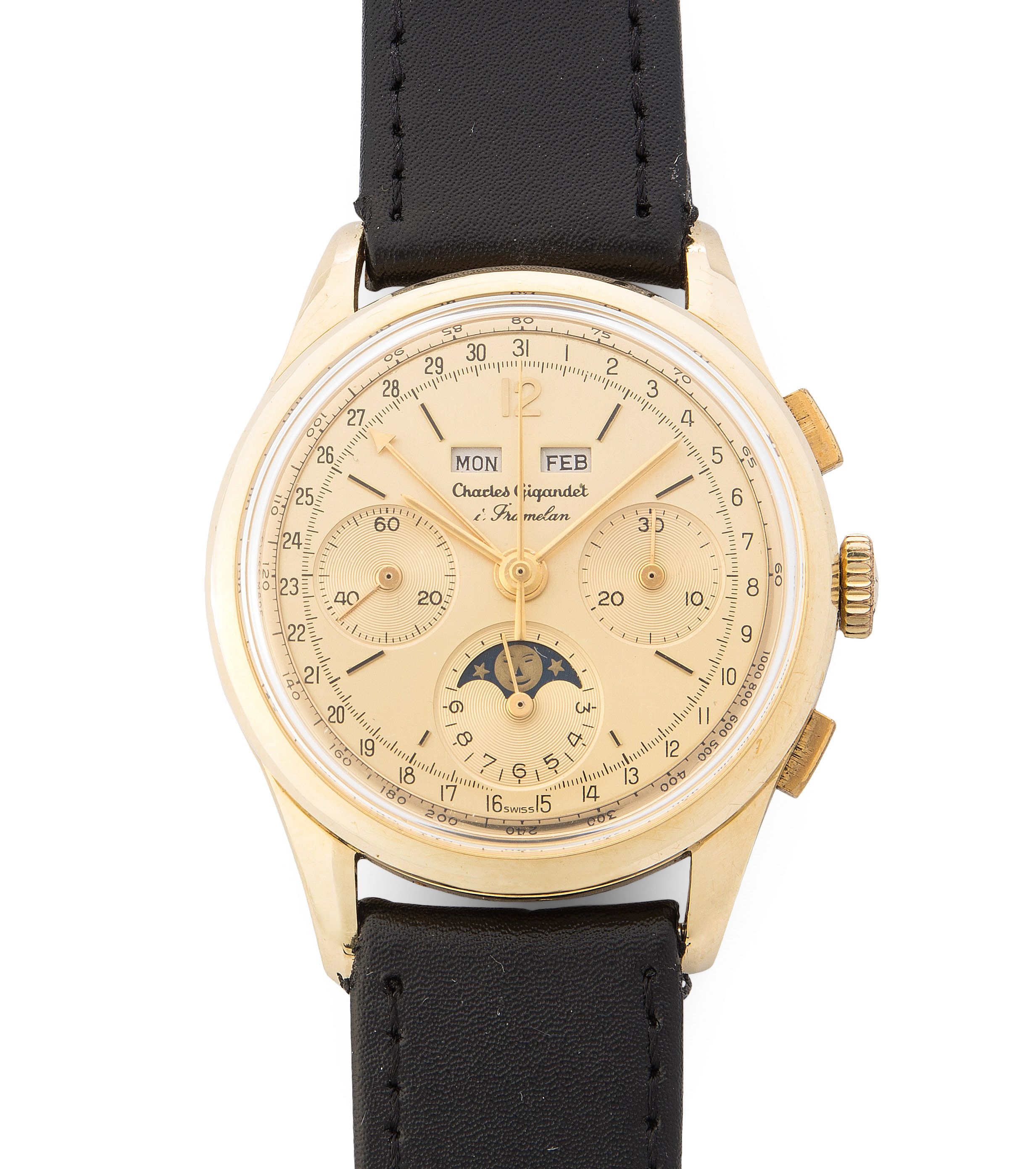 Runder, mechanischer Schaltradchronograph 60er Jahre mit Handaufzug in 750 Gelbgoldgehäuse ca. 25 g. Boden gedrückt, Valjouxwerk, Kaliber 730, Referenznummer 81806, D 38 mm. Goldfarbenes Zifferblatt mit aufgesetzten Stundenindizes und goldfarbener 12, schwarze Minuten-, Sekundenindizes, Datumsring. Goldfarbene Stab-Zeiger, zentraler Chronographen- und Datumszeiger, kleine Sekundenanzeige bei 9 Uhr, kleine 30 Minutenanzeige bei 3 Uhr, kleine 12 Stundenanzeige mit Mondphase bei 6 Uhr, Tages-, und Monatsfenster bei 12 Uhr. Krone bei 3 Uhr, Chronographendrücker bei 2 und 4 Uhr. Schwarzes Lederarmband mit Dornschliesse. Gebrauchsspuren.