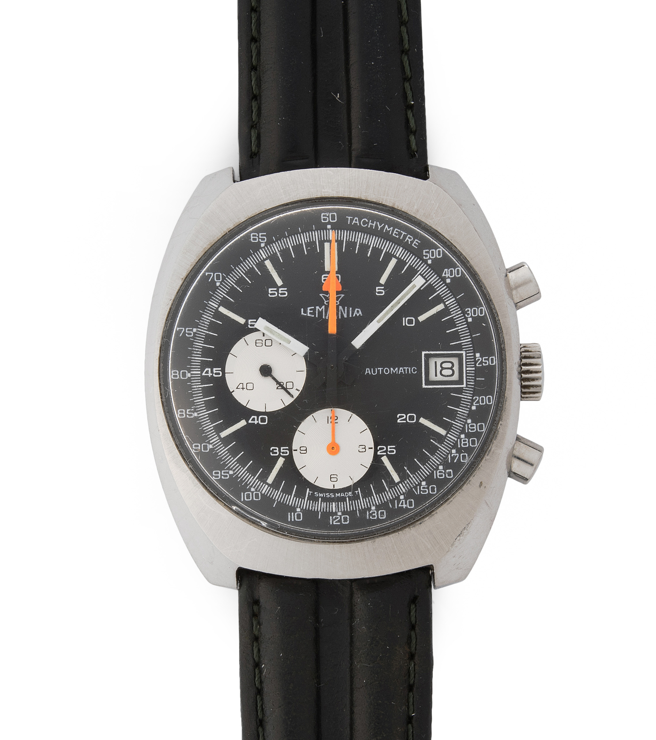 Runder, automatischer Herrenchronograph 70er Jahre in tonneauförmigem Stahlgehäuse. Boden verschraubt, Werknummer 3329607, Kaliber 1341, Referenznummer 9803, D 38 mm. Schwarzes Zifferblatt mit weissen Stundenindizes, Minuten-, Sekundenindizes, Tachymeterskala. Weisse Stab-Zeiger, zentraler 60 Minuten- und Chronographenzeiger, kleine Sekundenanzeige bei 9 Uhr, kleine 12 Stundenanzeige bei 6 Uhr. Datumsfenster und Krone bei 3 Uhr, Chronographendrücker bei 2 und 4 Uhr. Schwarzes Lederarmband mit Dornschliesse. Gebrauchsspuren.