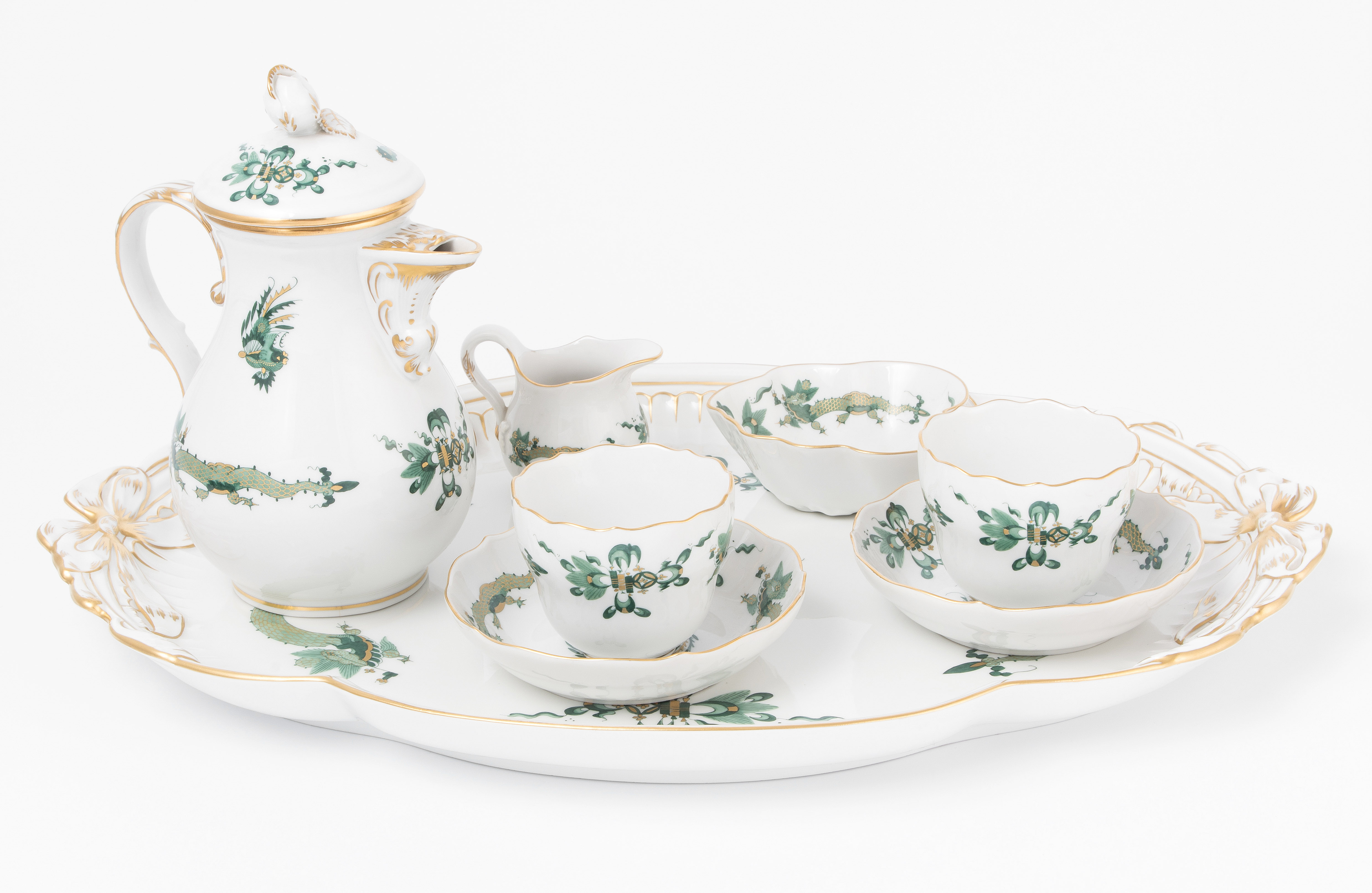20.Jh. Porzellan, Dekor "Hofdrache in Grün und Gold", 1. Wahl. Bestand: 1 Mokkakanne, 1 Cremier, 1 Zuckerschälchen, 2 Mokkatassen mit U'tassen, 1 geschweiftes Tablett.