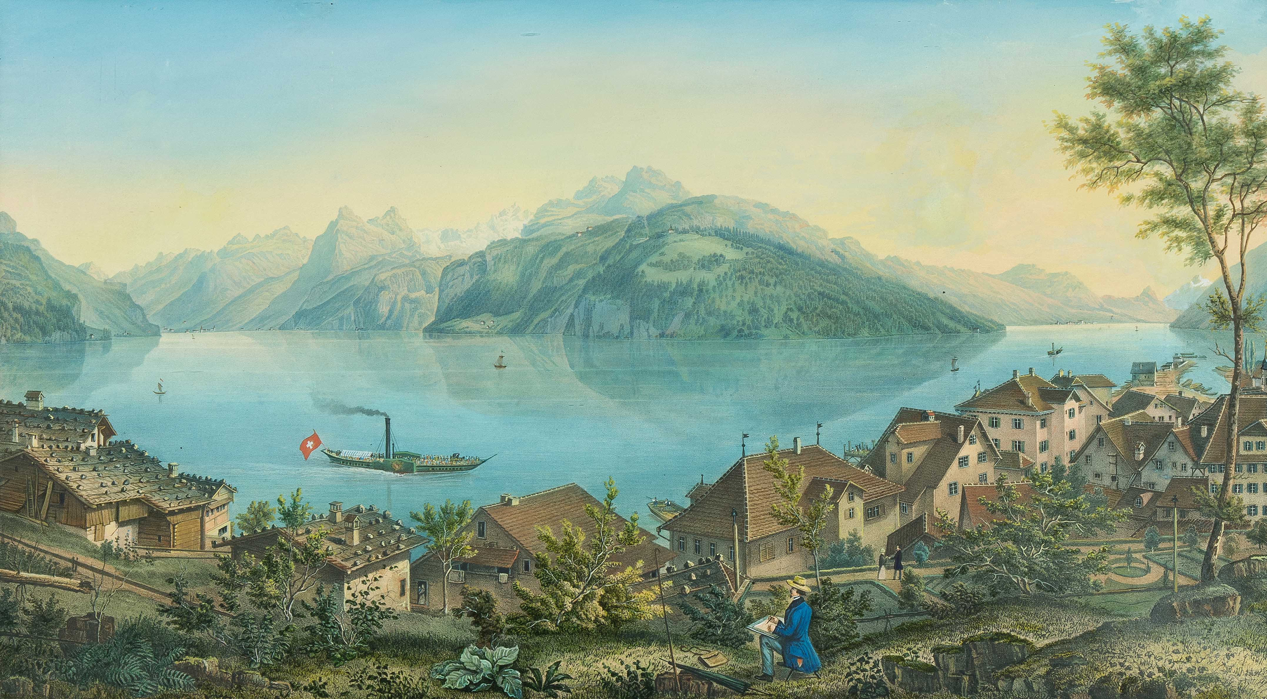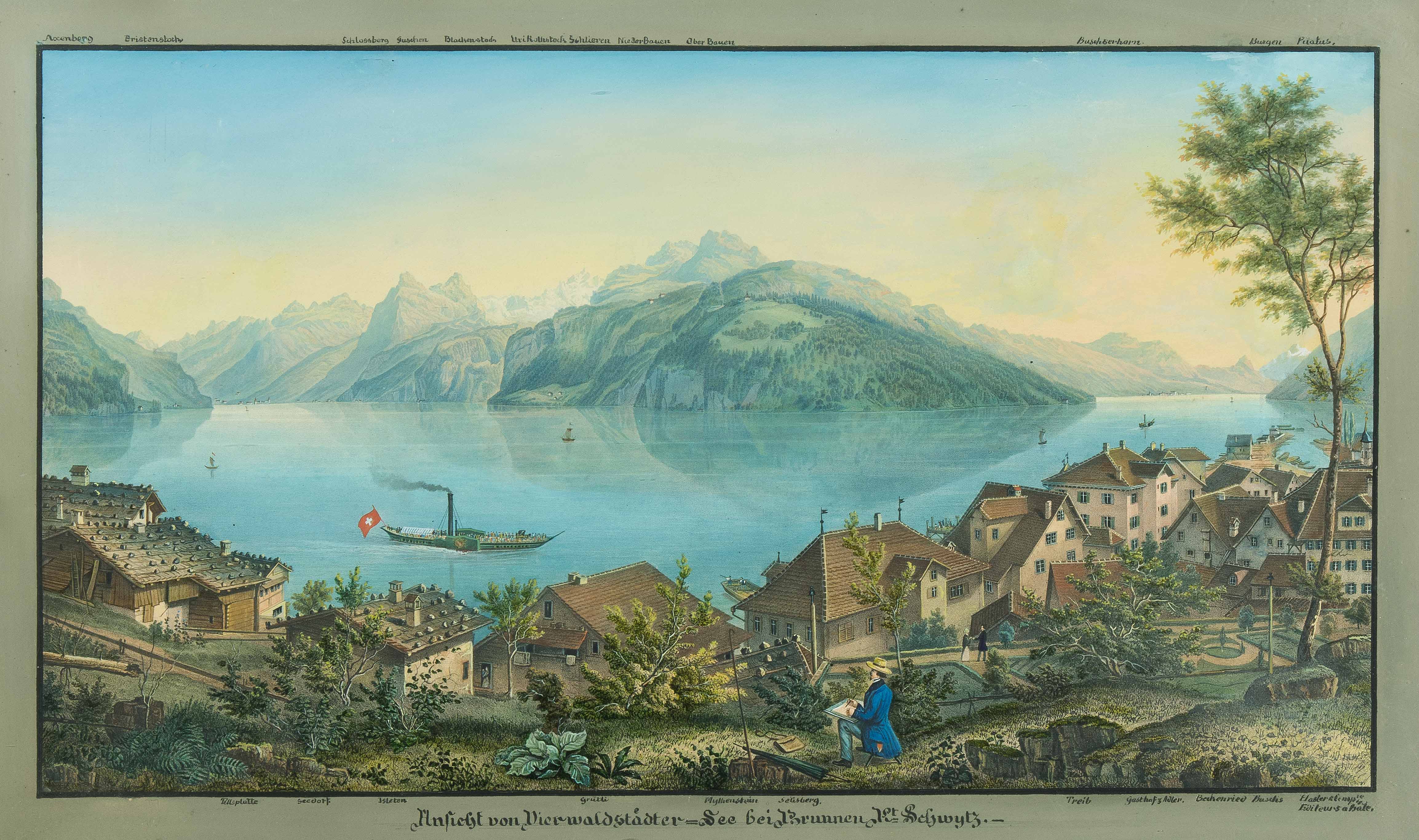 "Ansicht von Vierwaldstädter=See bei Brunnen Kt. Schwytz". Kol. Lithographie, um 1850. Hrsg. v. Hasler & Cie., Basel. 33,3x60,8 cm. Gerahmt. -Allseitig bis auf den Bildrand beschnitten und alt auf grau gouachierte und beschriftete Unterlage aufgezogen. Im rechten, äusseren Teil des Himmels leicht berieben und retuschiert.