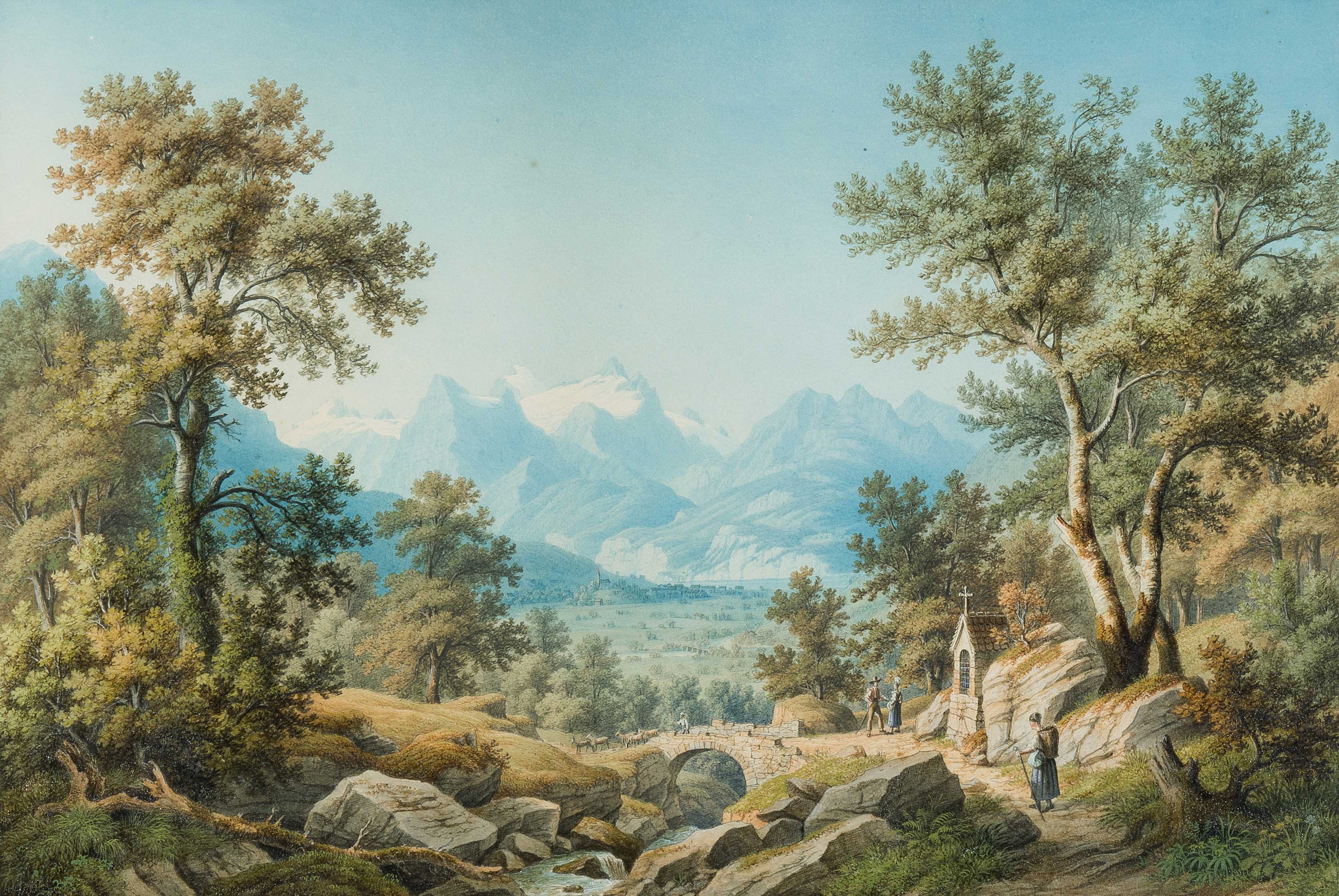 "Urirotstock von Schwitz aus gesehen". Aquarell. Unten rechts die Signaturreste, verso bezeichnet. 29,8x44,3 cm. Gerahmt. - Grau aquarellierter Rand. Auf Papier mit WZ "J. Whatman". - Minimal stockfleckig.