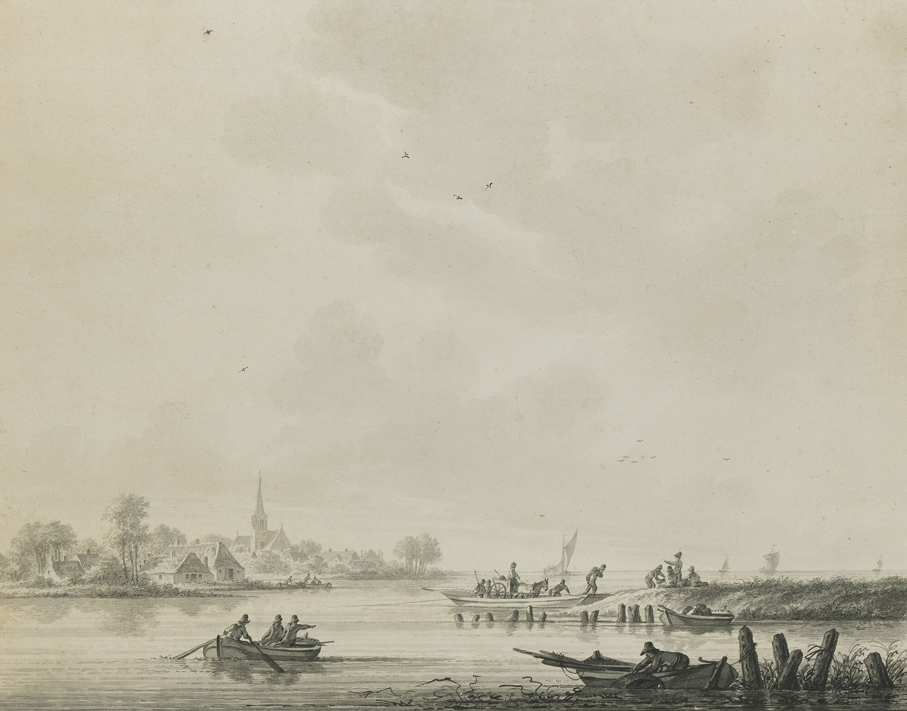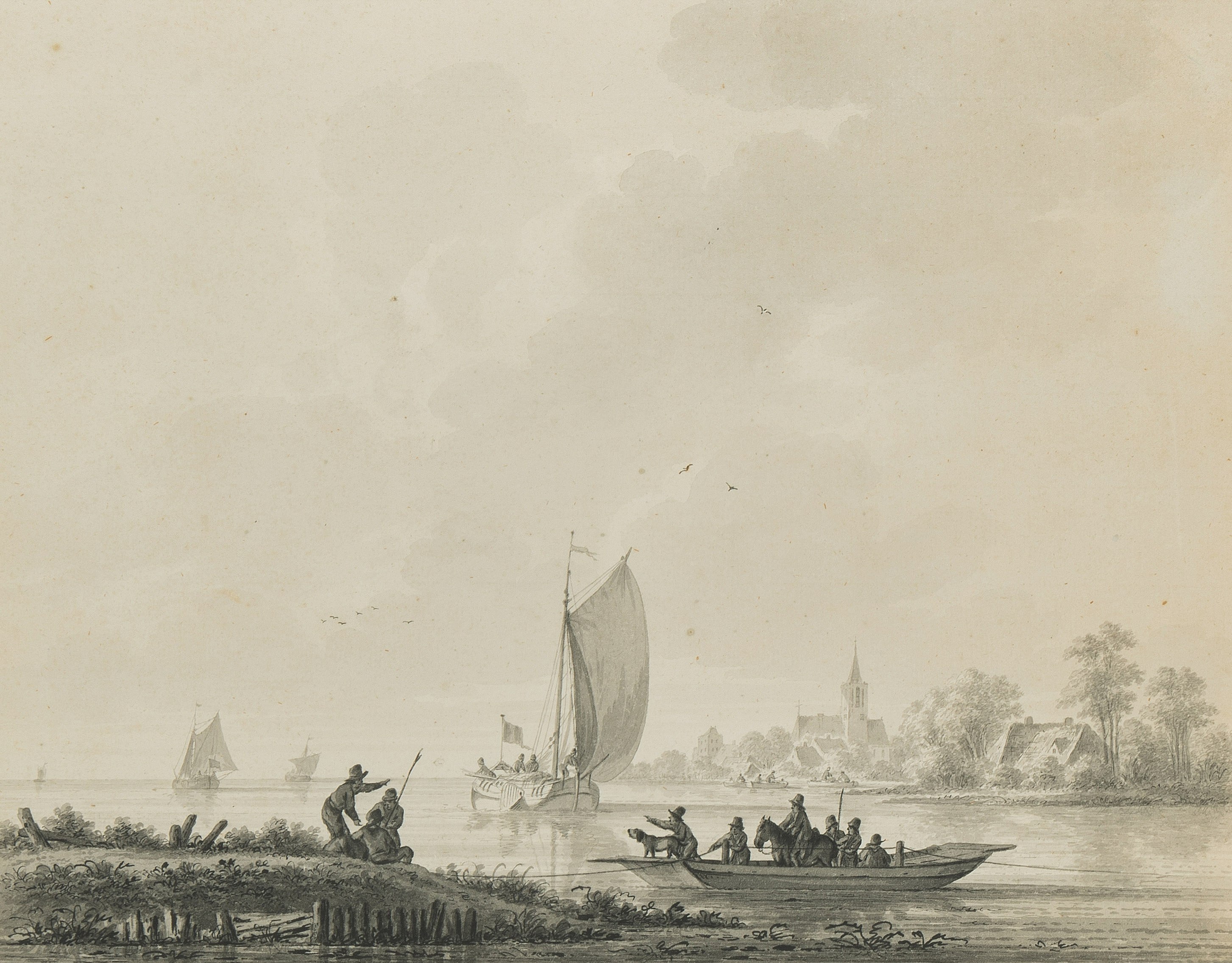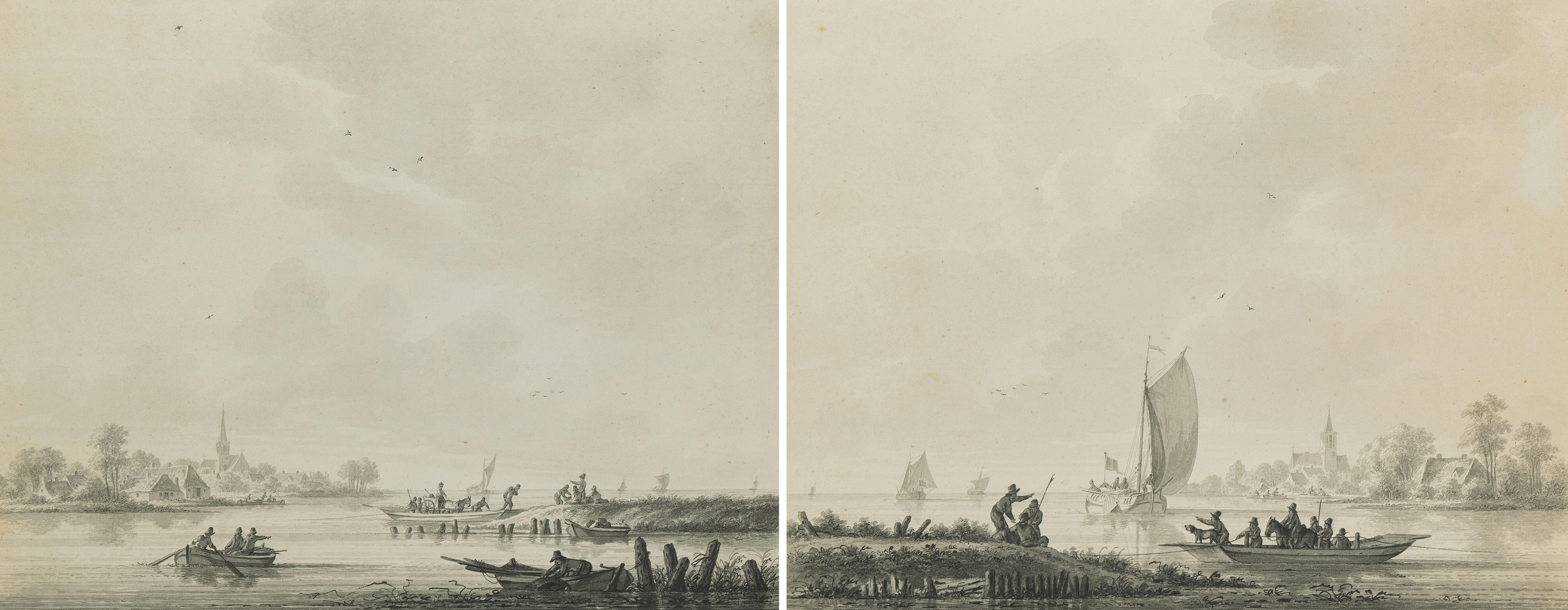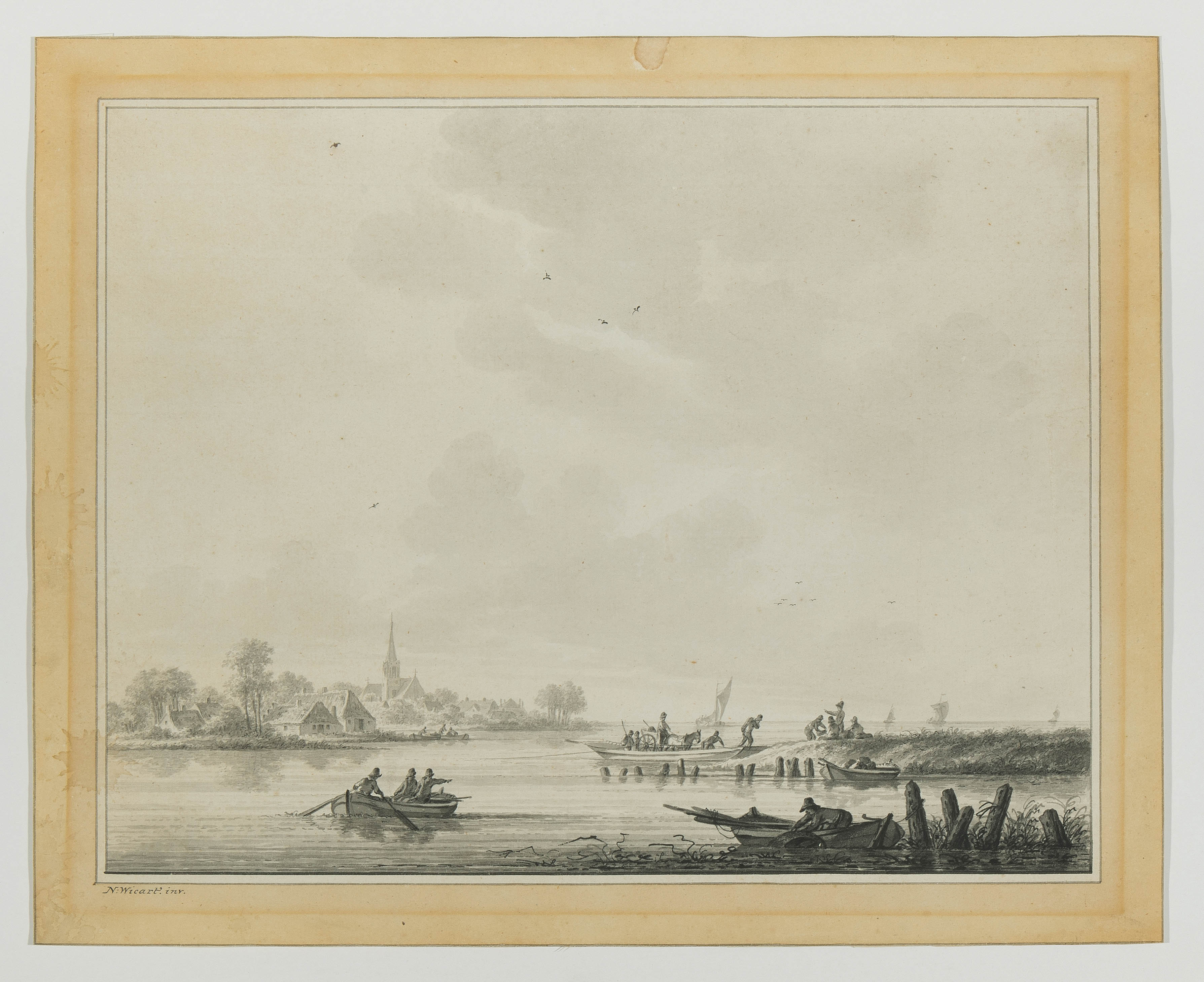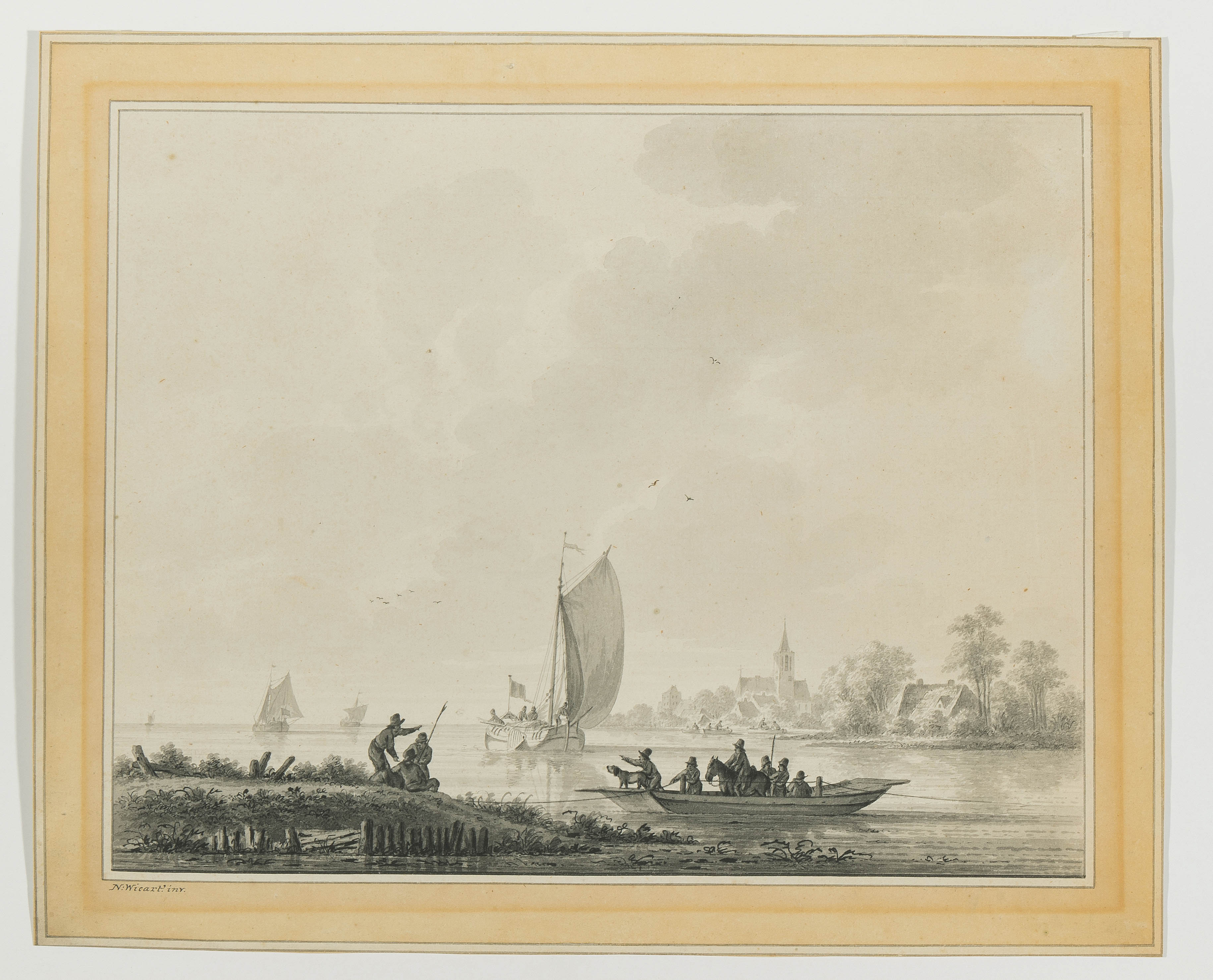 Gegenstücke. Seelandschaften mit Fischern. Grau lavierte Feder- und Pinselzeichnungen. Beide unten links (auf orig. Unterlage) signiert "Wicart inv.". Je ca. 30x38 cm. - Beide in der von Wicart oft angewandten Einfassung mit breitem, gelb getöntem Rand. Beide Bll. mit Lichtrand, sonst gut erhalten.