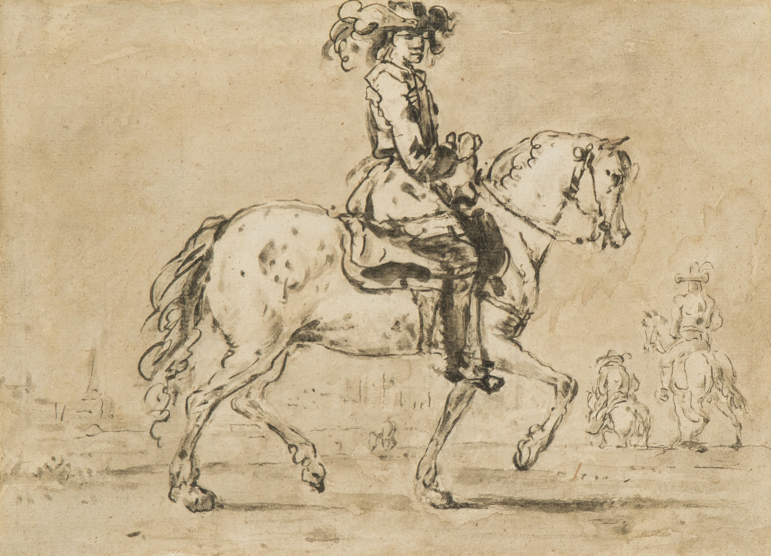 Kavalier zu Pferde. Feder und Pinselzeichnung in Braun. 18,3x25,2 cm. Gerahmt.