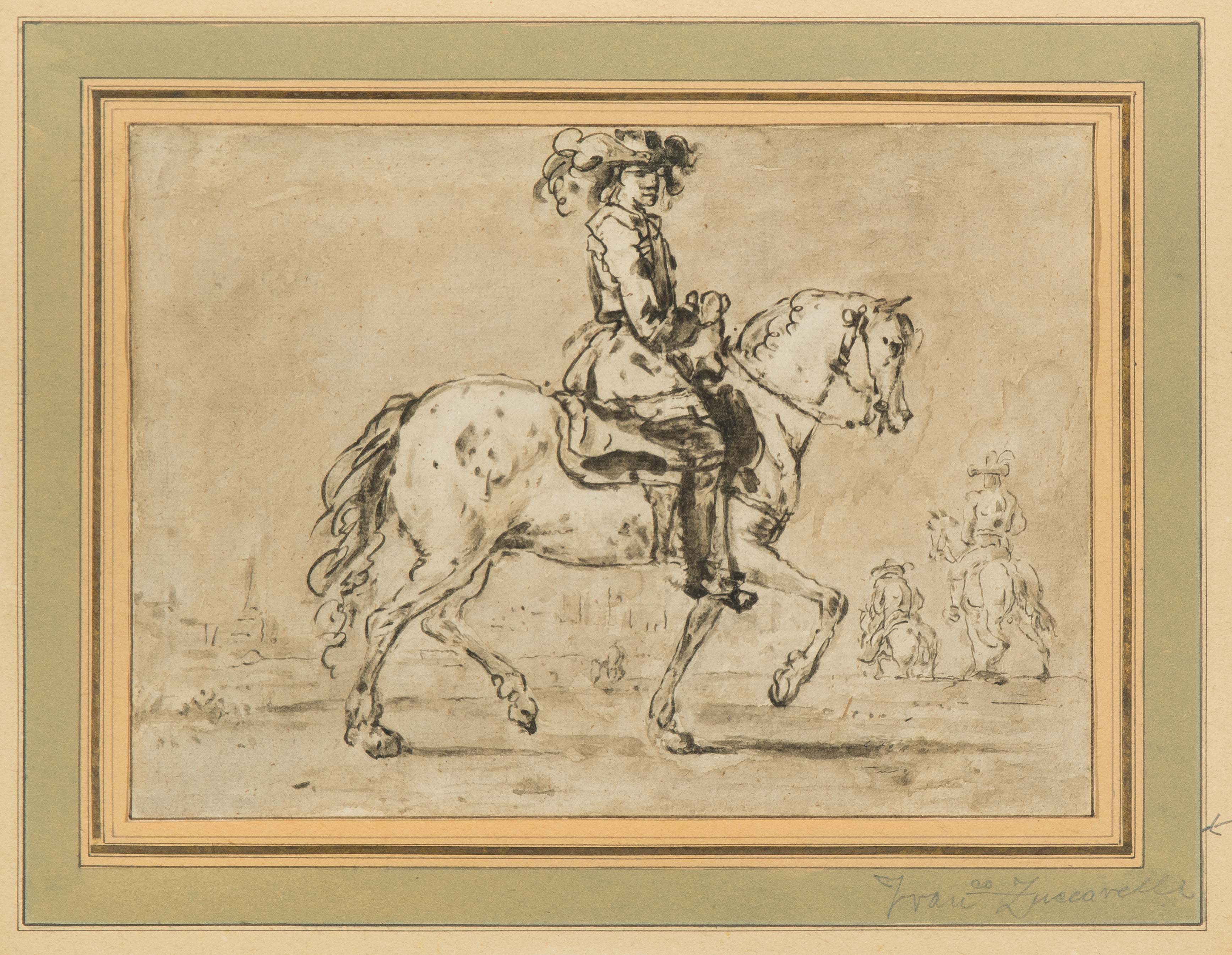 Die (in der Folge nicht unwidersprochene) Zuschreibung an Francesco Zuccharelli wurde 1959 von Hermann Voss im Zusammenhang mit Ankauf des Blattes durch Kurt Meissner vorgenommen, der das Reitermotiv dann sogar als Signet seiner Galerie verwendete.
