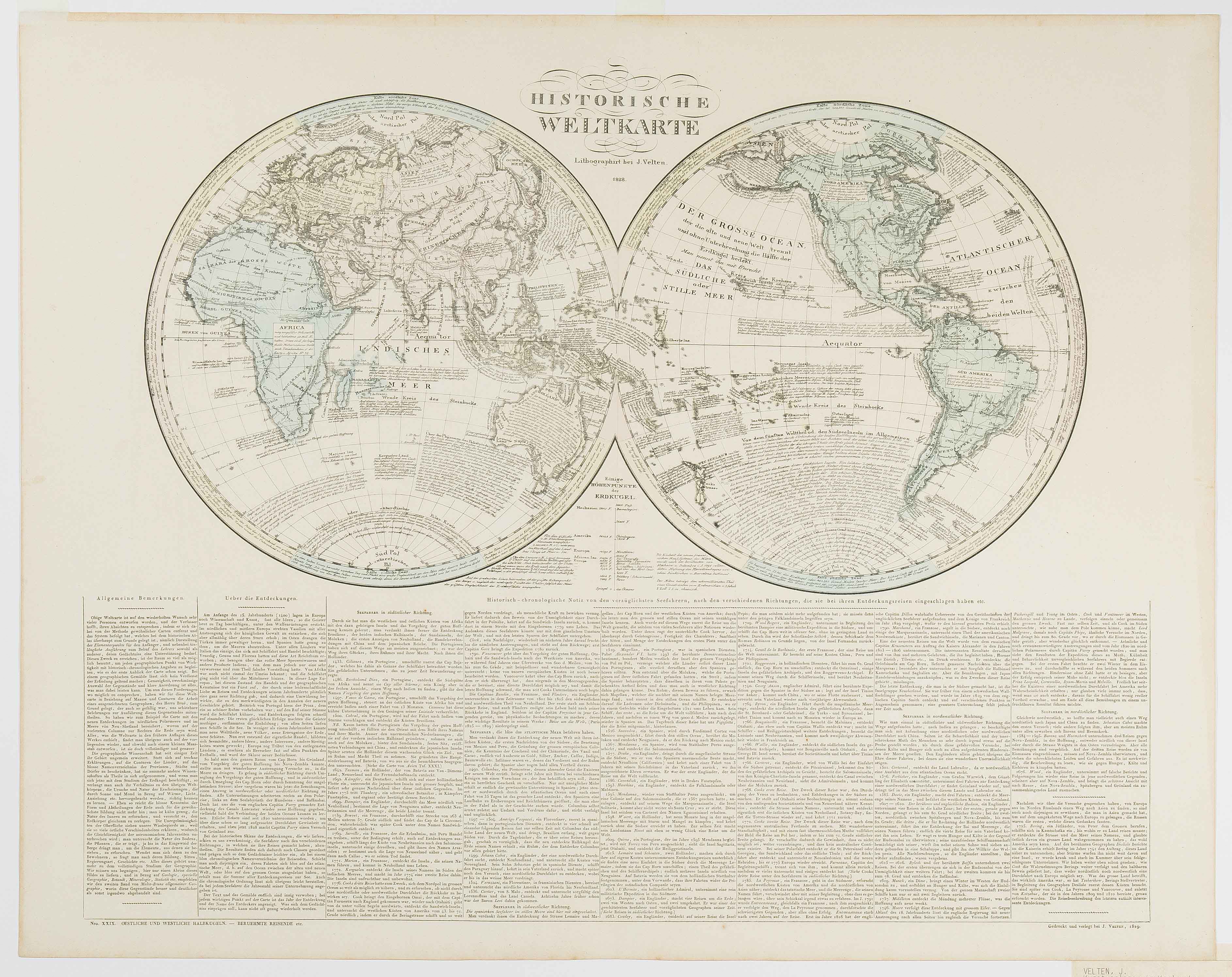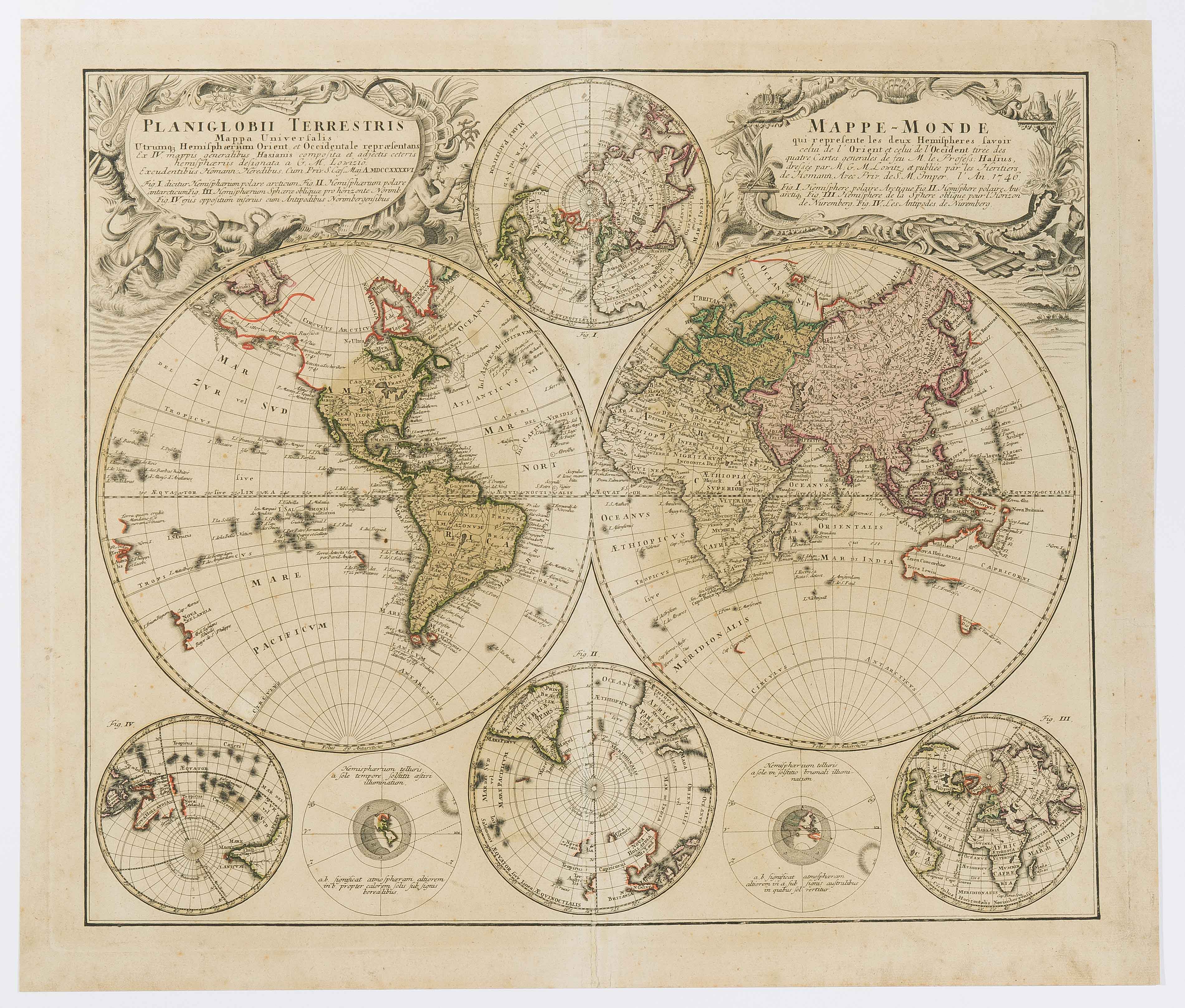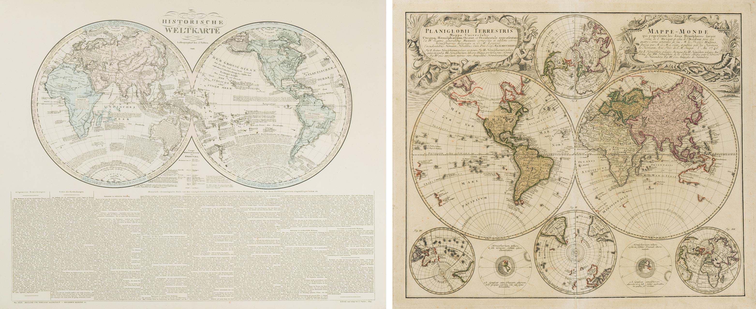 "PLANIGLOBII TERRESTRIS Mappa Universalis Utrumq' Hemisphaerium Orient et Occidentale repraesentans Ex IV mappis...Hasianis...designata a G. M. Lowizio". Kolor. Kupferstichkarte, hg. v. Homanns Erben, Nürnberg, 1746.46x54,5 cm. Mit 2 dekor. Kartuschen und 6 Nebenkarten (Arktis, Antarktis etc.). - Kl. Wurmgang am Bug unten hinterlegt, leicht fleckig. Beigelegt: Weltkarte in zwei Hemisphären. "HISTORISCHE WELTKARTE". Federlithographie v. J. Velten, 1826. 47,9x61,6 cm. Mit ausführl. Legende unten ("Historisch-chronologische Notiz von den vorzüglichsten Seefahrern").
