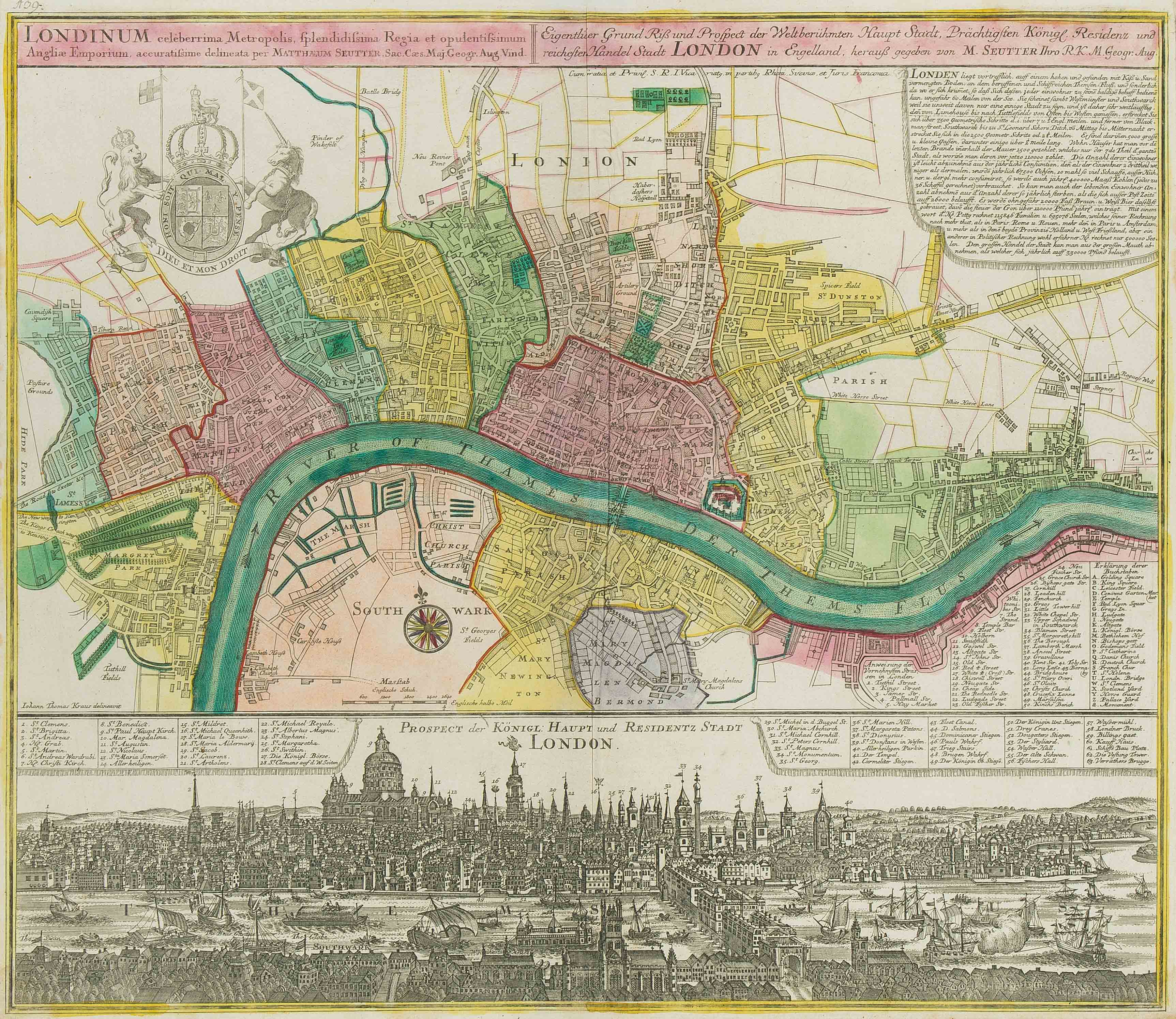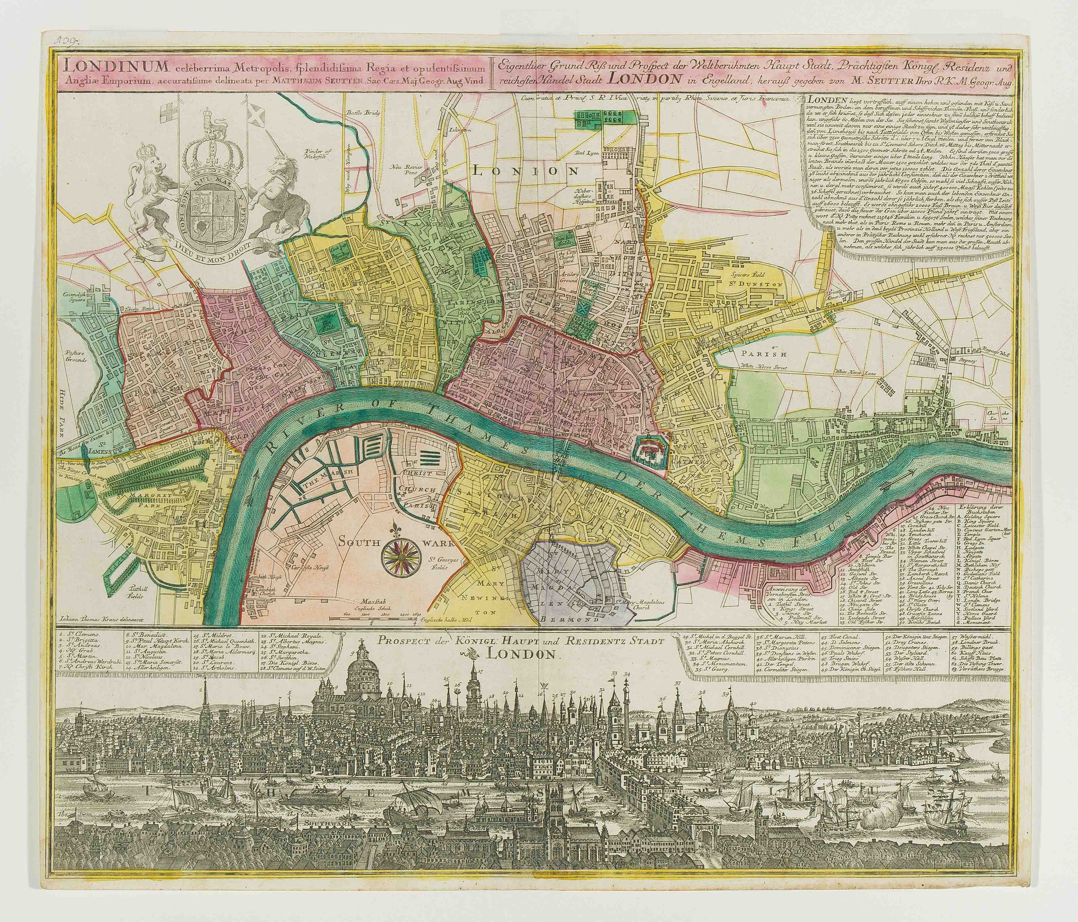 "Eigentlicher Grundriss und Prospect...der Weltberühmten Haupt Stad...LONDON". Kolor. Kupferst., hg. von Matth. Seutter, Augsburg, um 1730. 49x57cm. Grundrissplan, darunter eine Panorama-Ansicht von London. - Allseitig beschnitten.