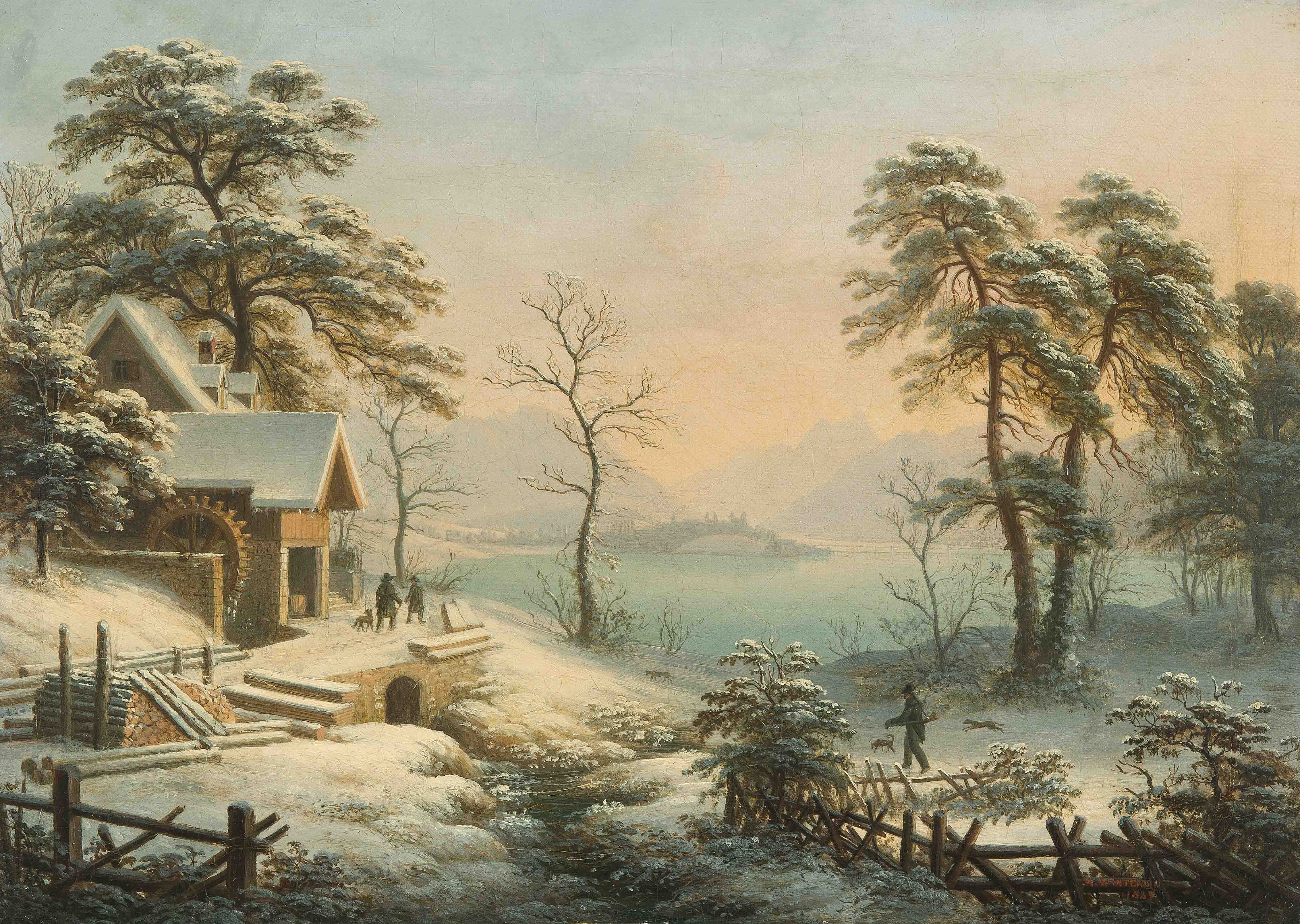 Winterliche Ansicht von Feldbach gegen Rapperswil, 1847. Öl auf Leinwand. Unten rechts signiert und datiert. 24,5x34,5 cm. - Doubliert.