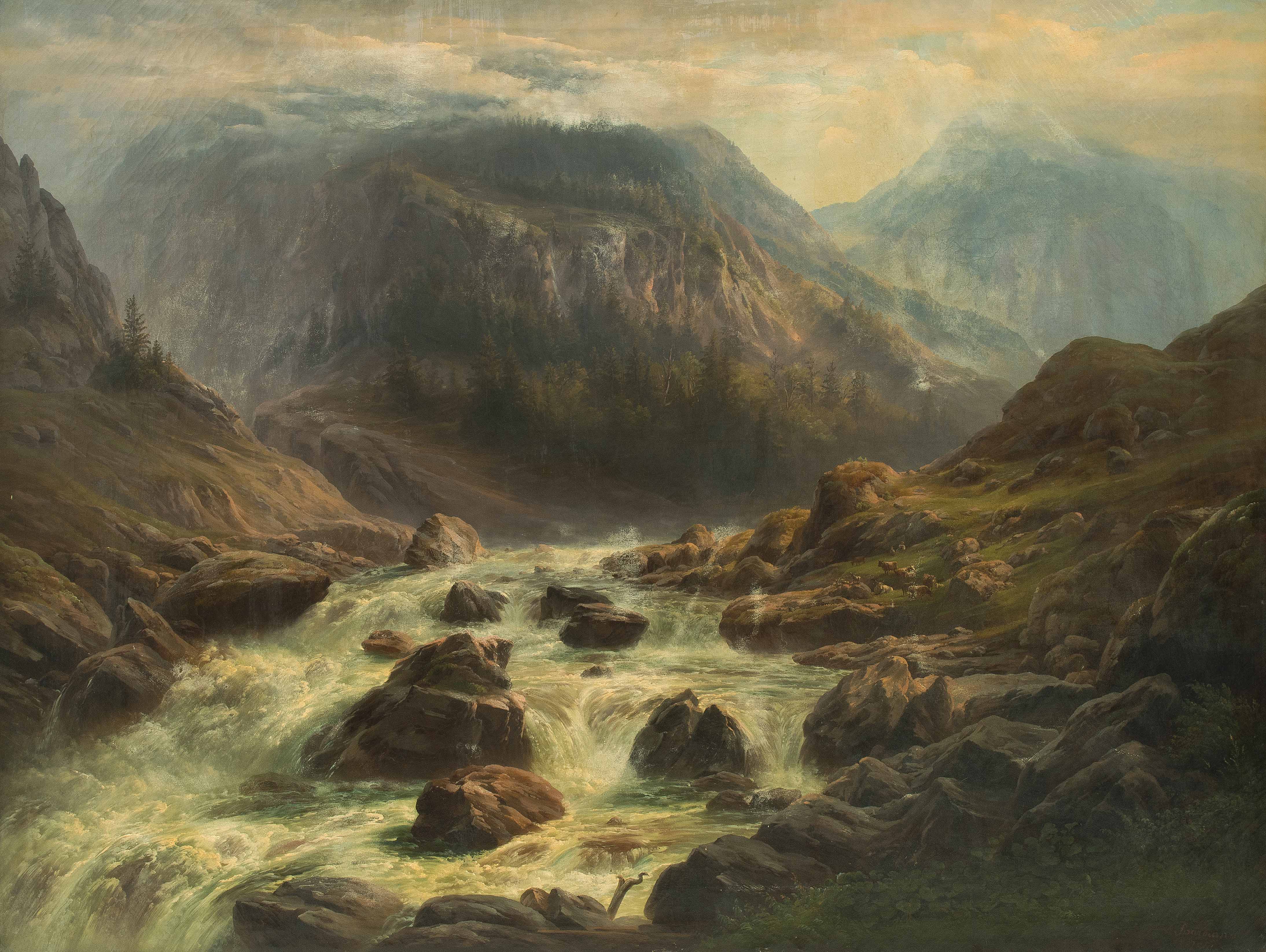 "Am St. Gotthard in der Schweiz, nach der Natur aufgenommen". 1861. Öl auf Leinwand. Unten rechts signiert und datiert. Auf altem Etikett betitelt. 131,5x174 cm.