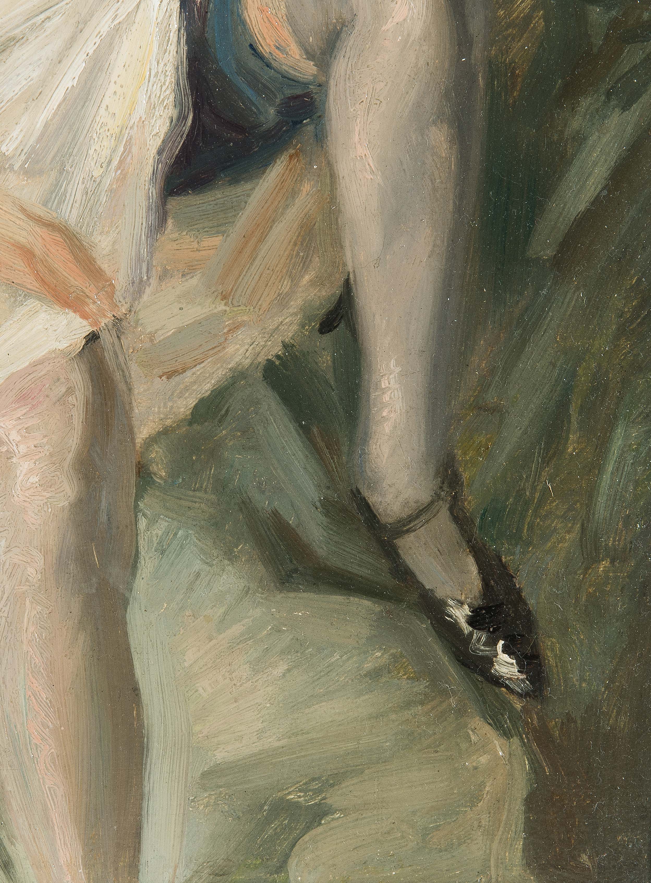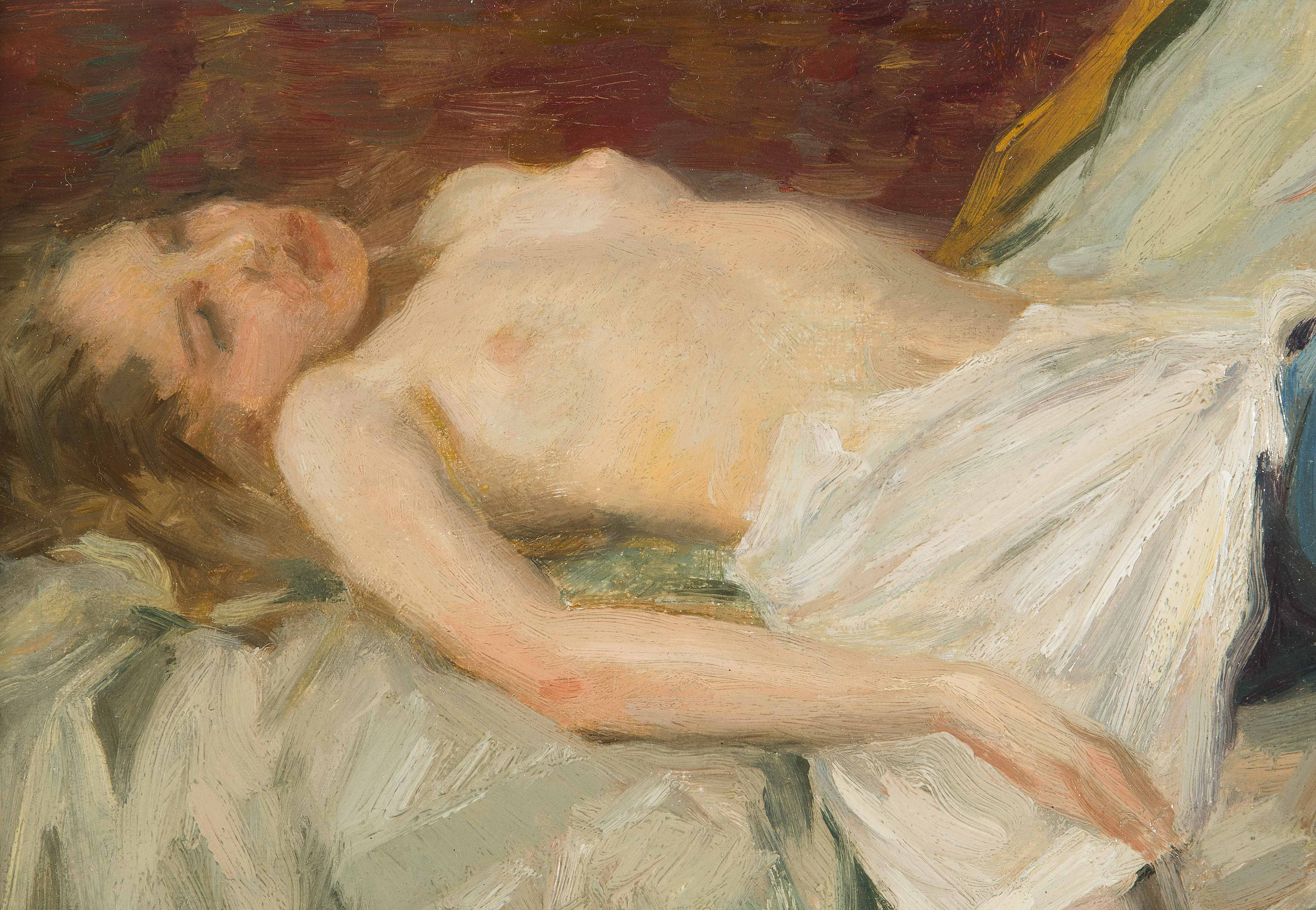 Liegender Akt. Öl auf Karton, verso Skizze eines Frauenkopfes, Tusche auf Kreidegrund. Unten links signiert. 26x31,3 cm.