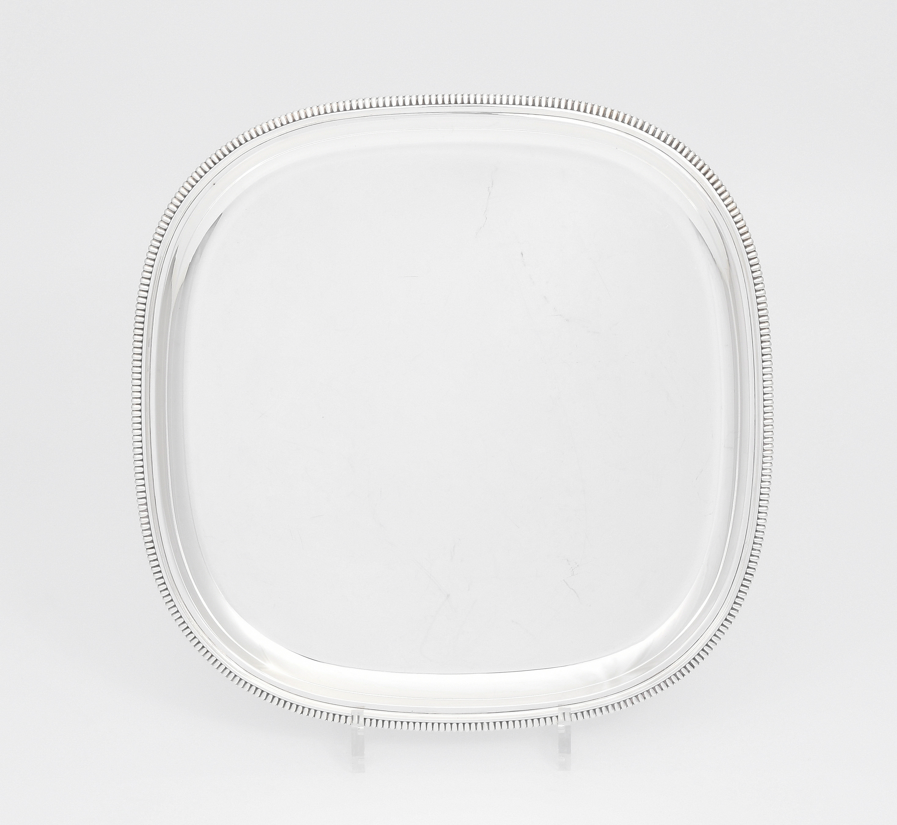 Schaffhausen, 20.Jh. Silber. Herstellermarke Jezler. Blanke, quadratische Form mit gerundeten Ecken und Rippenbordüre. Herstellermarke, Feingehalt 800. 30,2x30,2 cm, ca. 850 g.
