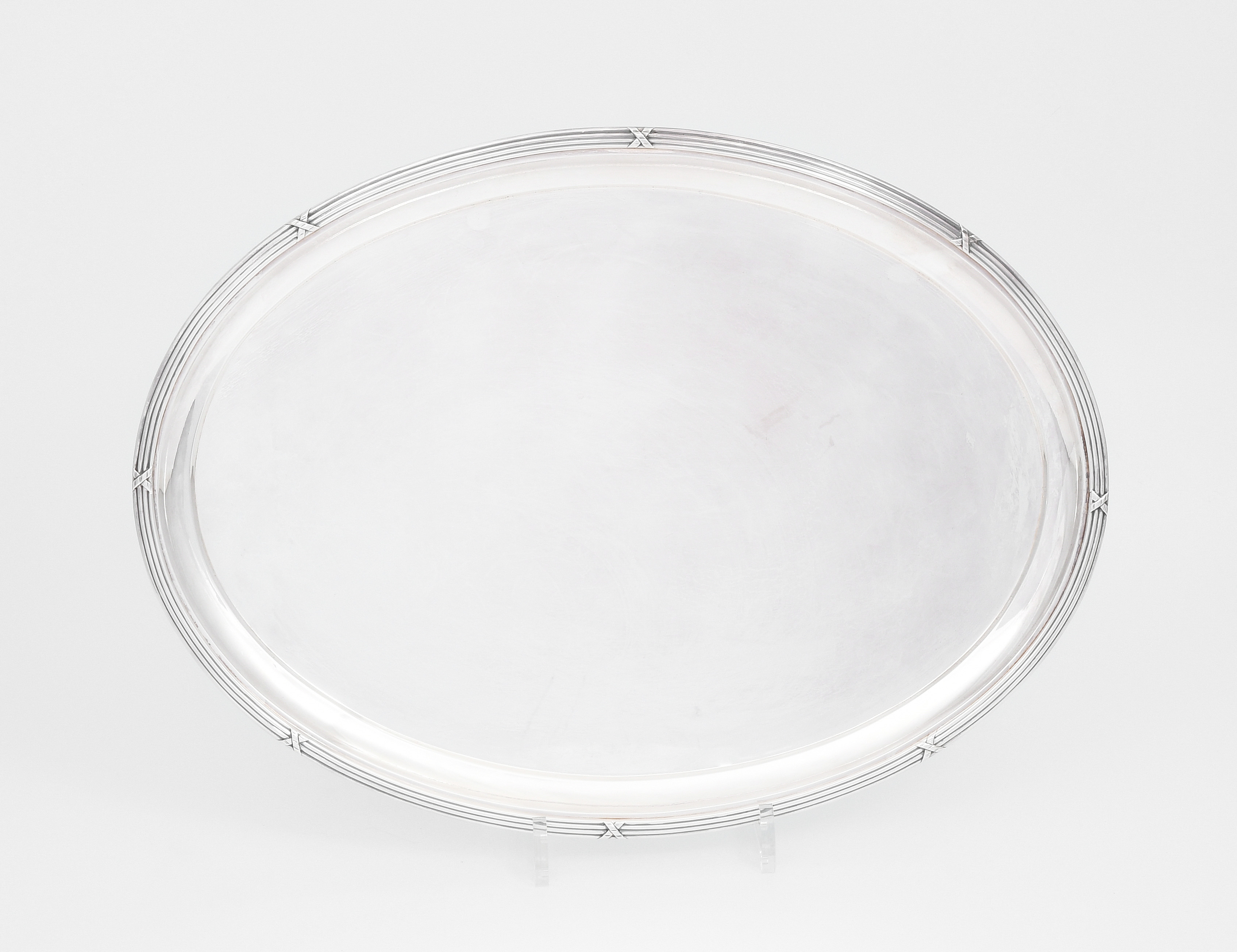 Schaffhausen, um 1900. Silber. Herstellermarke Jezler. Ovale Form mit Kreuzbandbordüre. Herstellermarke, Feingehalt 800. 42,5x31,4 cm, ca. 990 g.