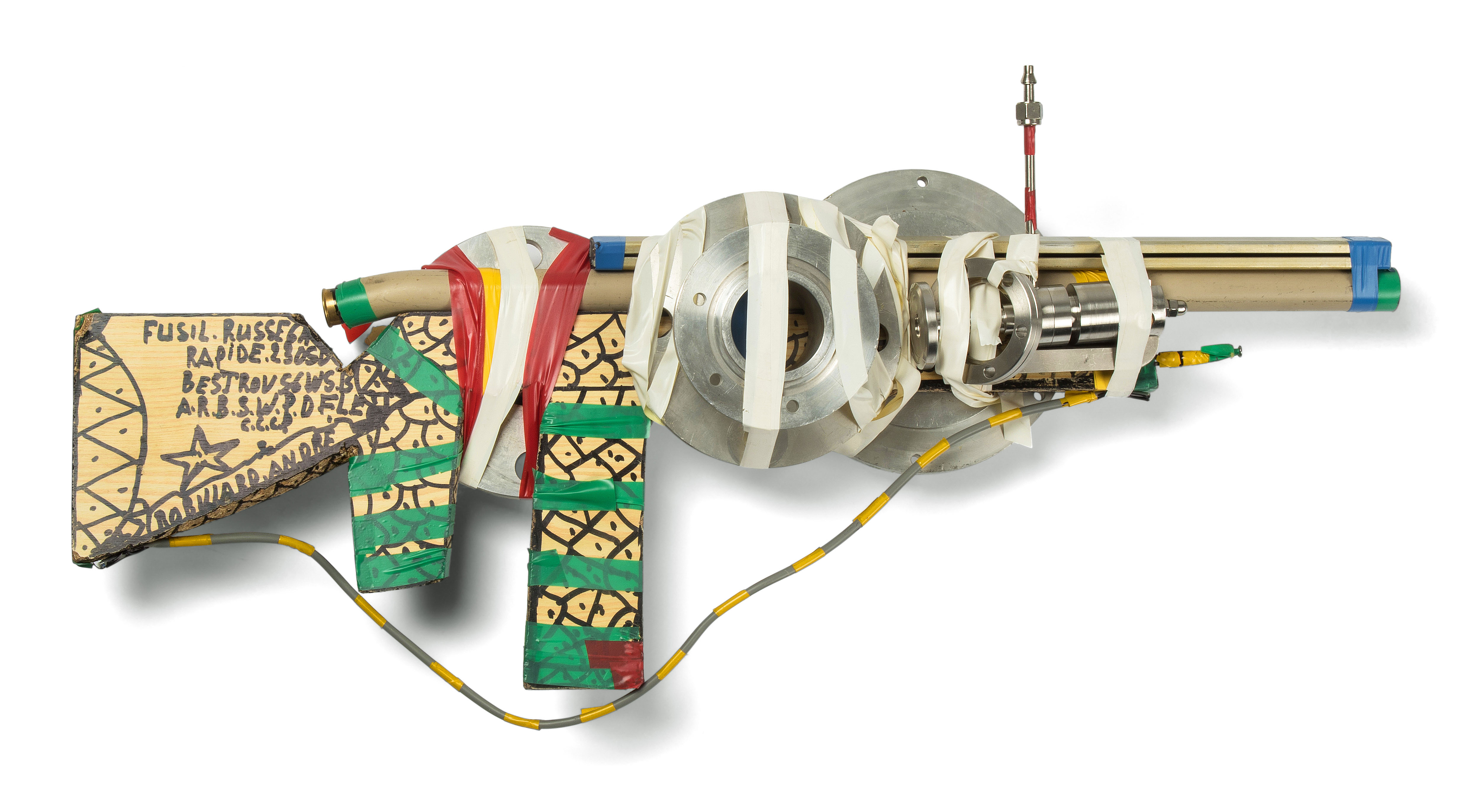 Gewehr. Sperrholz, Patrone, Metall, Kabel, Kleber, Nägel. Auf beiden Seiten des Griffs signiert und bezeichnet: FUSIL RUSSE 64 RAPIDE 230.8.B BESTROVS6W.S A.R.B.S.W.P.D.F C.C.C.P. L 75 cm. -Kleber löst sich teils (ein Metallteil bereits lose).