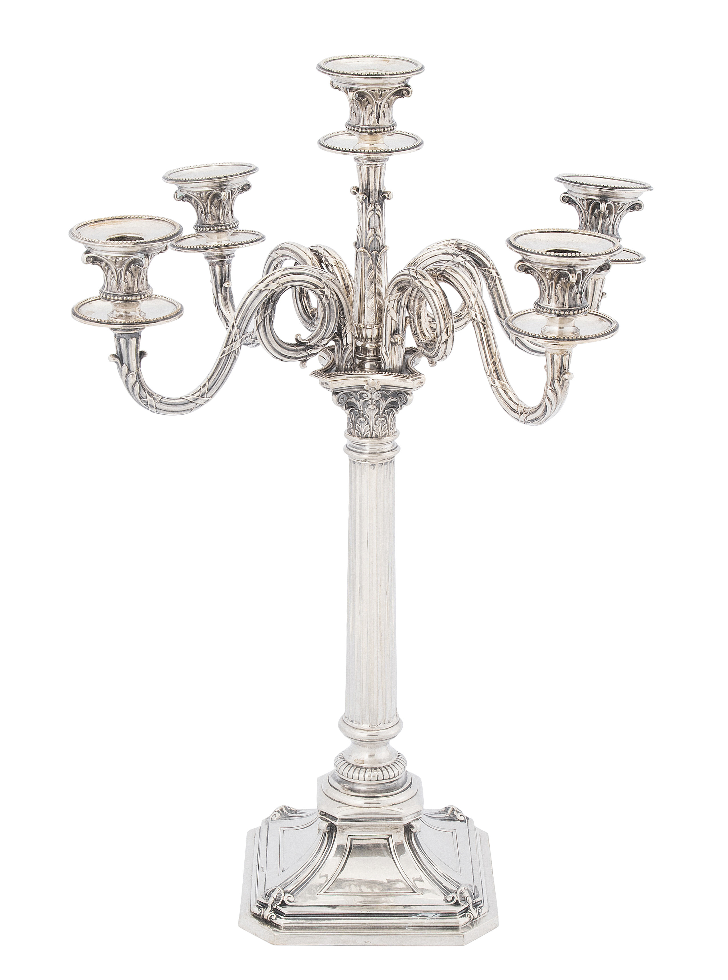 Deutschland, um 1900. Silber. Quadratischer, hochgezogener Fuss mit abgeschrägten Ecken, darüber kannellierter Säulenschaft mit geschwungenen Leuchterarmen, fünfflammig. Akanthusblattdekor. Halbmond/Krone, undeutliche Meistermarke, Feingehalt 800. H 60 cm, ca. 1820 g.