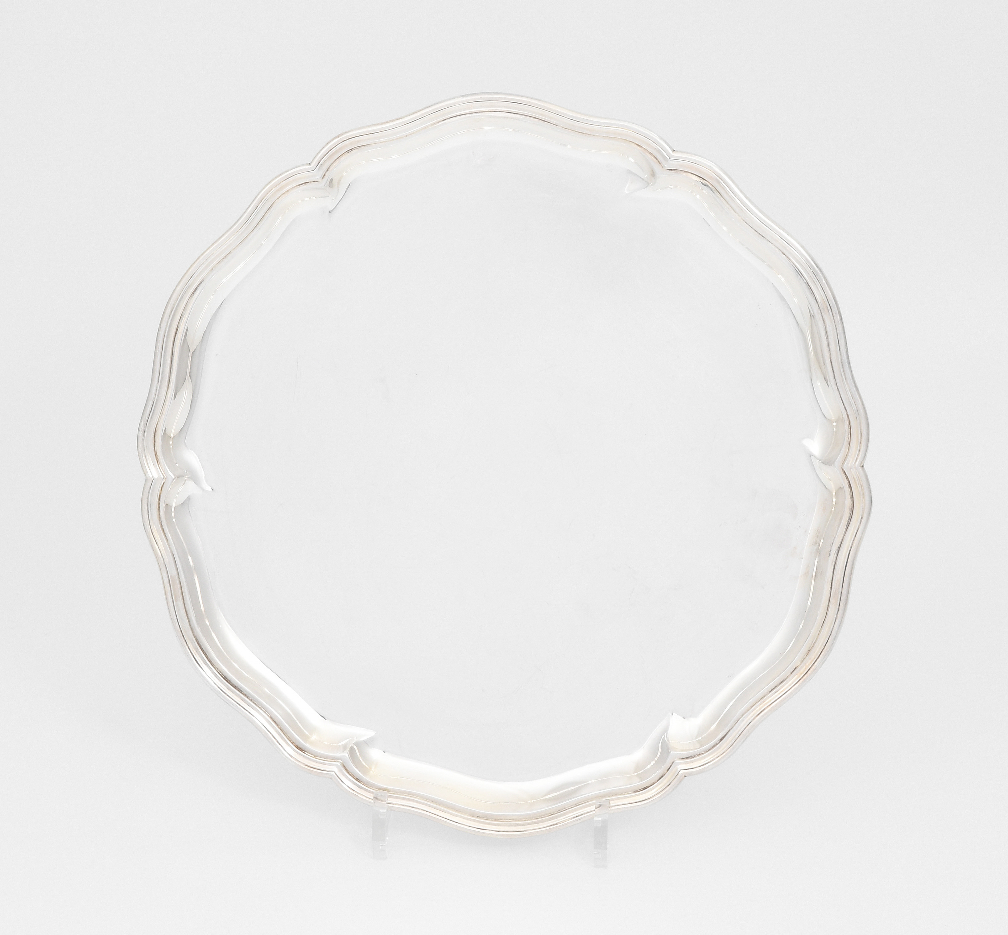 Bremen-Hemelingen, um 1900. Silber. Herstellermarke M.H. Wilkens & Söhne. Rundform mit fassoniertem, profiliertem Rand. Halbmond/Krone, Herstellermarke, Feingehalt 800. D 33 cm, ca. 730 g.
