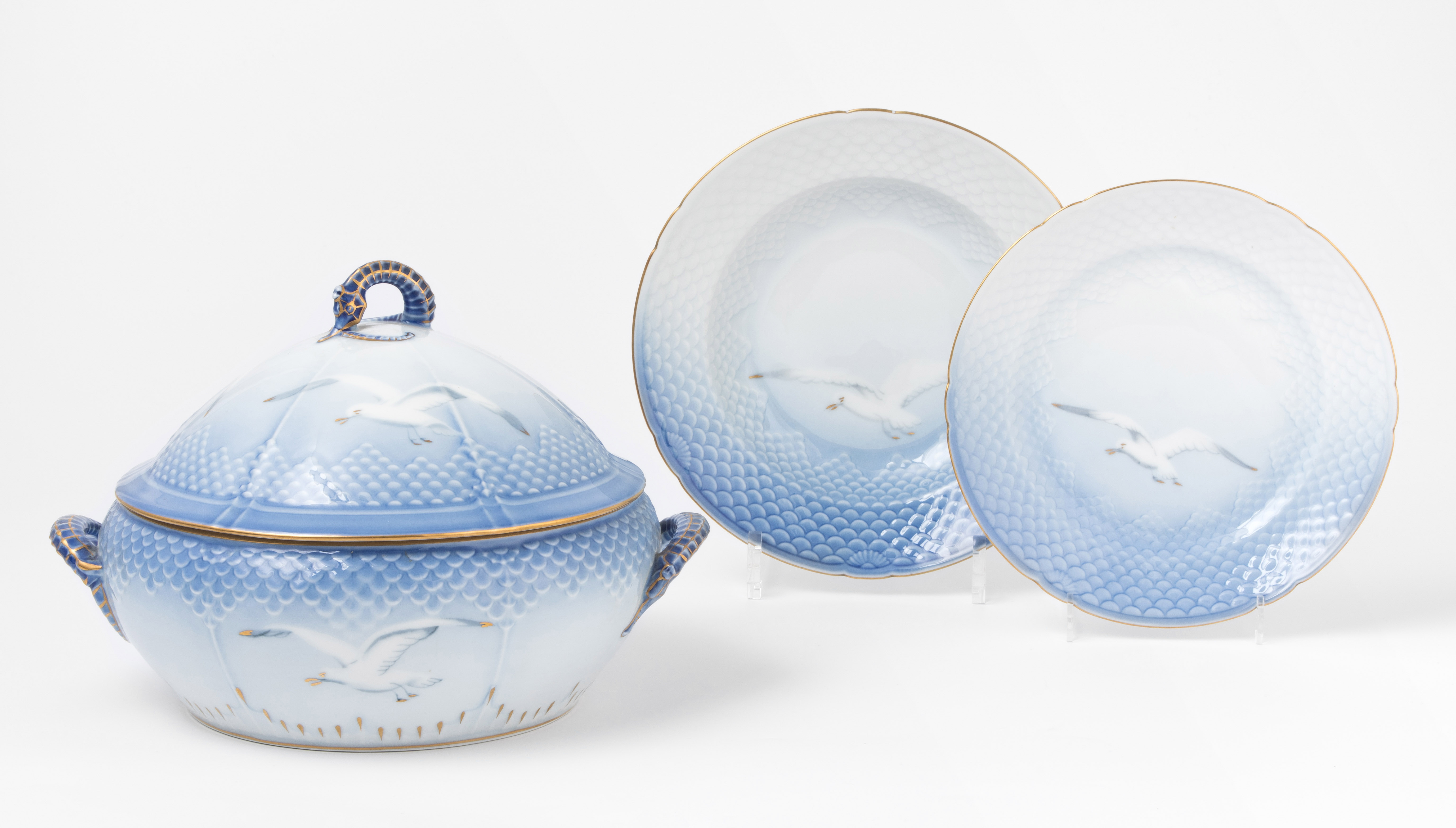 20.Jh. Kopenhagen. Porzellan, Dekor "Möwe Seagull mit Goldrand. Bestand: 6 Fleischteller (D 24,5 cm), 6 Suppenteller, 6 Dessertteller (D 19 cm), 1 Suppenterrine, 1 Saucière, 1 Henkelplatte, 2 Tellerchen, 2 kleine Tischvasen. Total 25 Teile.