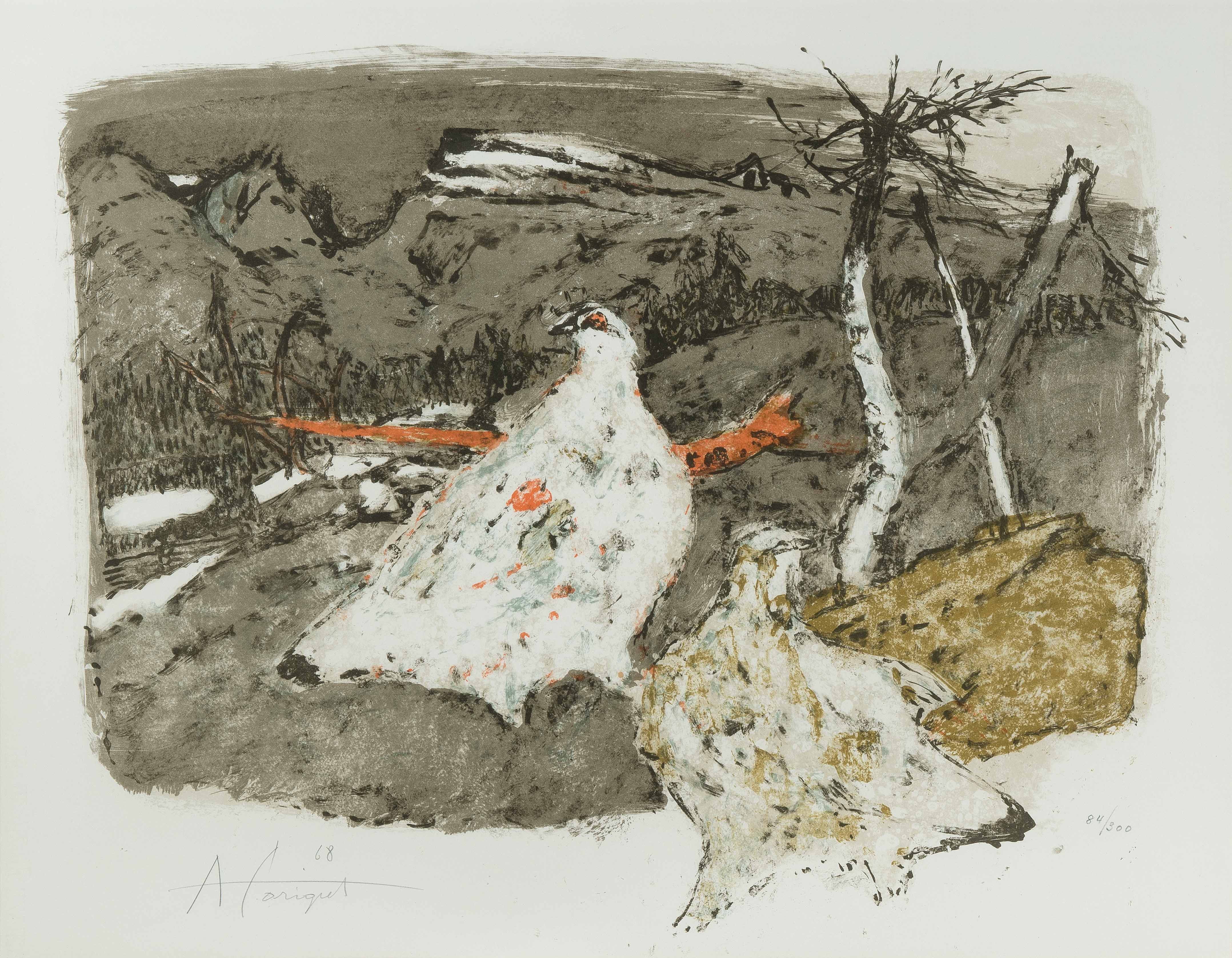 "Schneehühner". 1968. Farblithographie. 84/300. Unten links in Bleistift signiert und datiert. Blattgrösse 49,8x65 cm. Gerahmt. -Verso an allen Rändern an Passepartout montiert.