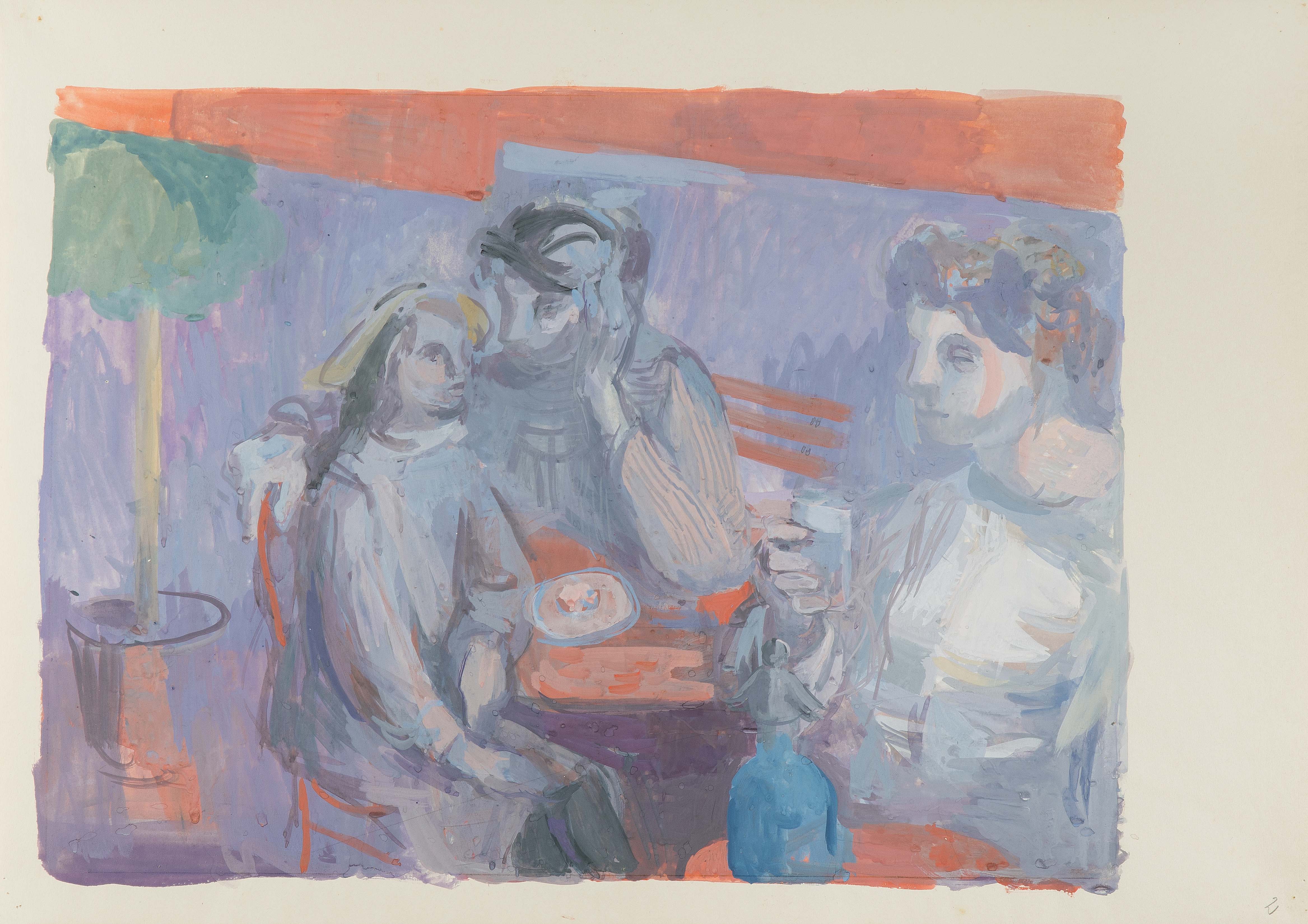 Gartencafé. Gouache auf Papier. Blattgrösse 42,2x59,3 cm. -Blatt leicht gebräunt. Winzige Einstichlöcher in den Ecken. Verso partiell an Rückkarton montiert.