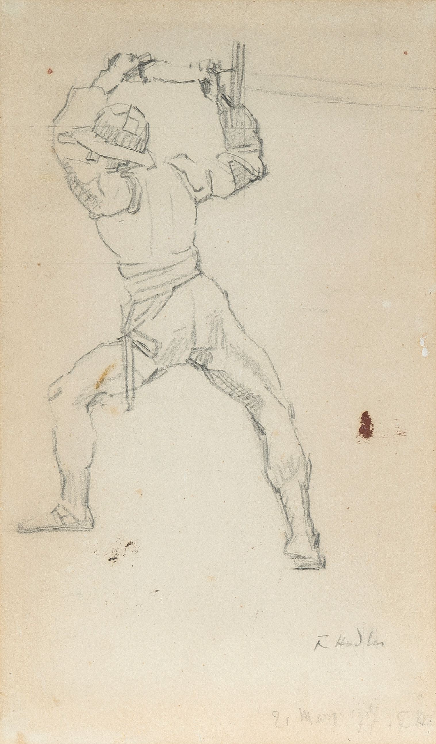 Figurenstudie zu "Die Schlacht bei Murten". 1917. Bleistift auf Papier. Unten rechts in Bleistift signiert und datiert: "21 März 1917" und monogrammiert. Verso auf der Rahmenrückwand bezeichnet: "Salon Henri Brendlé Zürich". Lichtmass 36x21 cm. Gerahmt. -Mit Atelierspuren. Dieses Blatt wurde zwischen Passepartout und Rückblatt gelegt.