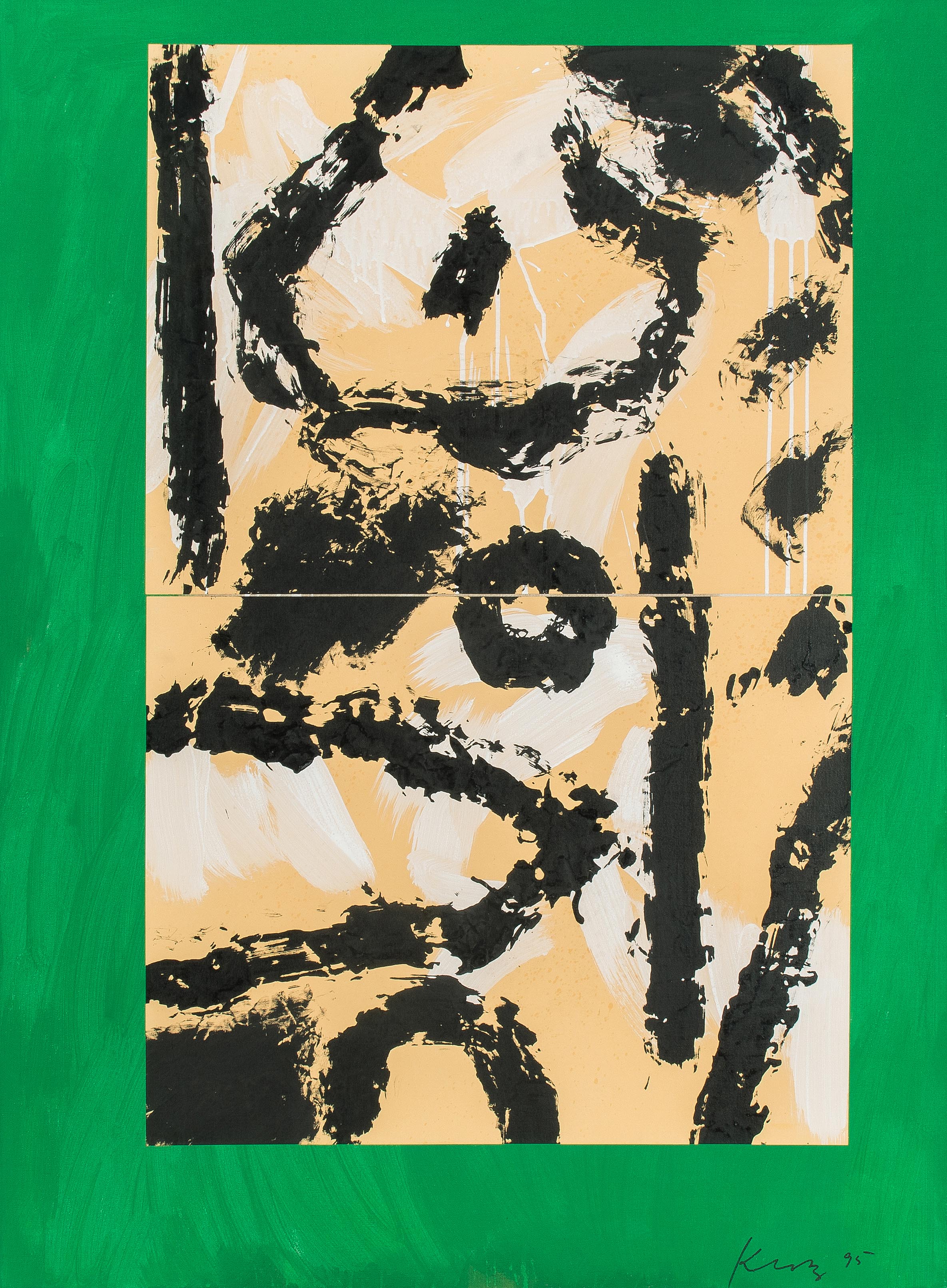 "Wieder bei Pfahlbauer's". 1995. Tusche und Gesso auf Ingres auf mit Acryl grün bemalter Leinwand. Unten rechts signiert und datiert. Verso datiert: "22.3.95". Leinwandmasse 120x88 cm. Leistenrahmen. -Blätter leicht gebräunt.