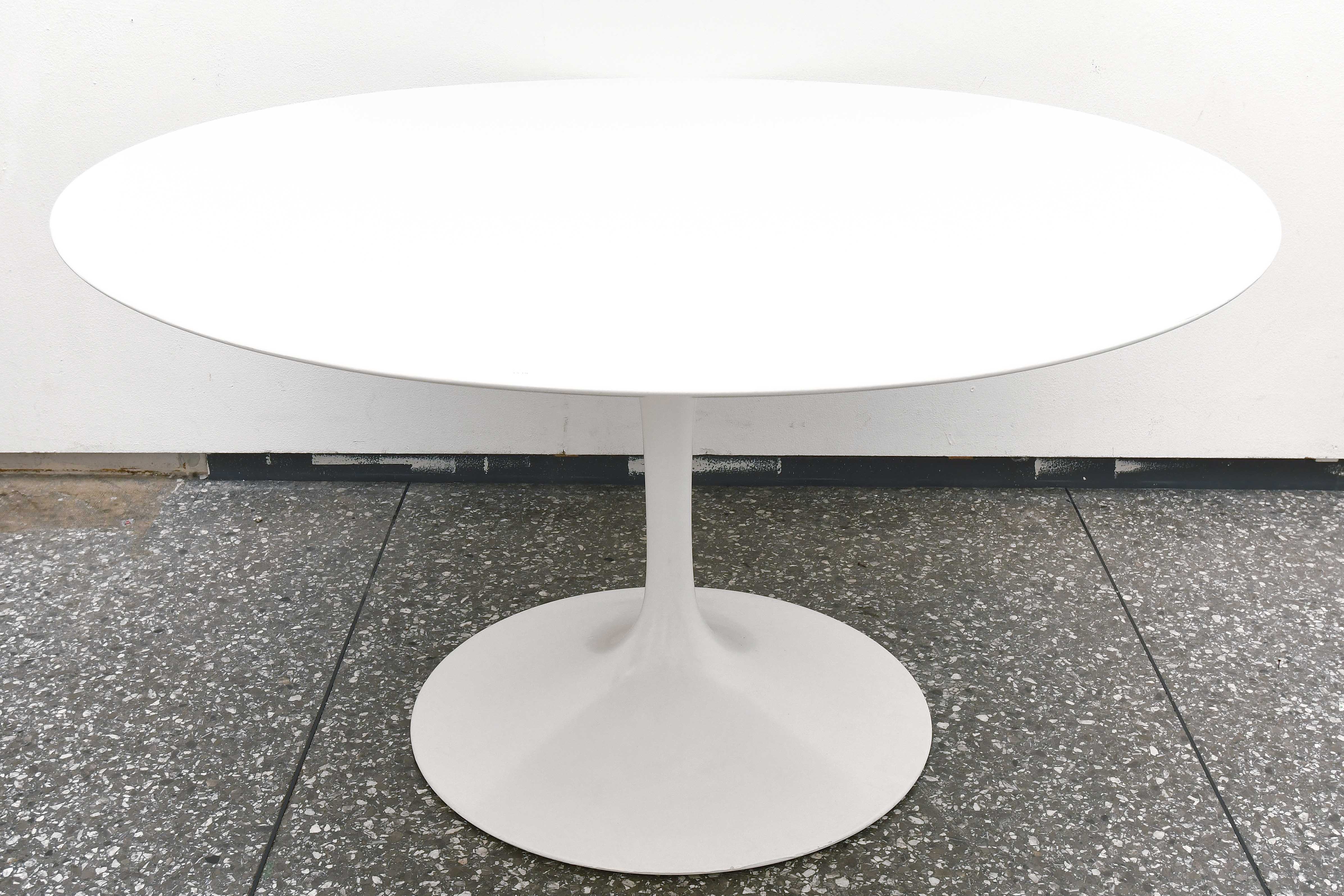 Esstisch "Tulip", Entwurf 1956. Ausführung Knoll. Fuss aus Aluminiumguss, weiss lackiert und weisse Schichtplatte. Gebrauchsspuren. Guter Zustand. D 137 cm . H 70 cm.
