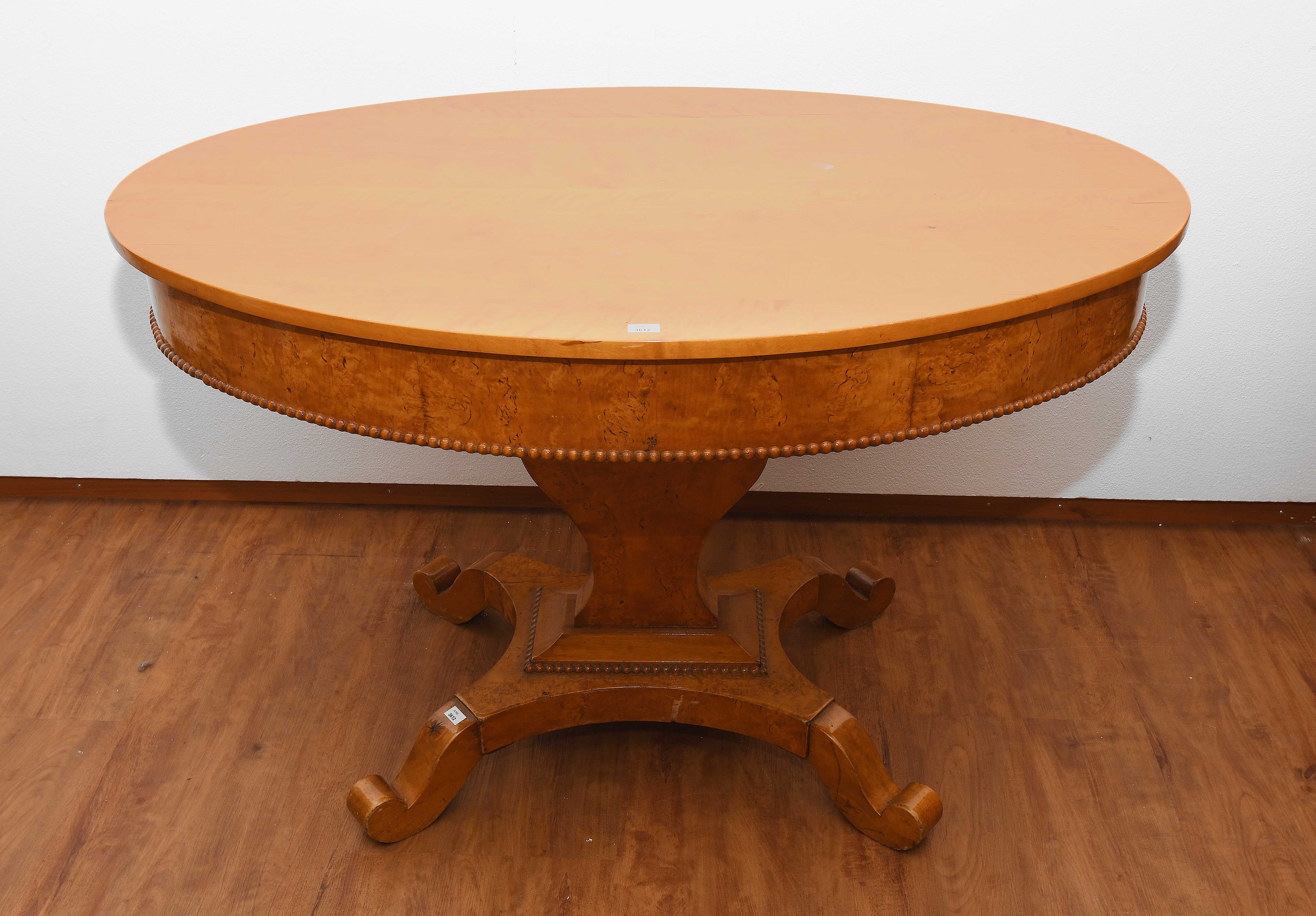 Biedermeier-Stil, 20. Jh. Ahorn. Säulenförmiger Schaft auf vierpassigem Fussbrett, unter ovaler Platte. Gebrauchsspuren. 104x73x67 cm.
