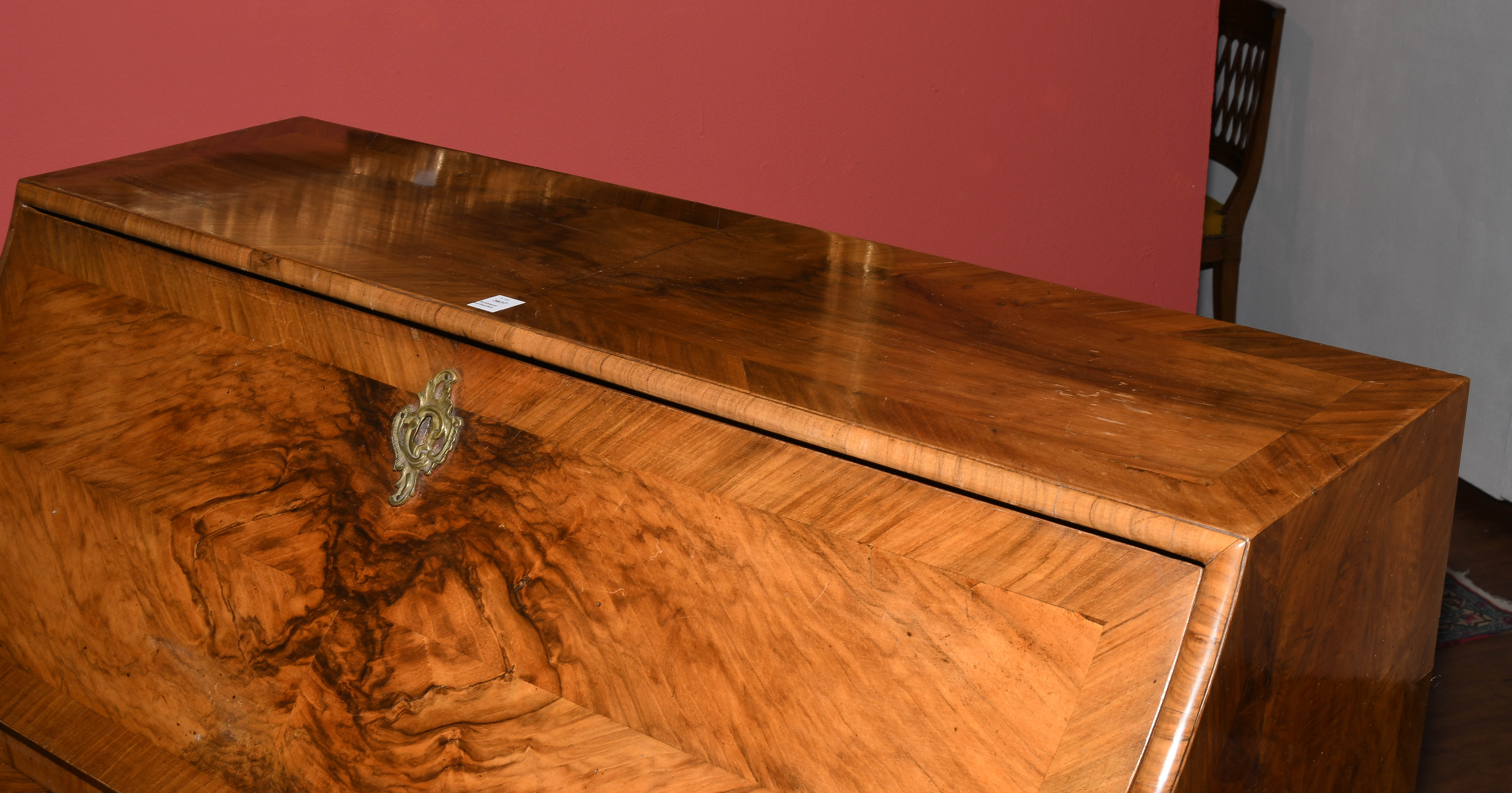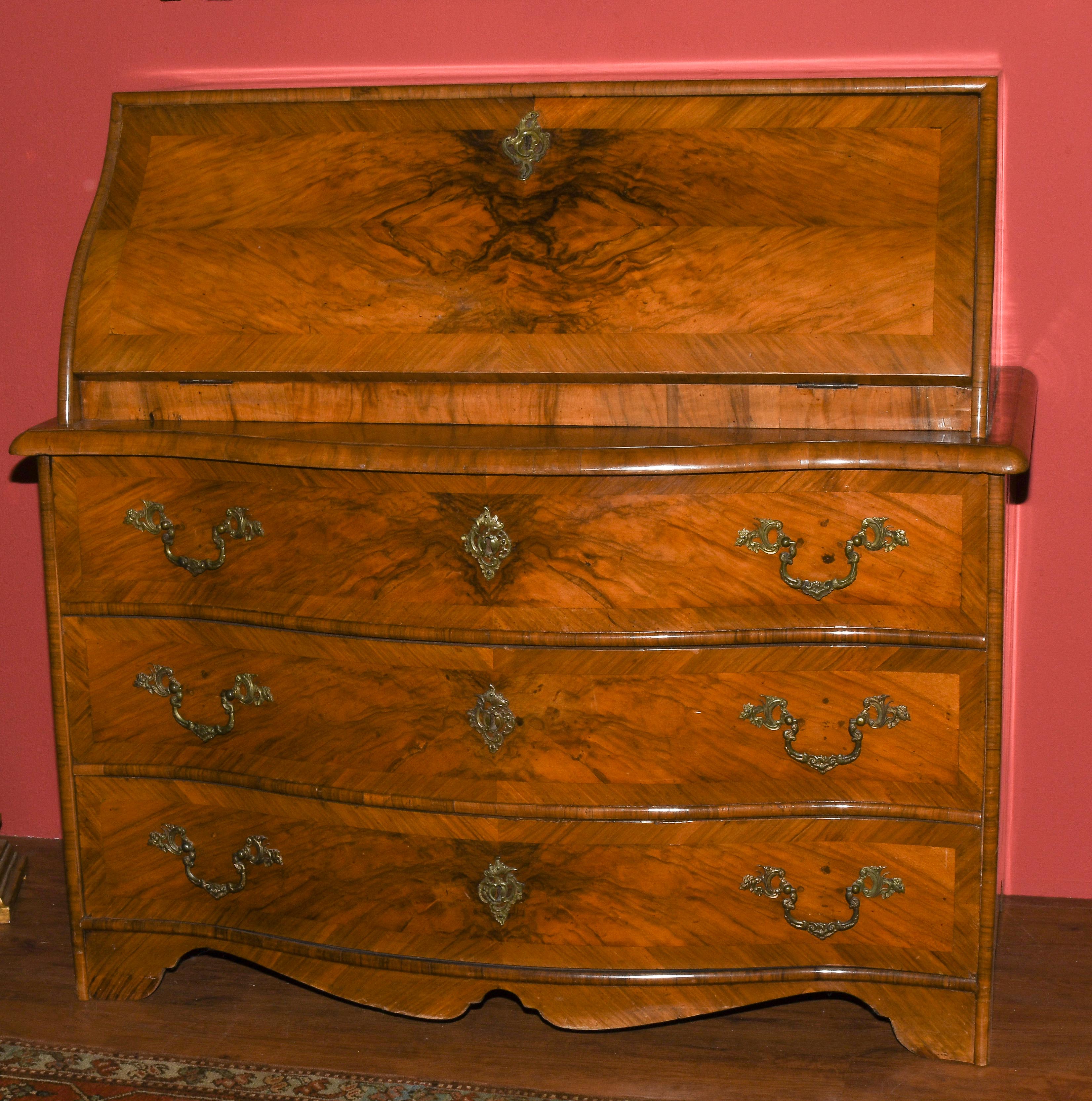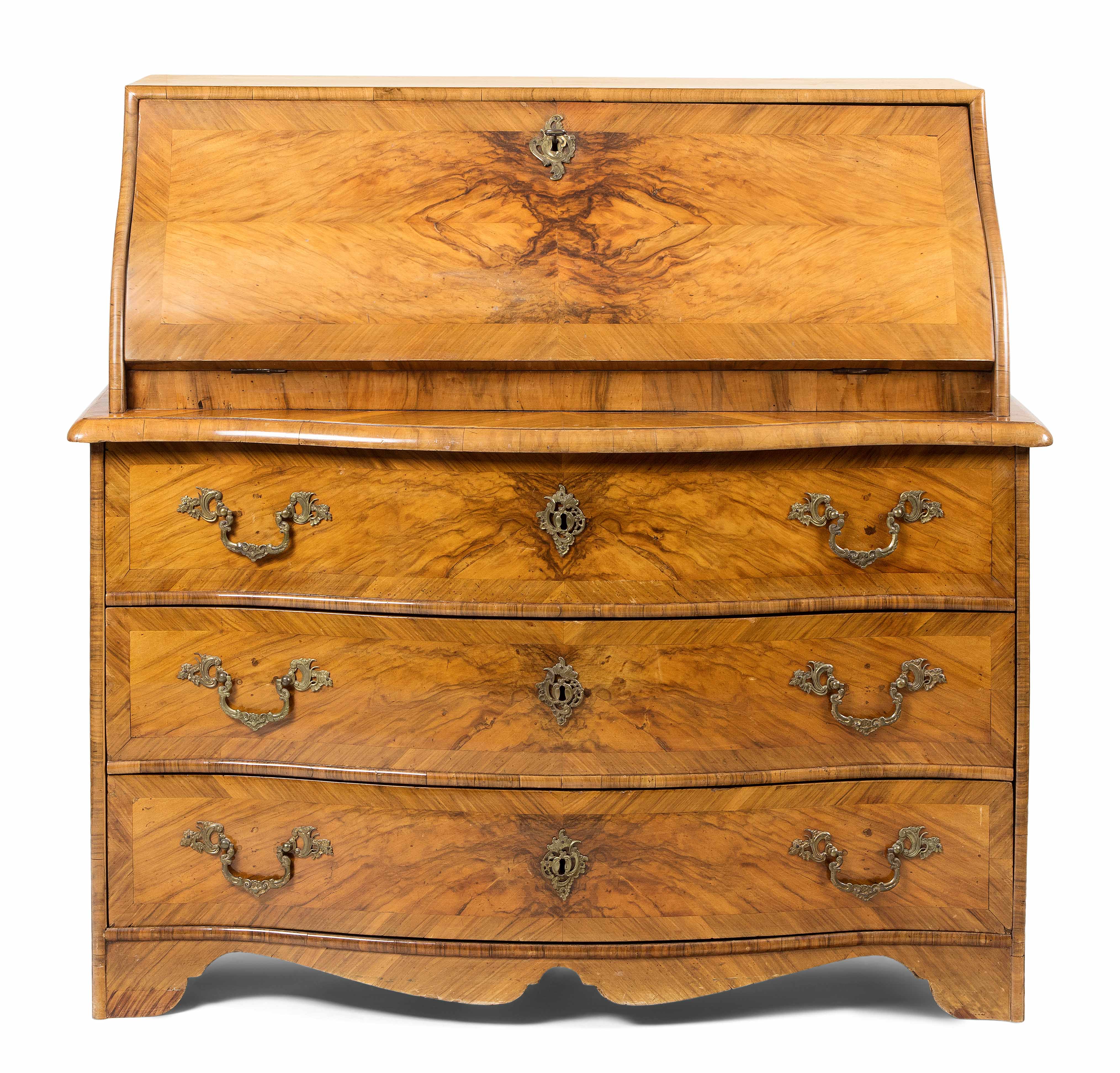 Barock ca. 1750. Bern. Nussbaum. Dreischübiger Kommodenteil mit geschweifter Frontpartie. Schreibaufsatz mit geschrägter Schreiblade vor mehrschübiger Inneneinteilung. Vierseitig gefeldert furniert. Gebrauchsspuren. 122x66x115 cm.