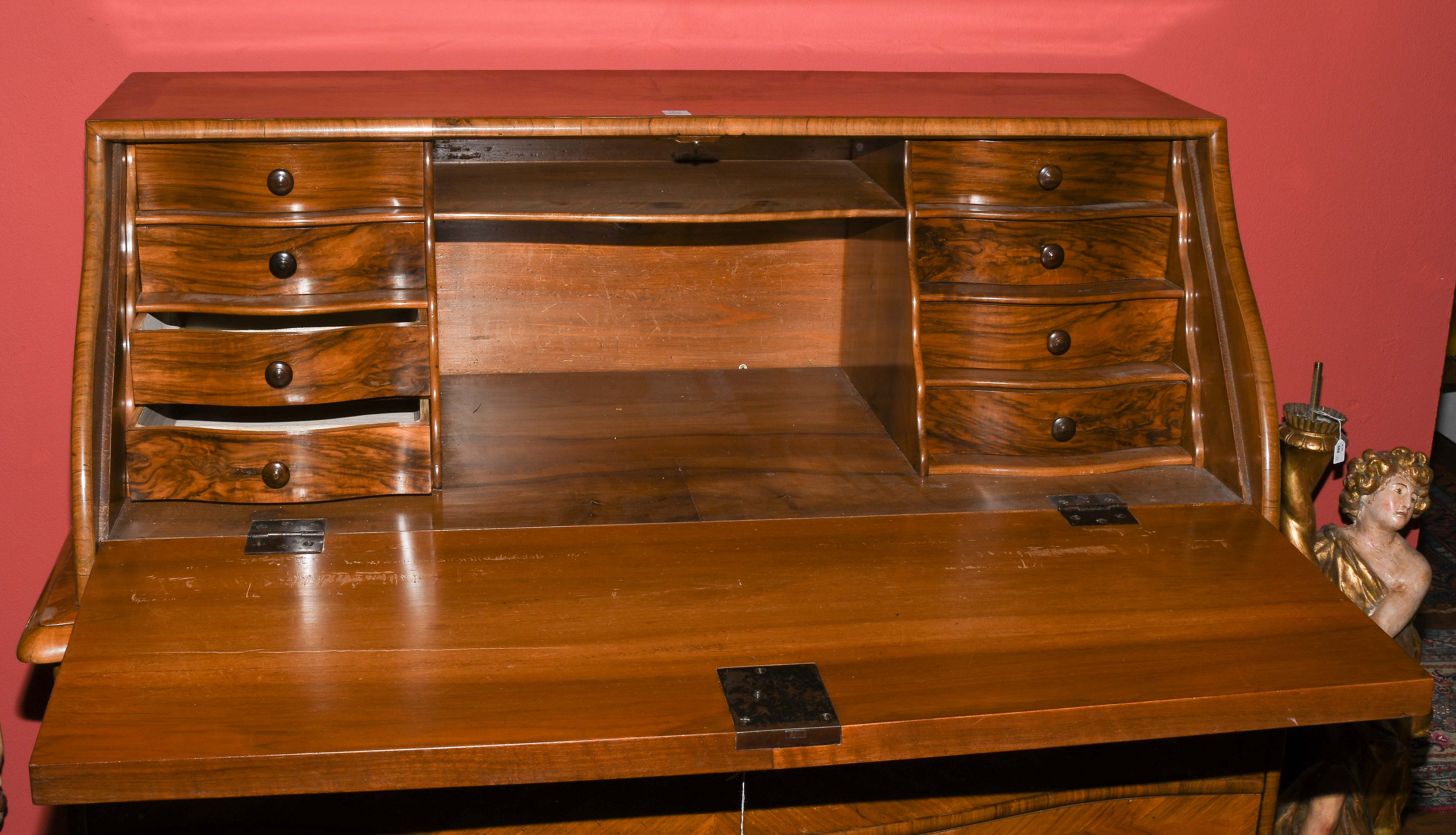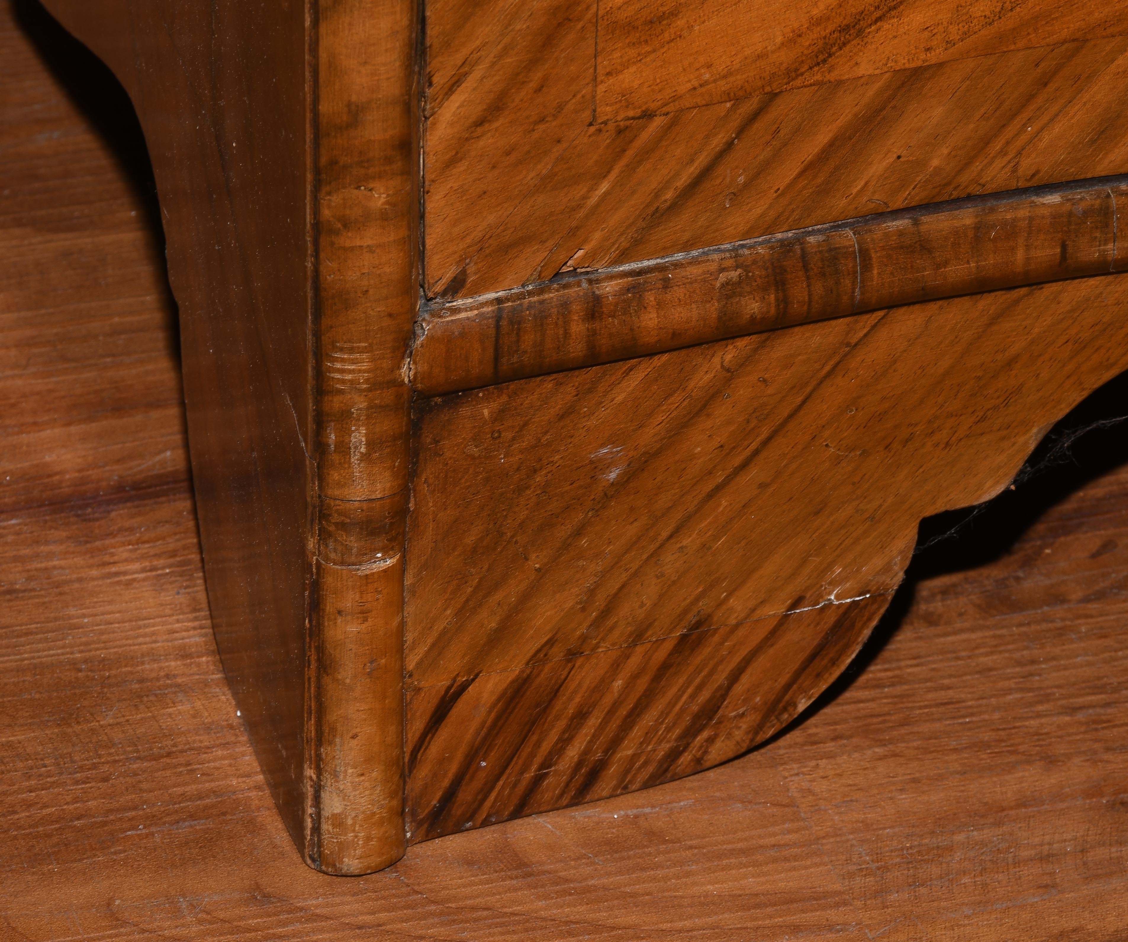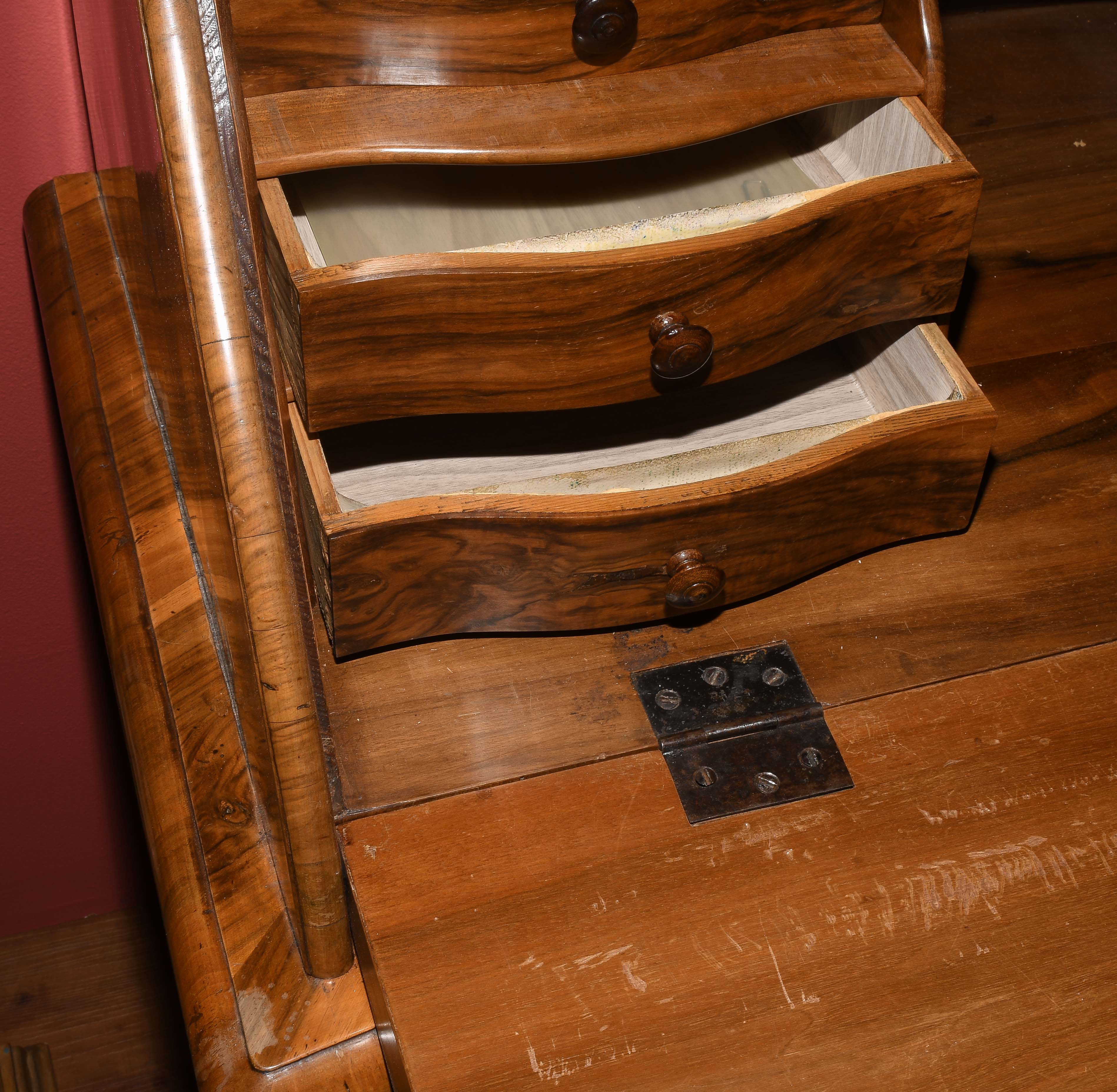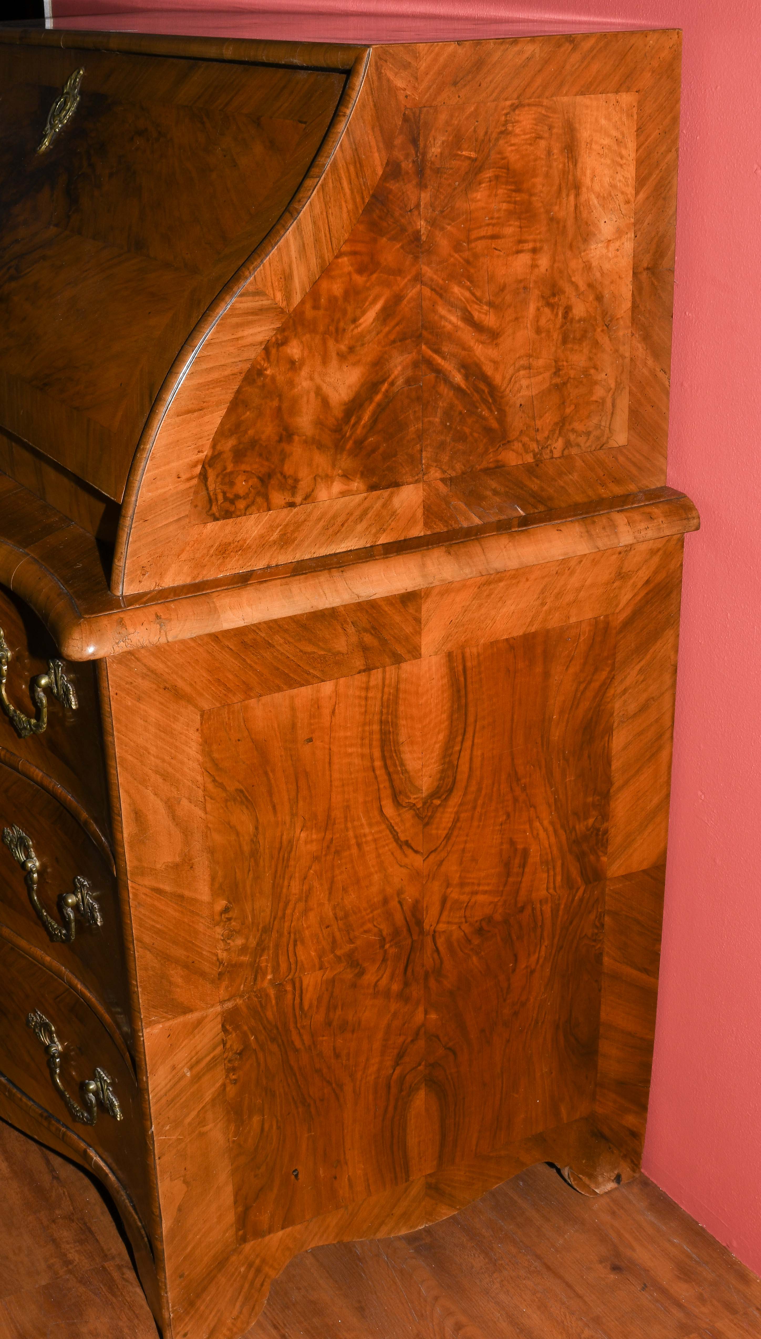 Barock ca. 1750. Bern. Nussbaum. Dreischübiger Kommodenteil mit geschweifter Frontpartie. Schreibaufsatz mit geschrägter Schreiblade vor mehrschübiger Inneneinteilung. Vierseitig gefeldert furniert. Gebrauchsspuren. 122x66x115 cm.