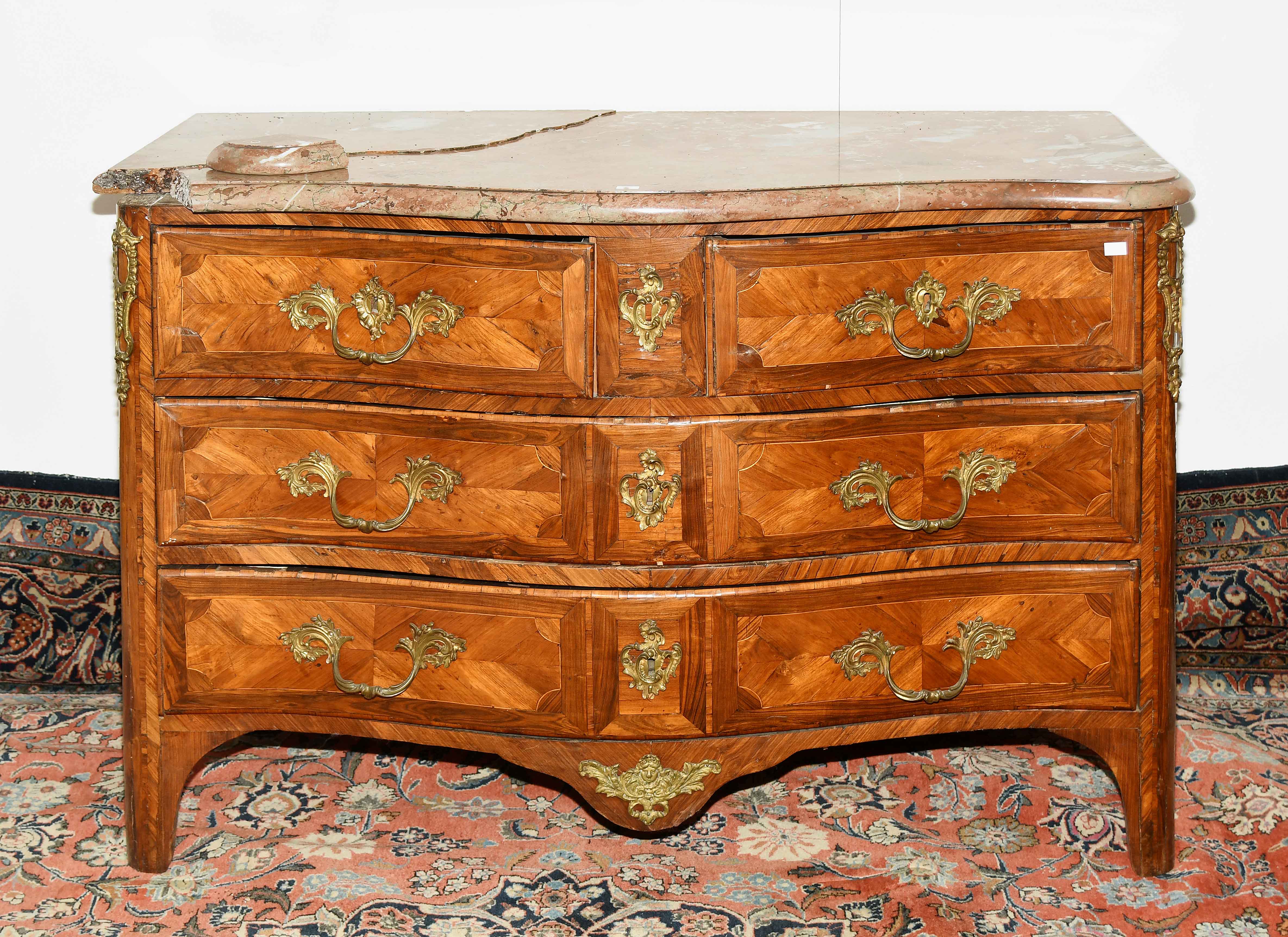 Regency ca. 1730. Frankreich. Palisander, Rosenholz. Vierschübiger Korpus mit gerundeten Eckstollen, und geschweifter Front. Dreiseitig gefeldert furniert, und mit Kontrastadern gearbeitet. Marmor: Braun-Beige gemustert. Marmor gebrochen, zu restaurieren. 128x63x86 cm.