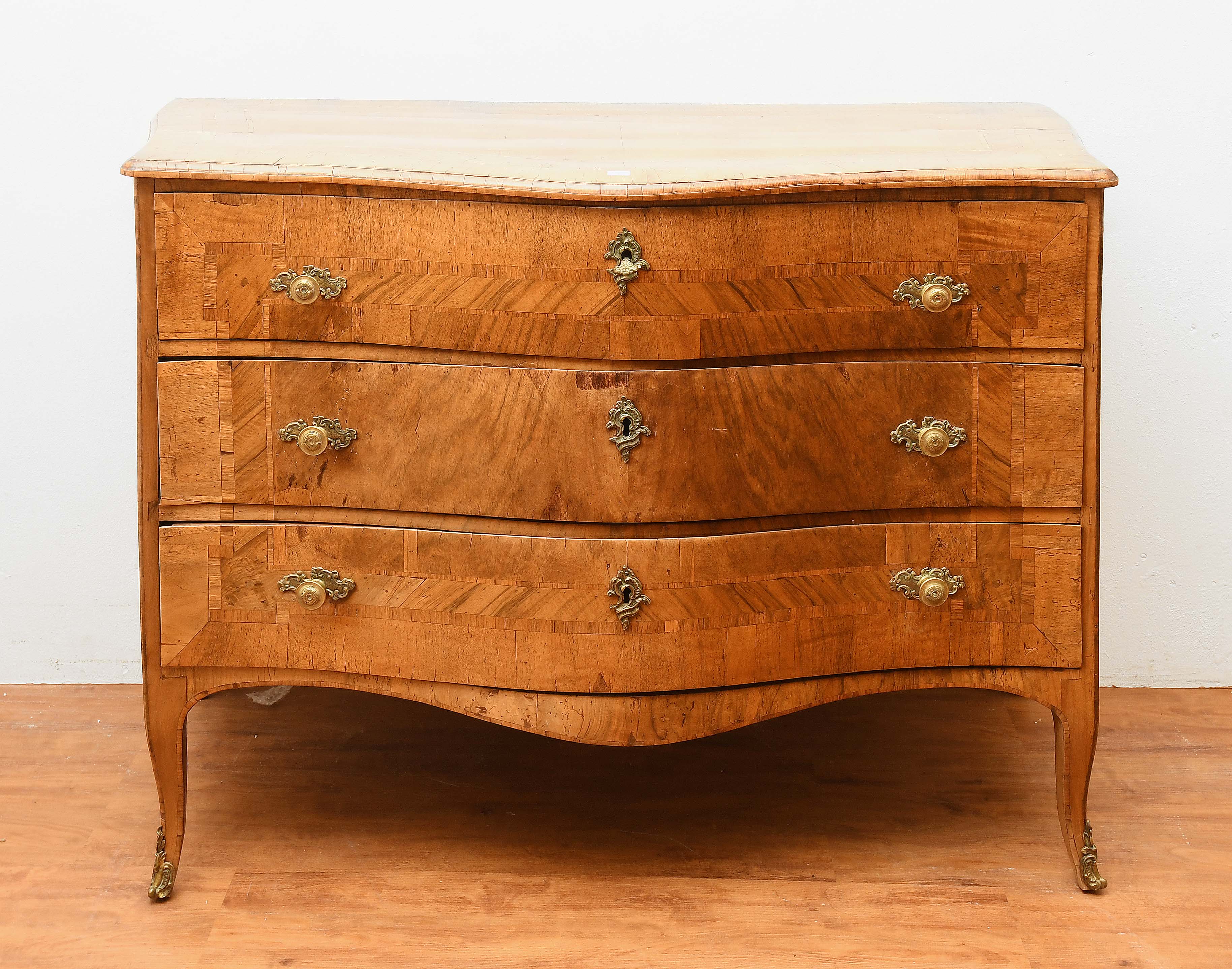 Barock ca. 1750, Italien. Nussbaum, Rosenholz. Geschweifter, dreischübiger Korpus auf ausgestellten Füssen. Vierseitig gefeldert furniert, mit geometrischen kontrastbändern belegt. Gebrauchsspuren. 128x60x91 cm.