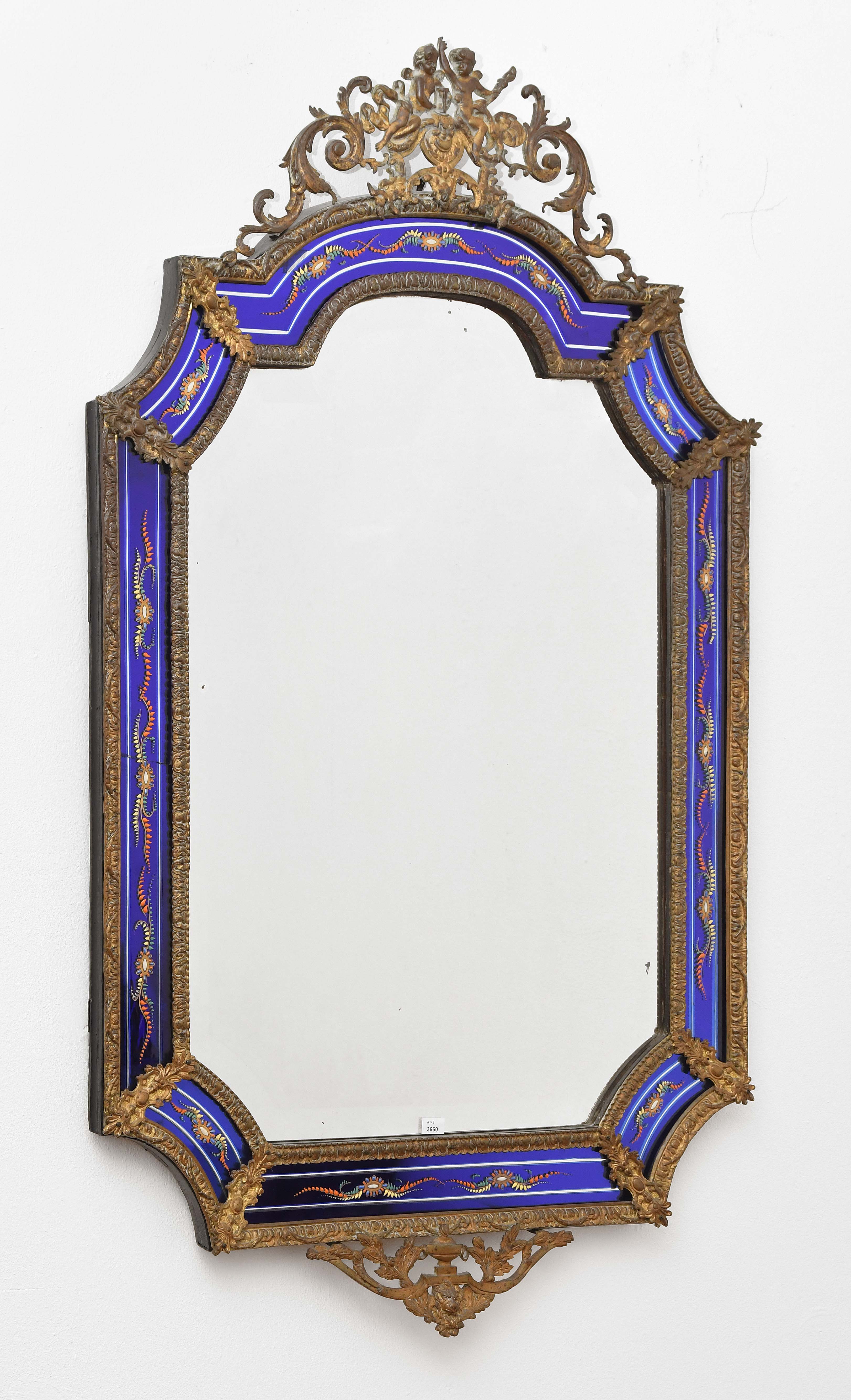 Barock-Stil 19/20. Jh. Blaues Glas, Messing. Moulierter Doppelrahmen mit blauem farbig bemalten Glas gearbeitet. Bekrönung mit Ranken und Puttendekor versehen. Gebrauchsspuren. 72x118 cm.