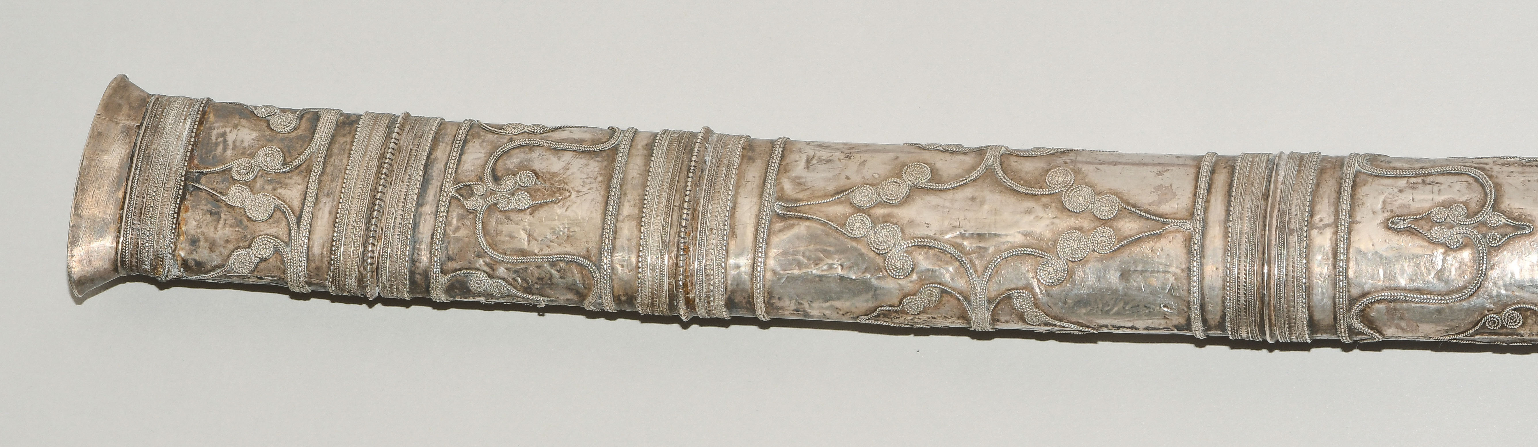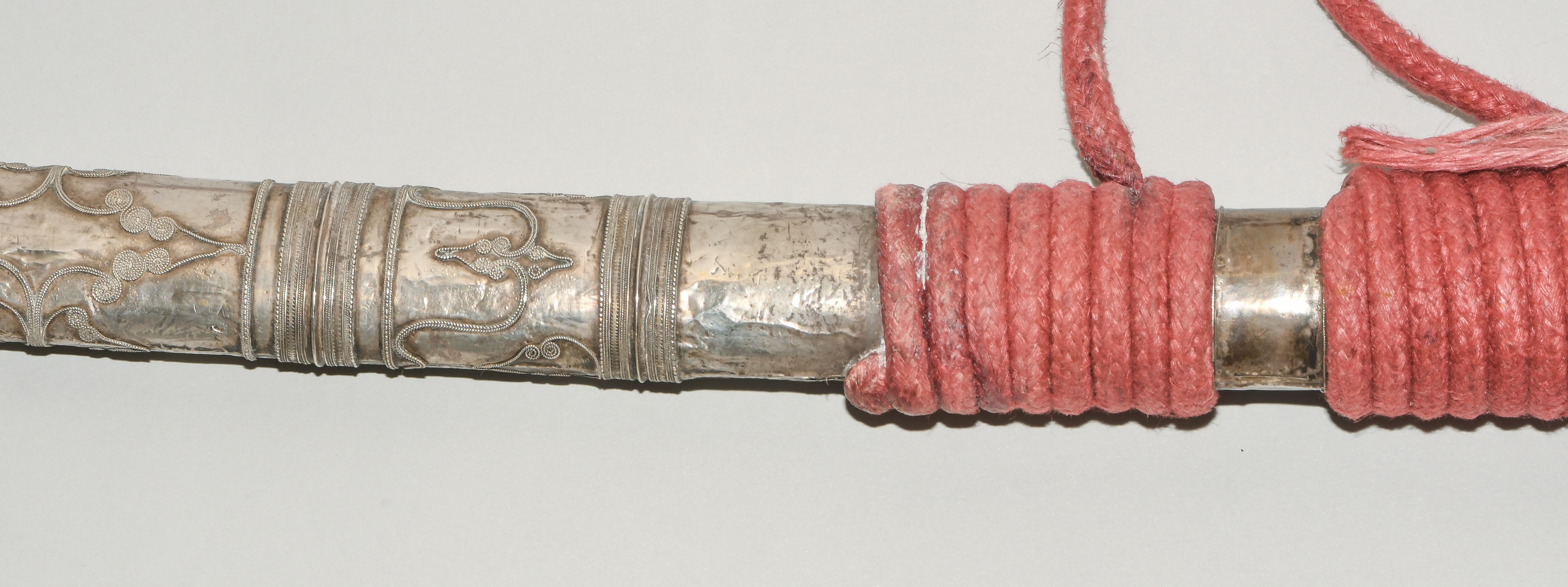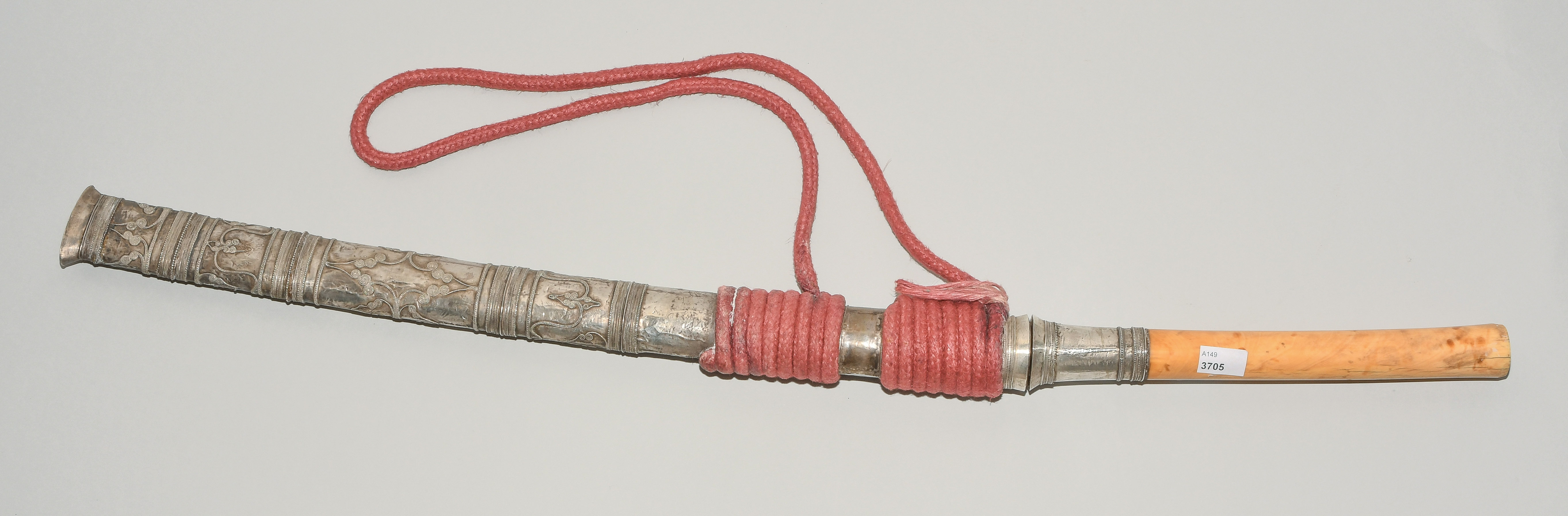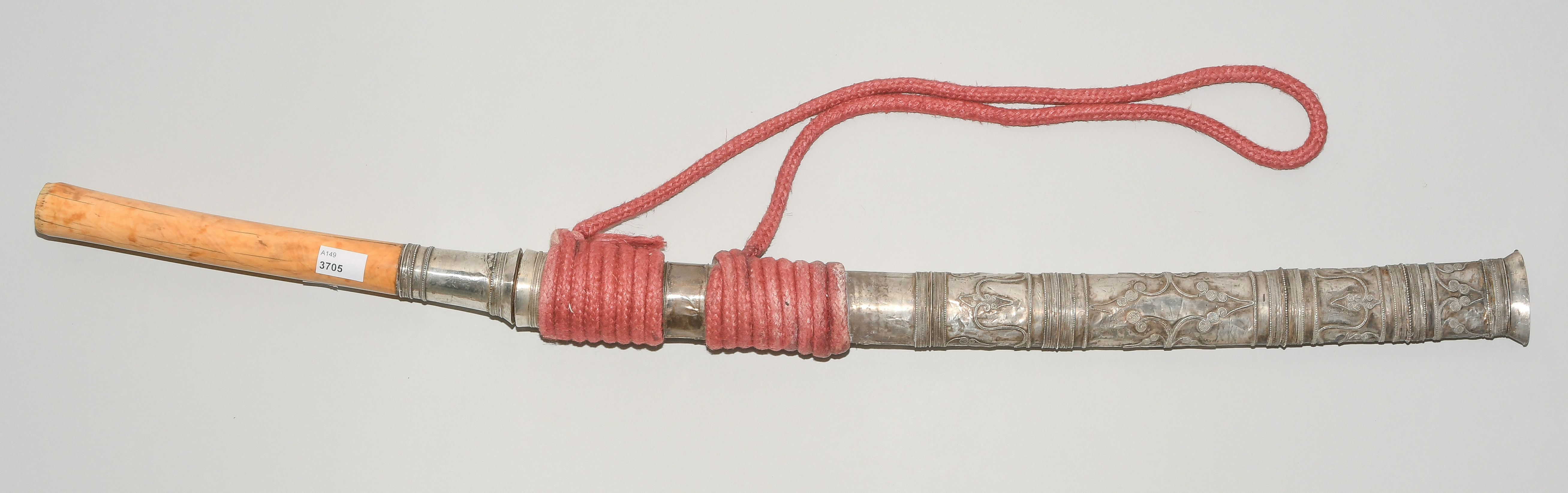 Burma, Mitte 19.Jh.. Glatter Knochengriff mit Silbermanschette, zislierte und punzierte Rückenklinge. Holzscheide mit Silberblechüberzug, feiner filigraner Silberdrahtdekor. Rote Tragkordel. L ca. 78