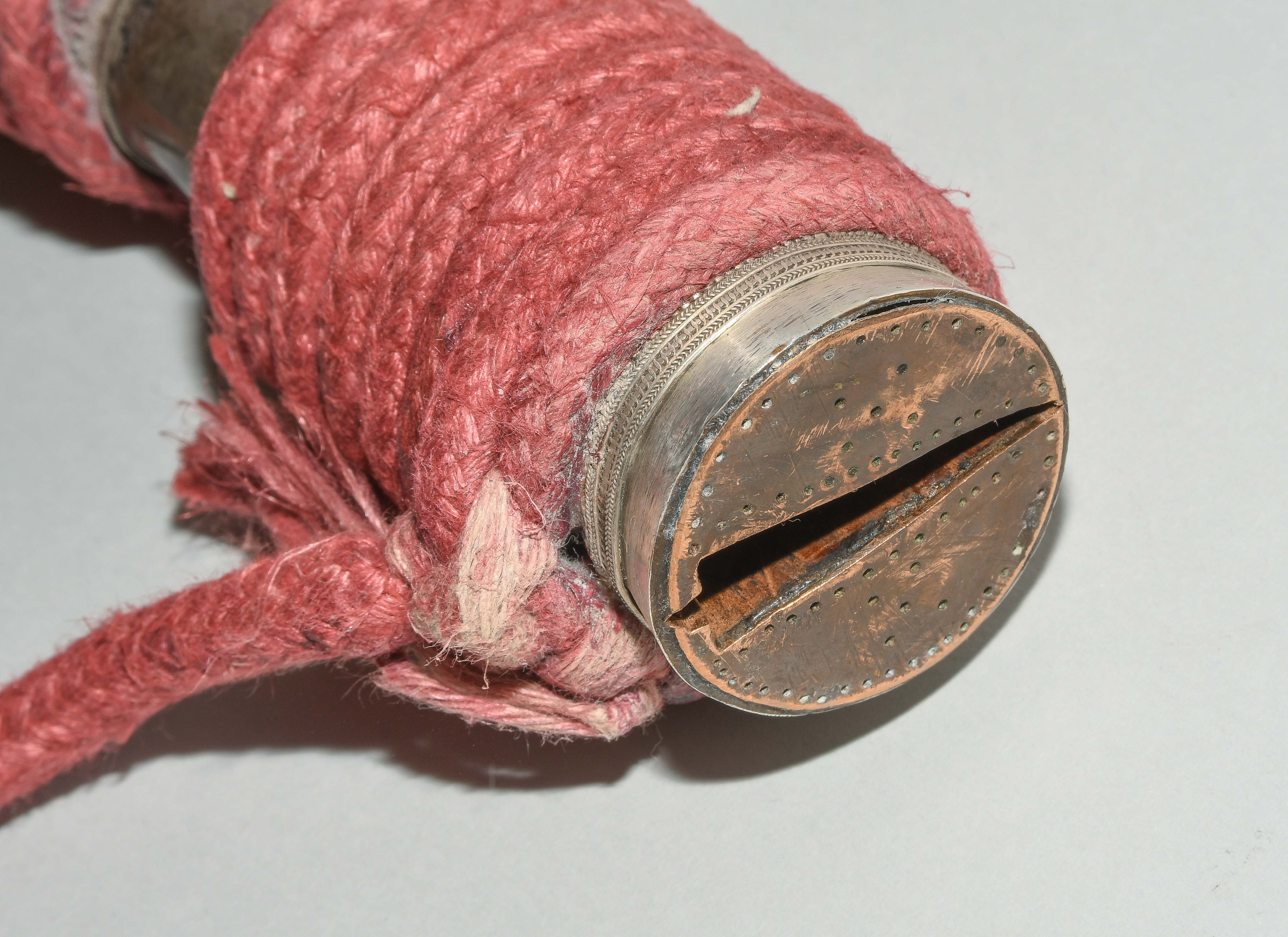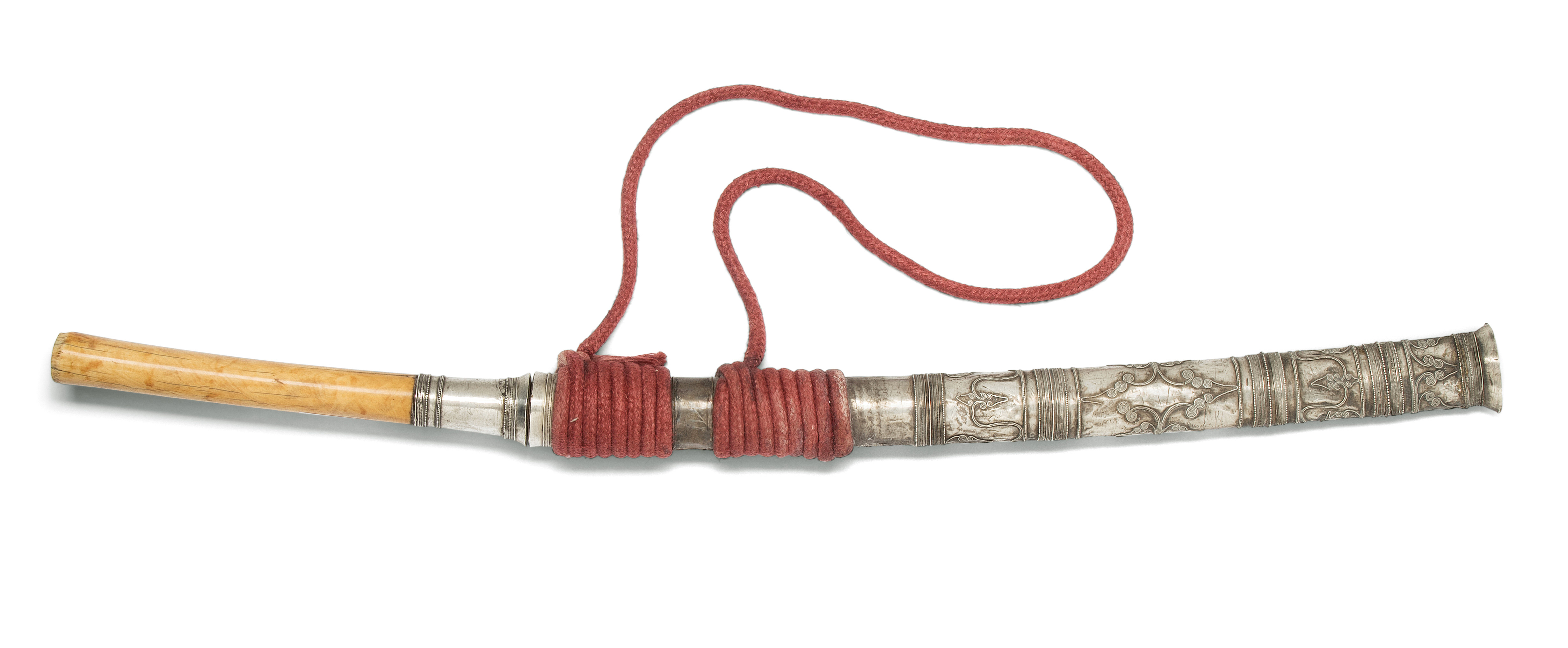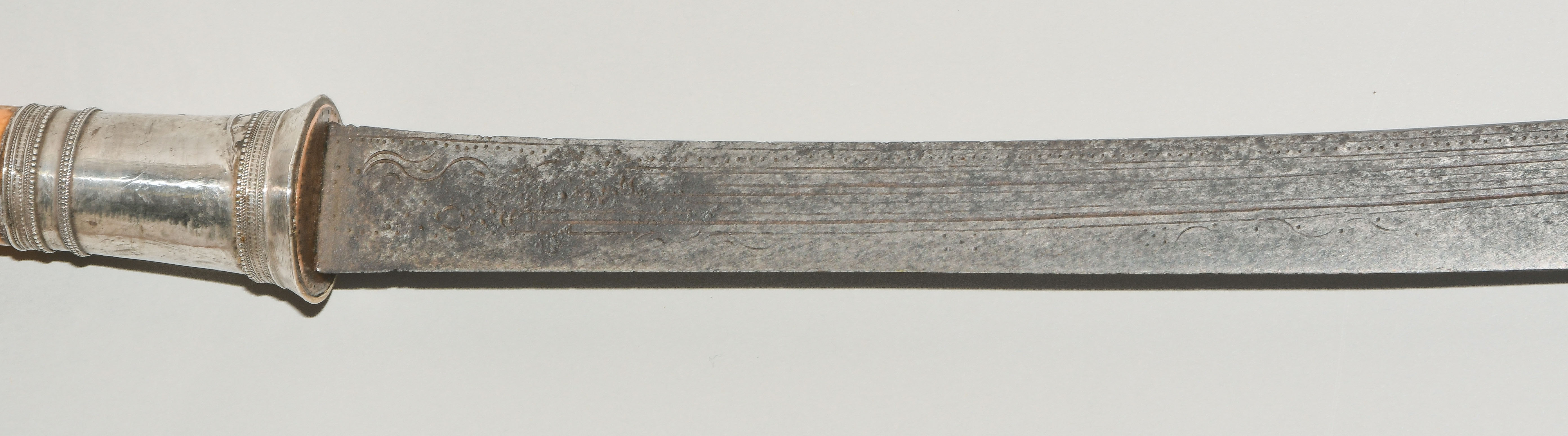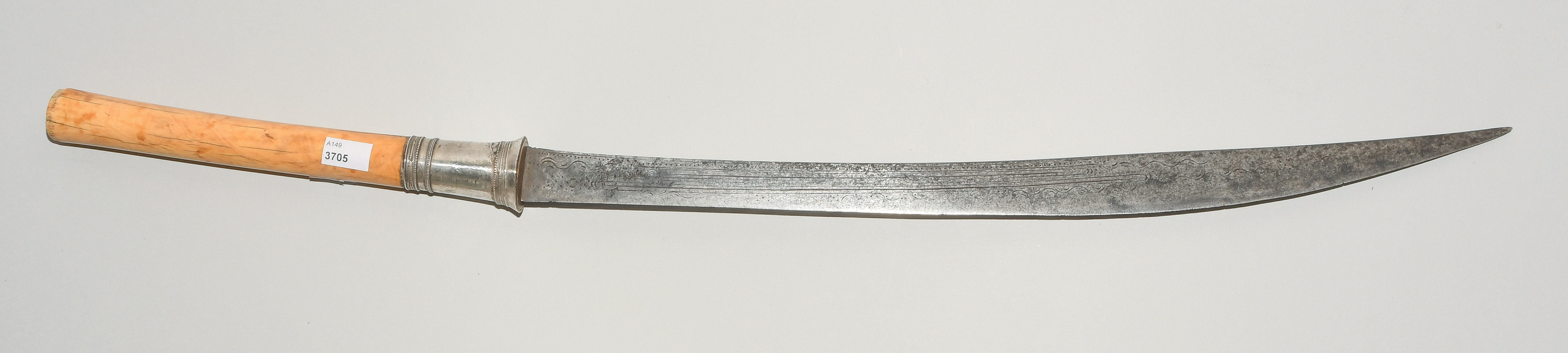 Burma, Mitte 19.Jh.. Glatter Knochengriff mit Silbermanschette, zislierte und punzierte Rückenklinge. Holzscheide mit Silberblechüberzug, feiner filigraner Silberdrahtdekor. Rote Tragkordel. L ca. 78