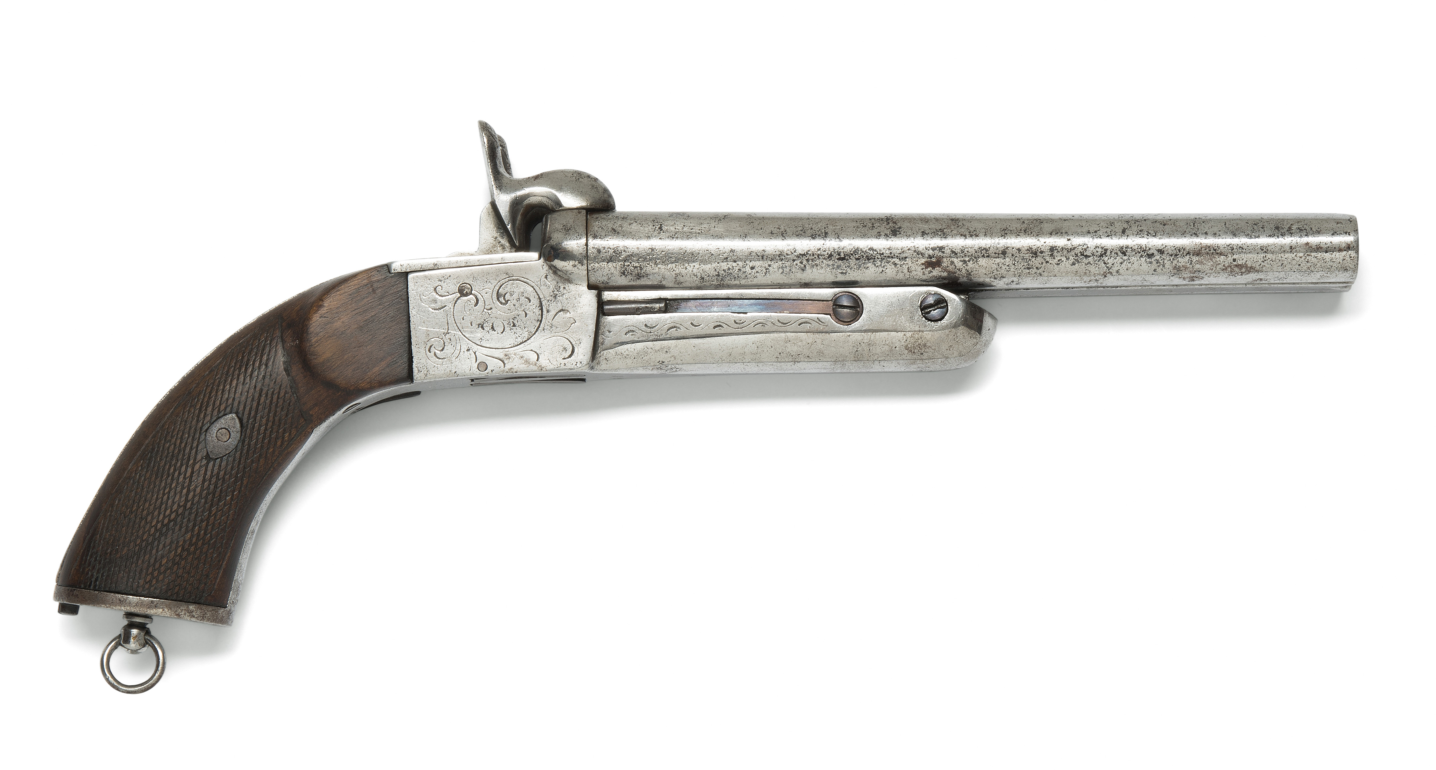 Belgien, 19.Jh.. Eisen, doppel-Kipplauf, gezogen, Kal. 19mm. Zwei versenkbare Abzüge, Kurzer Nussbaum-Halbschaft, Fischhaut. L ca. 34