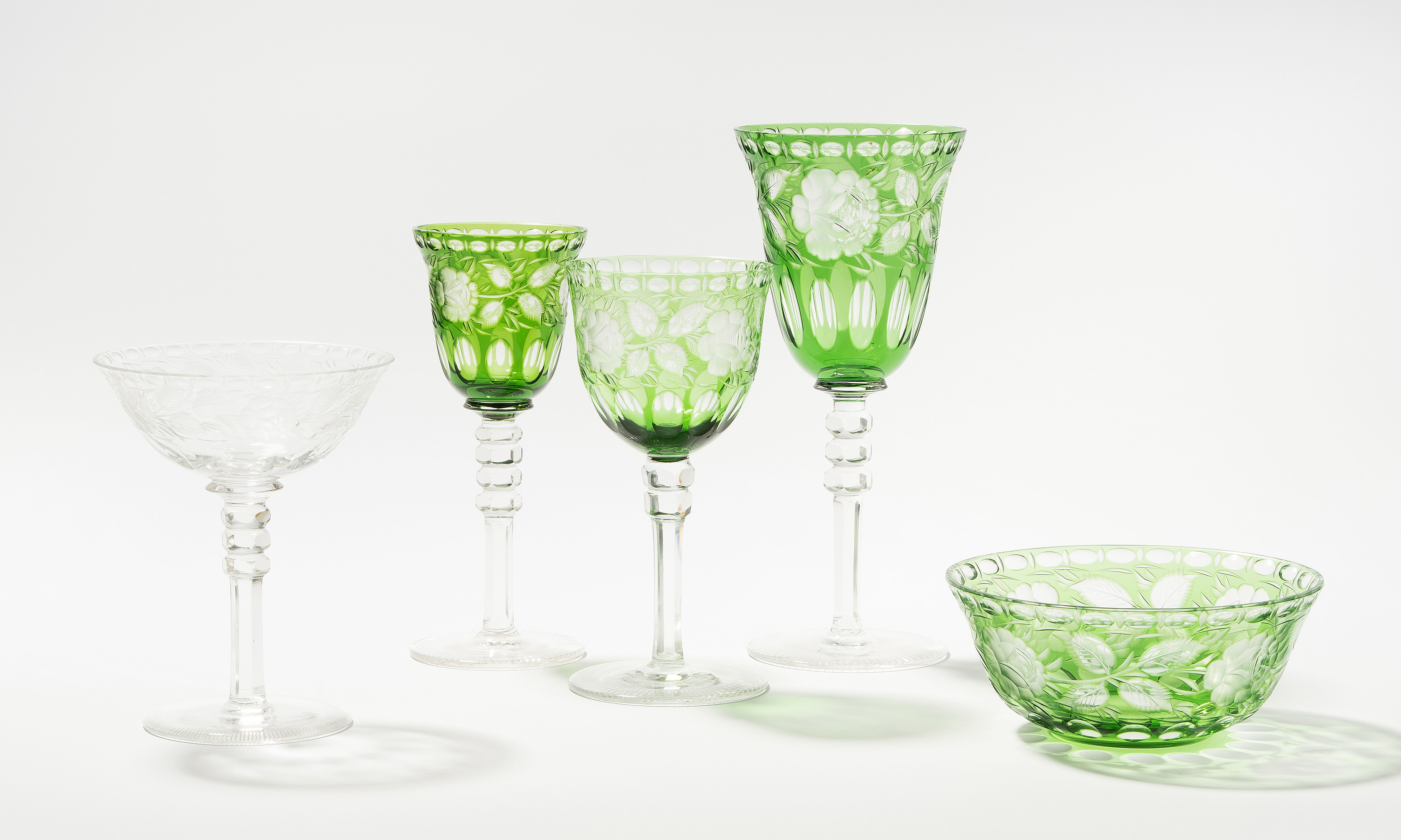 Anfang 20.Jh. Wohl Böhmen. Farbloses Kristallglas, grün überfangen. Bestand: 6 Wasser/Weingläser (H 20,5 cm), 4 Weingläser (H 16,5 cm), 8 Dessertschalen. Dazu passend 3 Sektschalen, farblos.