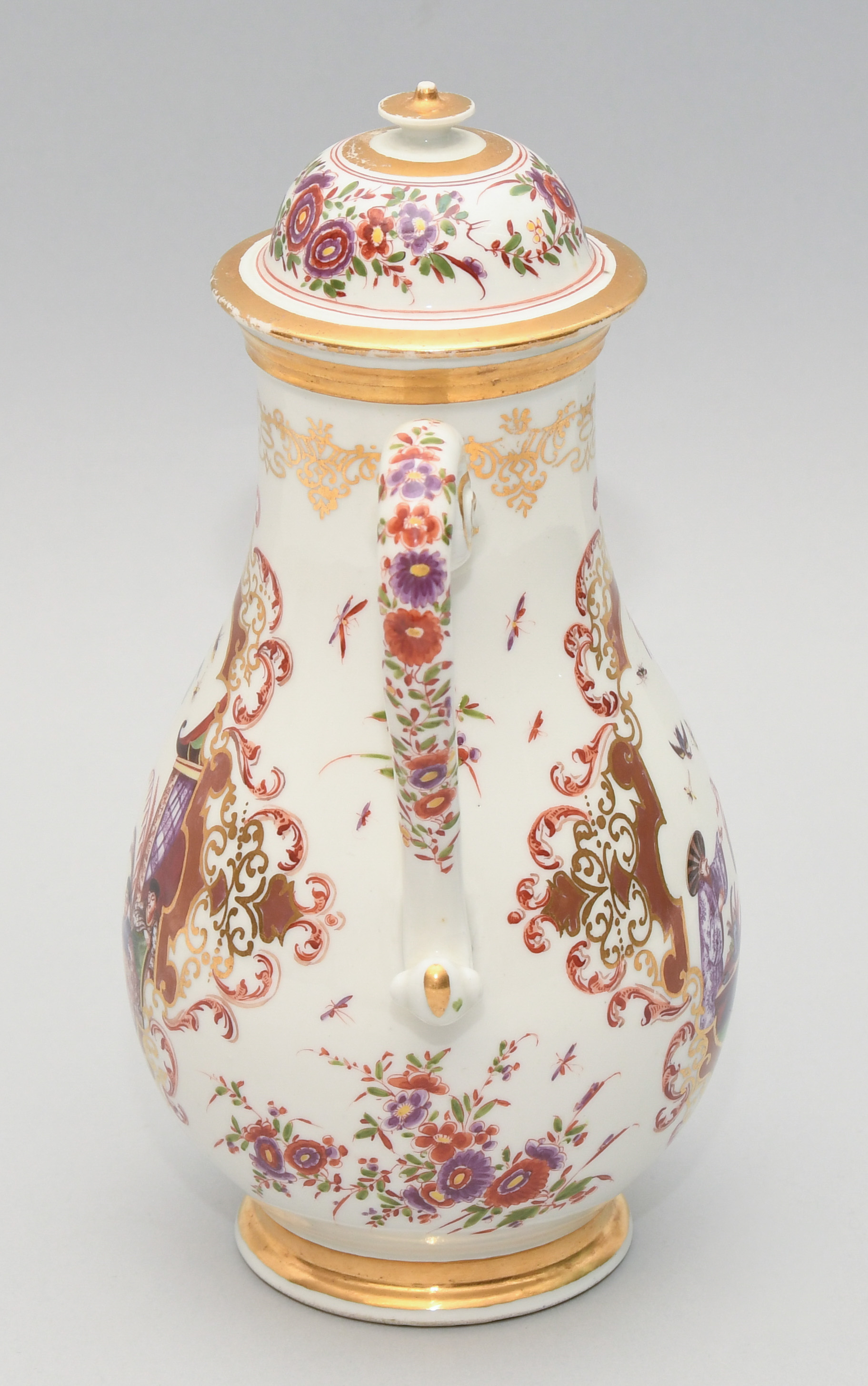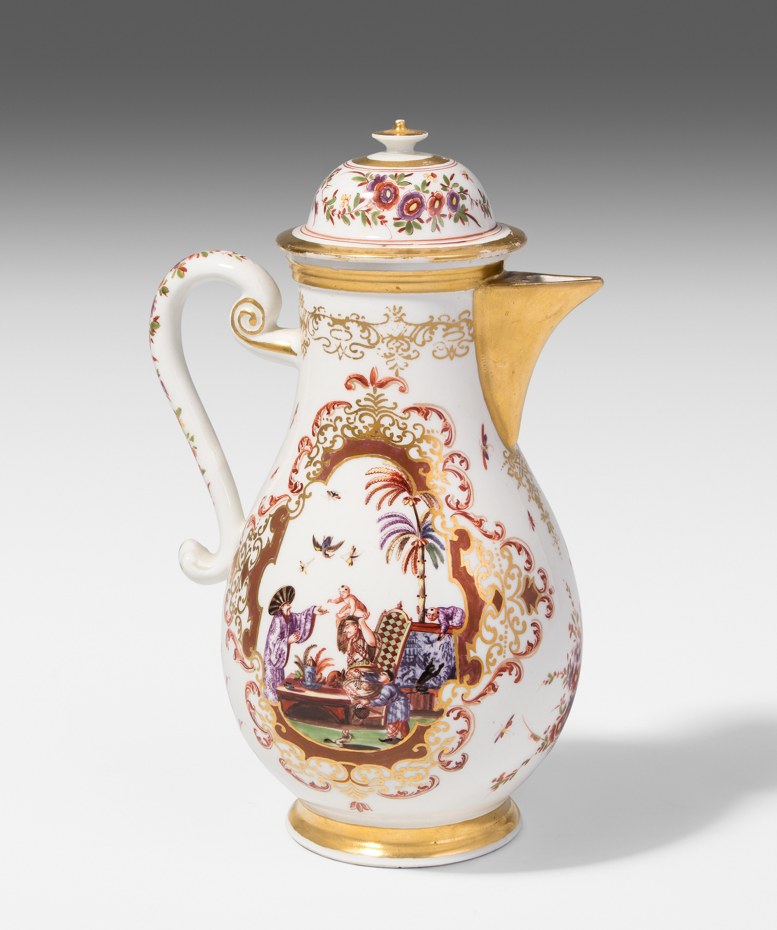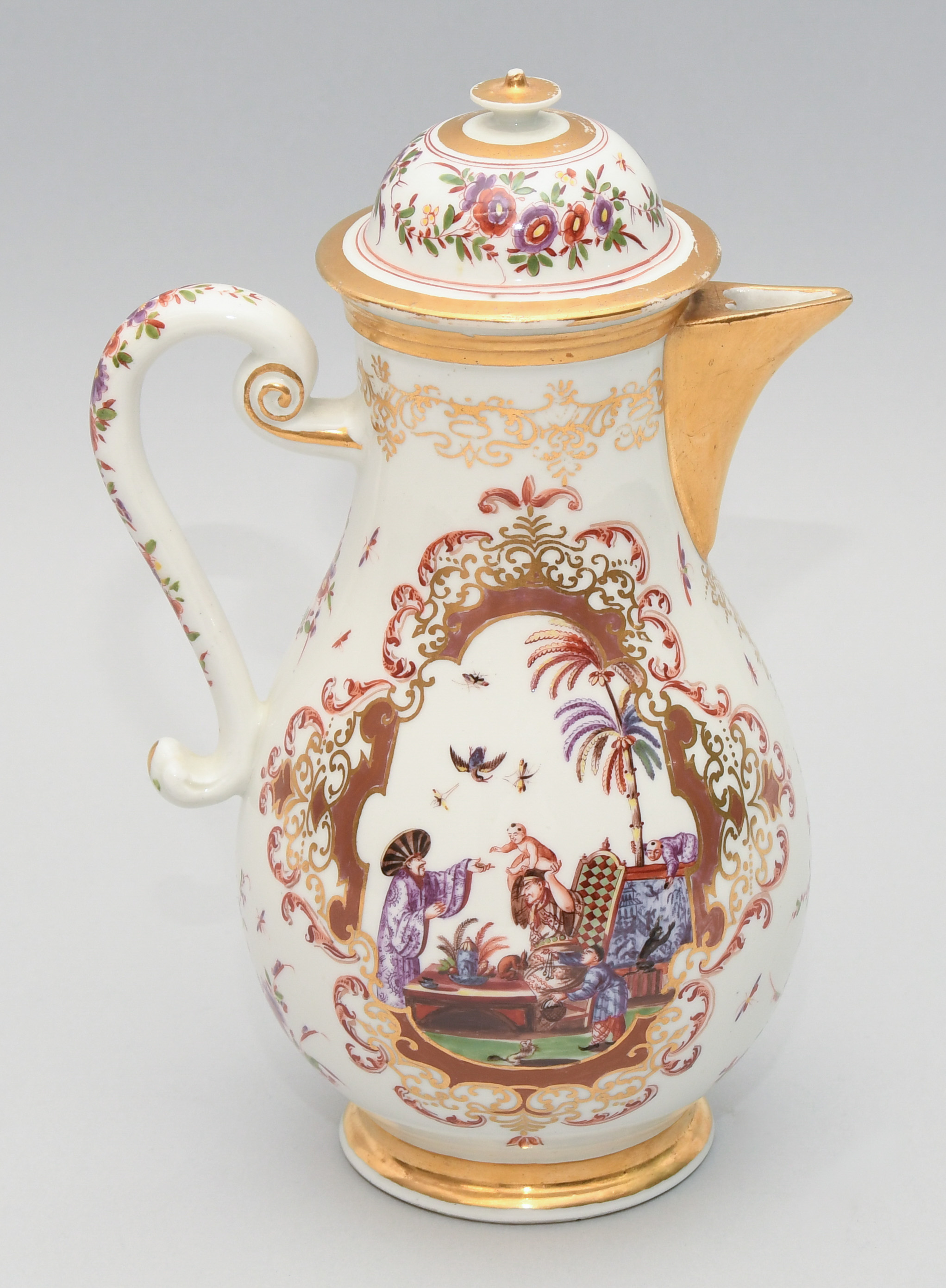 Um 1725. Porzellan, auf der Aussenwandung zwei grosse Kartuschen, darin farbige Chinoiserien, zwischen den Kartuschen und auf dem Deckel bunte indianische Blumen und Insekten, Vergoldung. Bezeichnet: Goldnummer 54. (auf Bodenunterseite und im Deckel). H 21,5 cm.