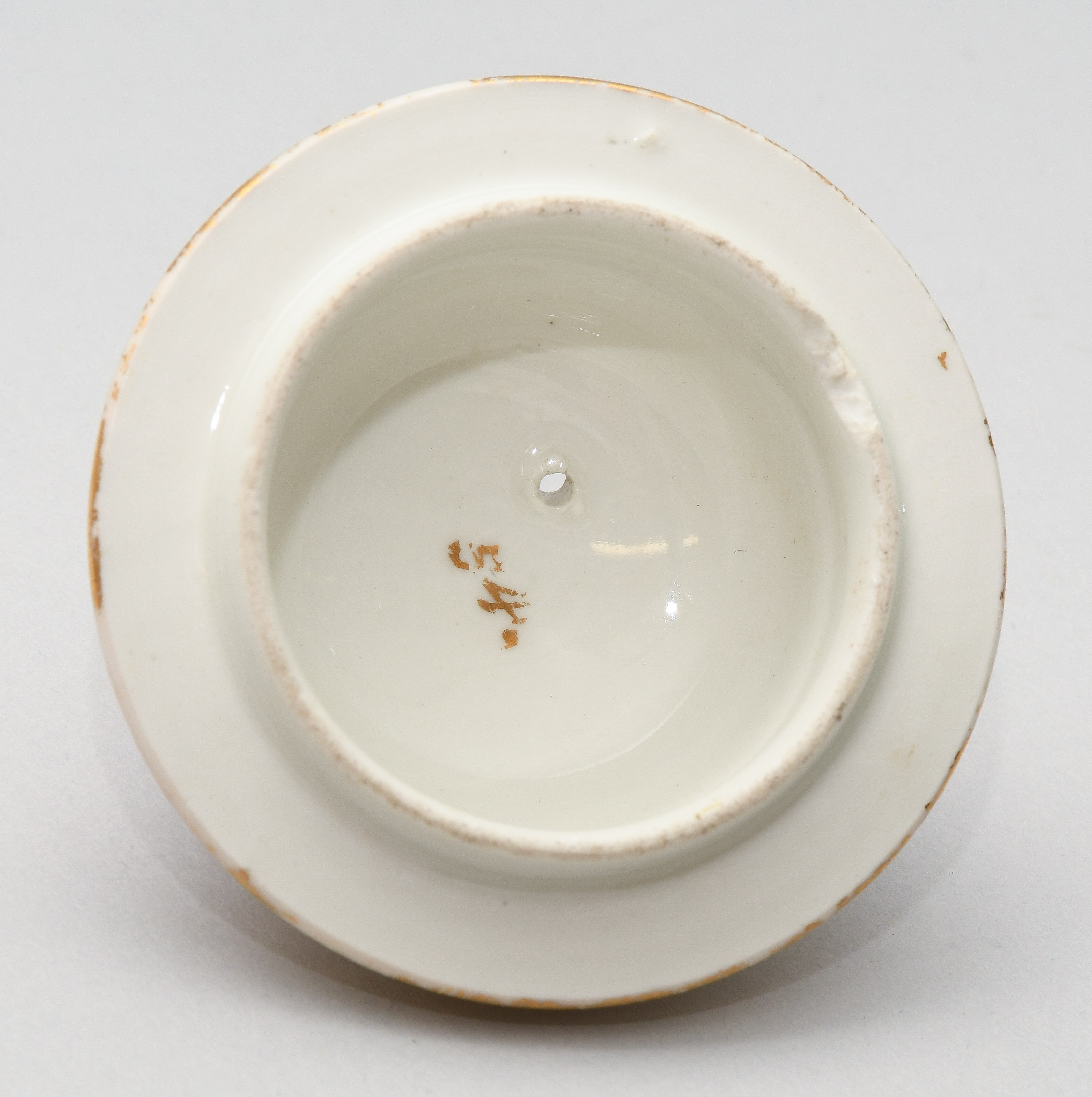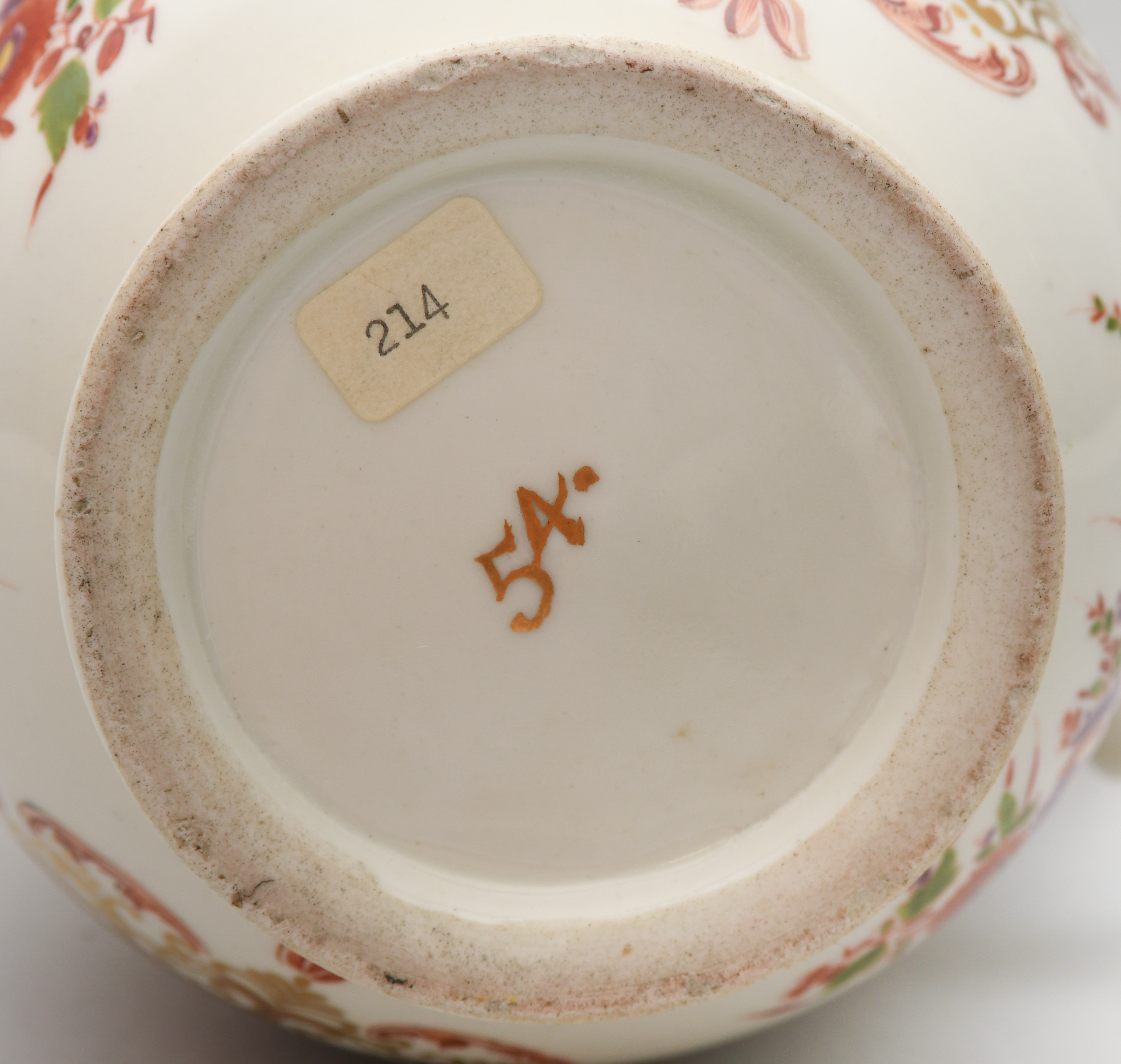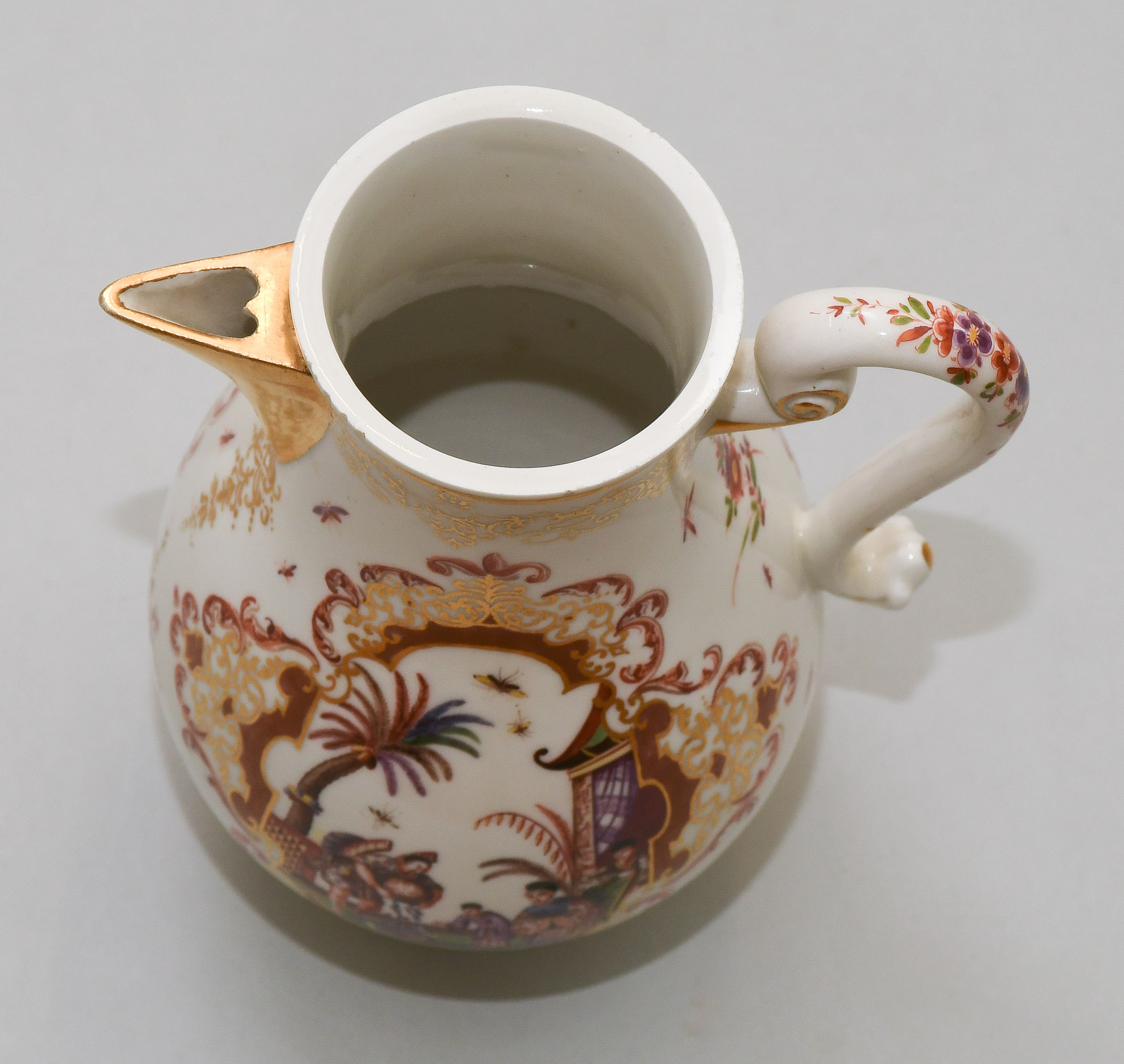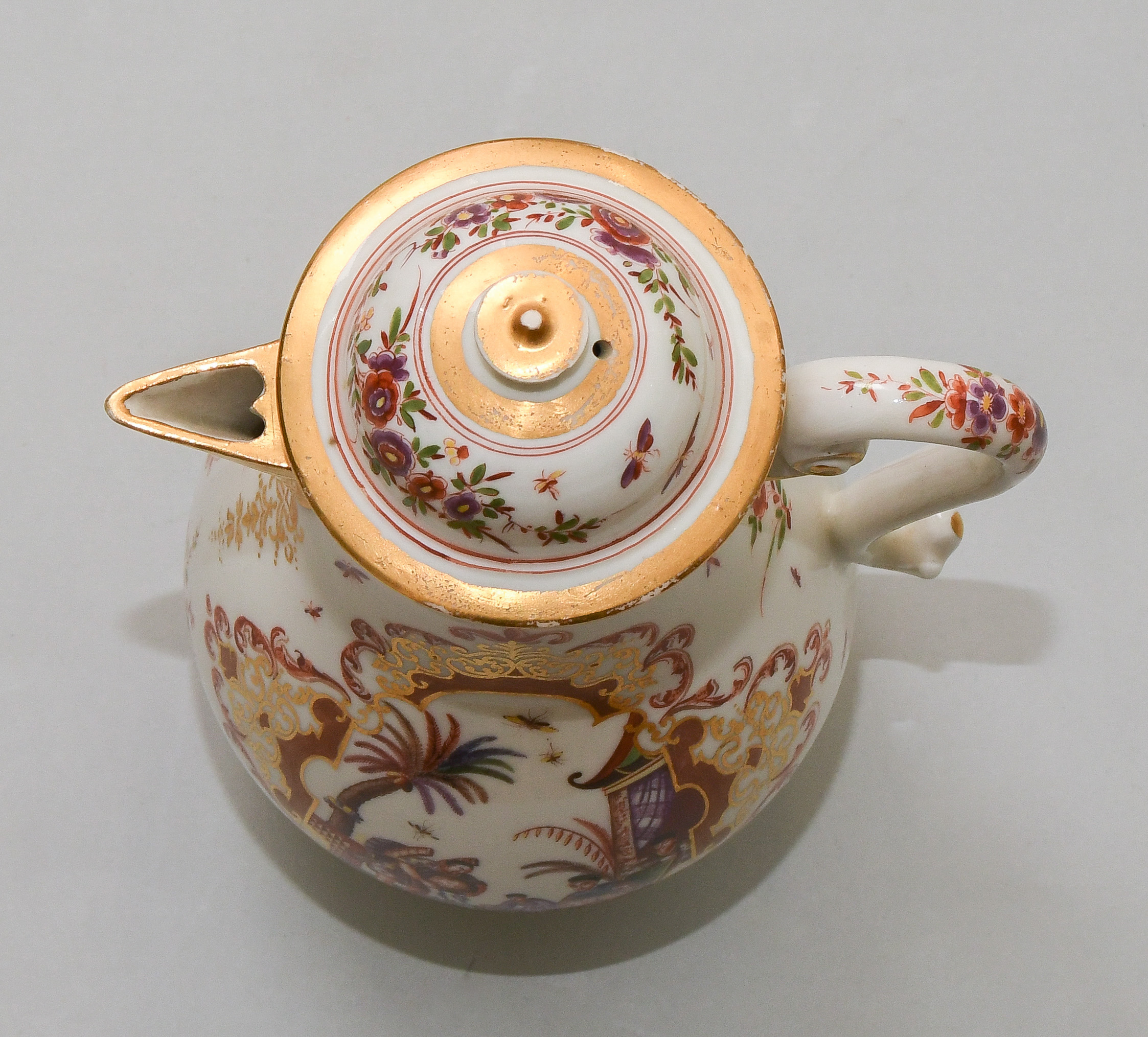 Um 1725. Porzellan, auf der Aussenwandung zwei grosse Kartuschen, darin farbige Chinoiserien, zwischen den Kartuschen und auf dem Deckel bunte indianische Blumen und Insekten, Vergoldung. Bezeichnet: Goldnummer 54. (auf Bodenunterseite und im Deckel). H 21,5 cm.