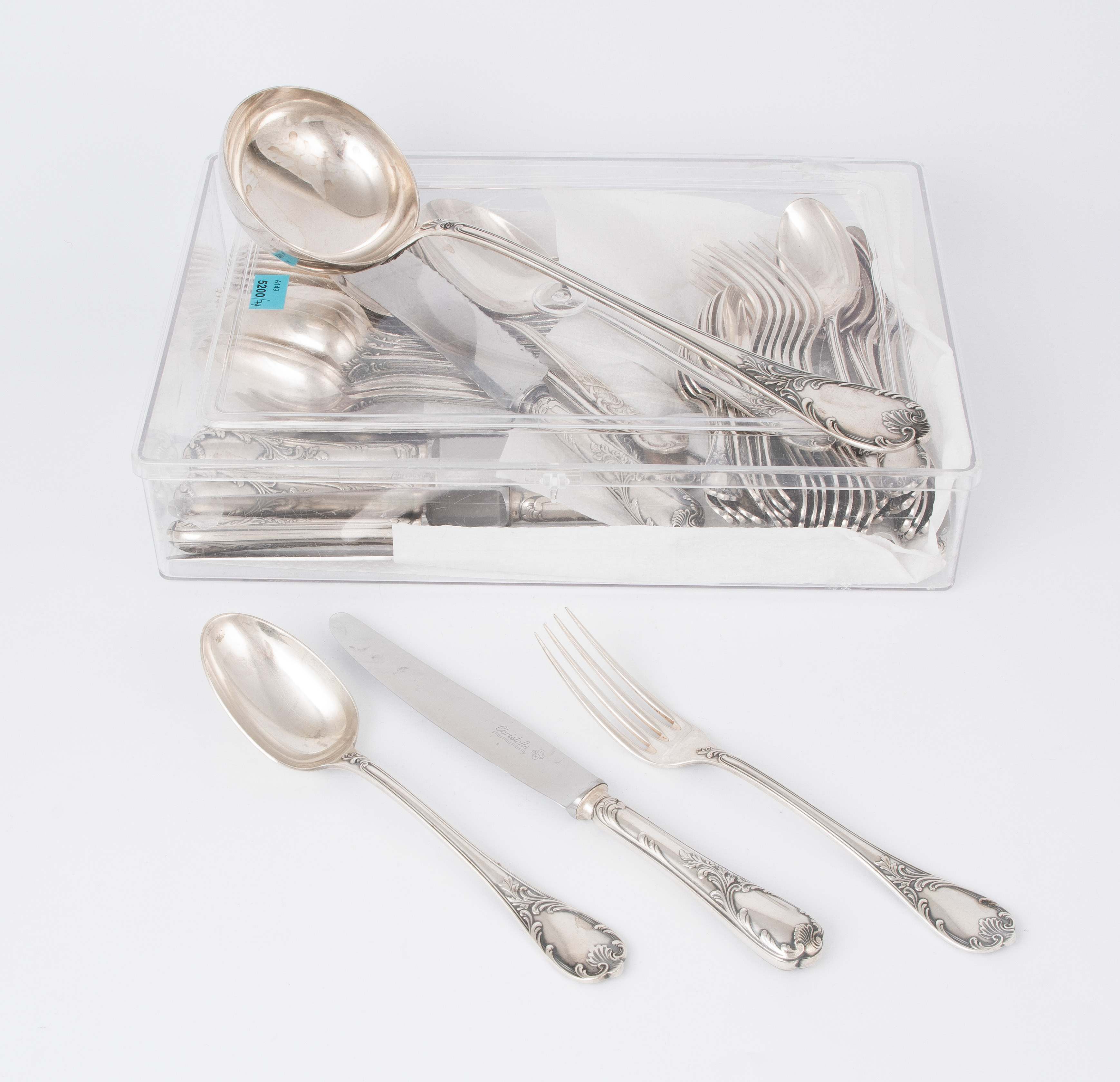 Frankreich, um 1900. Versilbert, 74-teilig. Herstellermarke Christofle. Im Stil des Barock. Bestand: 8 Suppenlöffel, 8 Fischmesser, 8 Fleischmesser und 8 -gabeln, 7 Dessertlöffel, 8 -messer und 7 -gabeln, 9 Kaffeelöffel, 6 Mokkalöffel, 5 Servierbestecke.