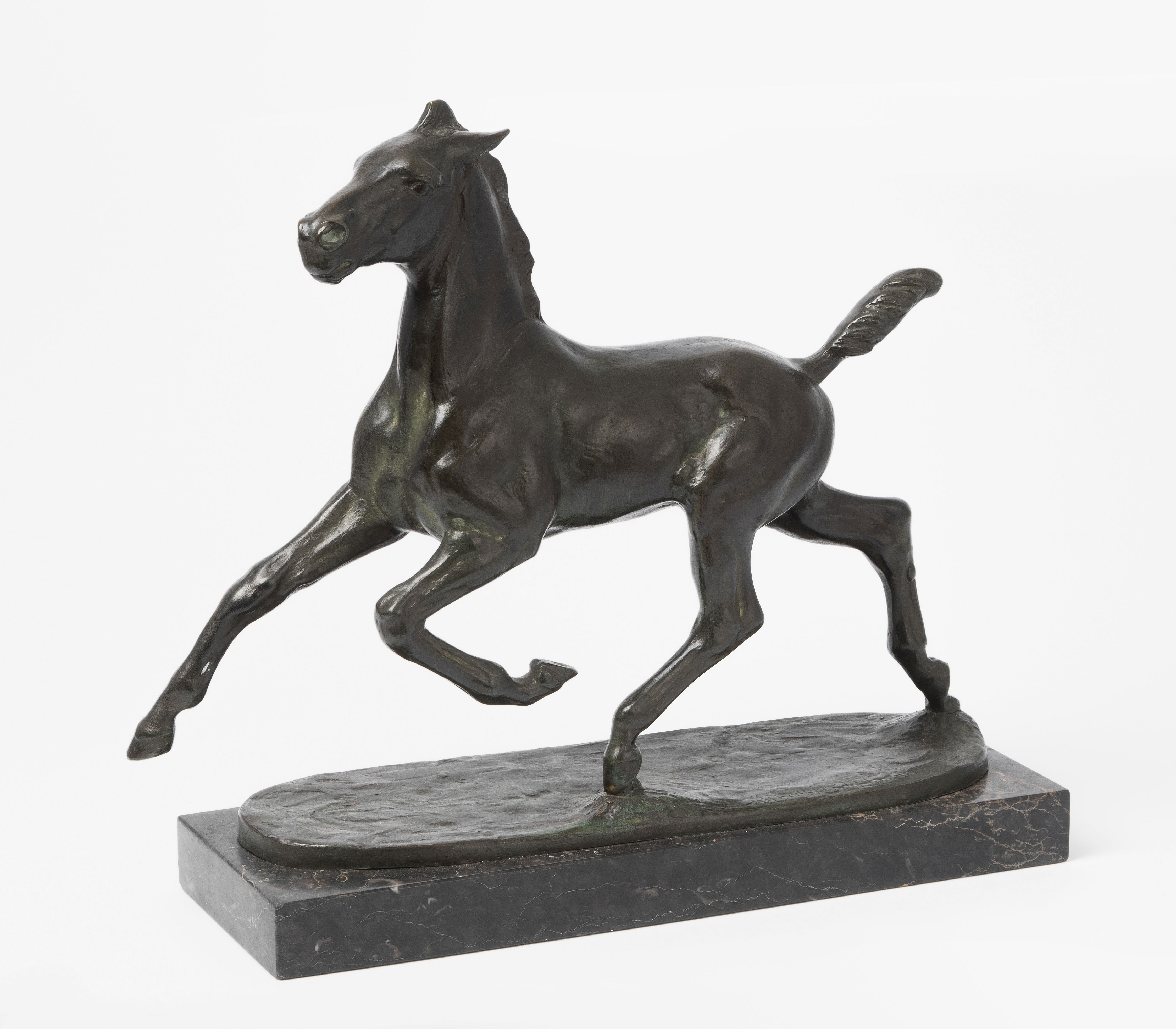 Trabendes Fohlen. Bronze, schwarzbraun patiniert; Marmorsockel. Bezeichnet: Albert Hinrich Hussmann; BILDGIESSEREI KRAAS BERLIN. H 28/31 cm.
