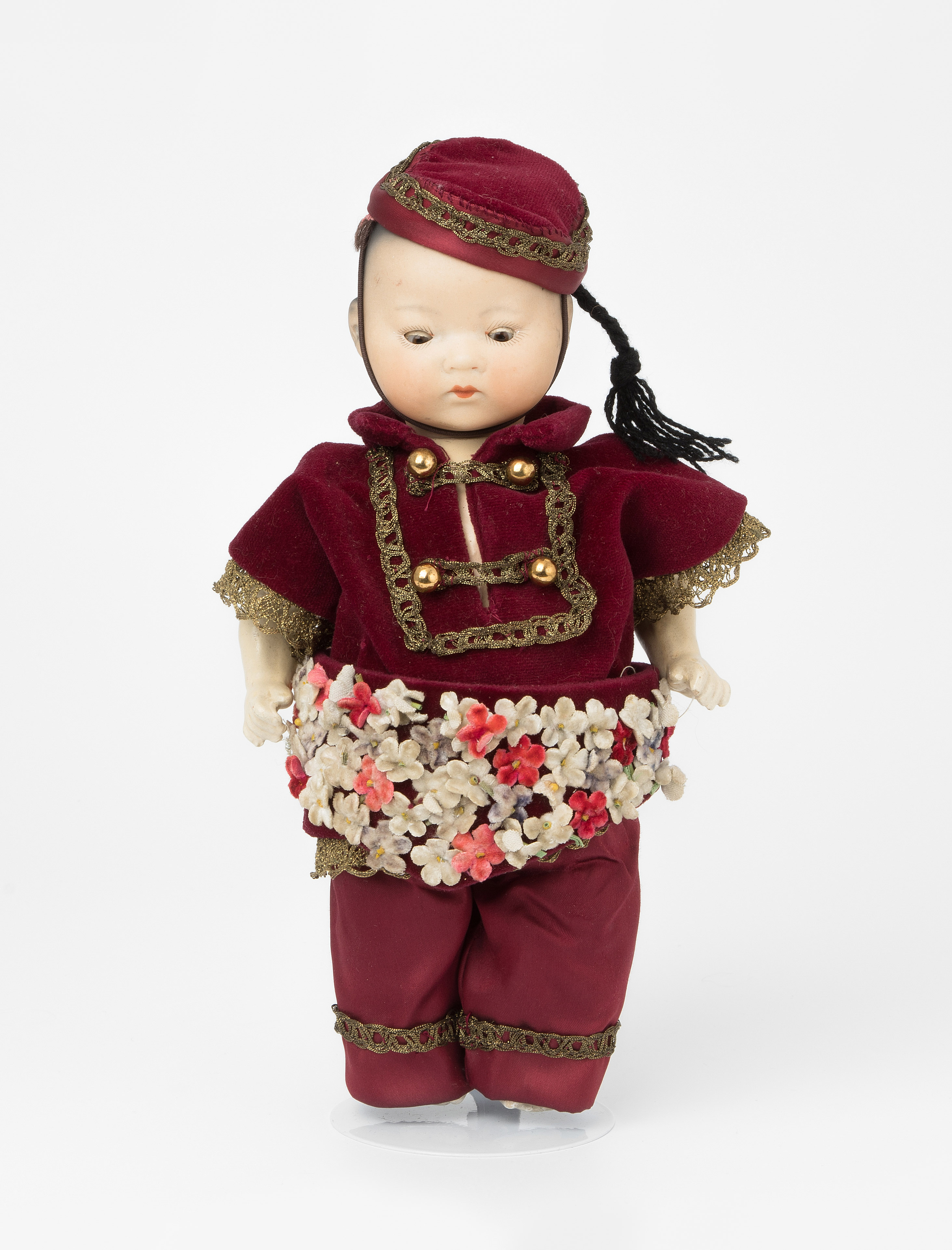 Deutschland, um 1926. Orientale. Vollkopf mit Schlafaugen und geschlossenem Mund aus Biscuit-Porzellan. Schwarzer Haarboden. Halsmarke: "AM, Germany, 353, 12/0, K.". Babykörper aus Masse, Elast zu ersetzen. Bekleidung im alten Stil. H 22 cm.