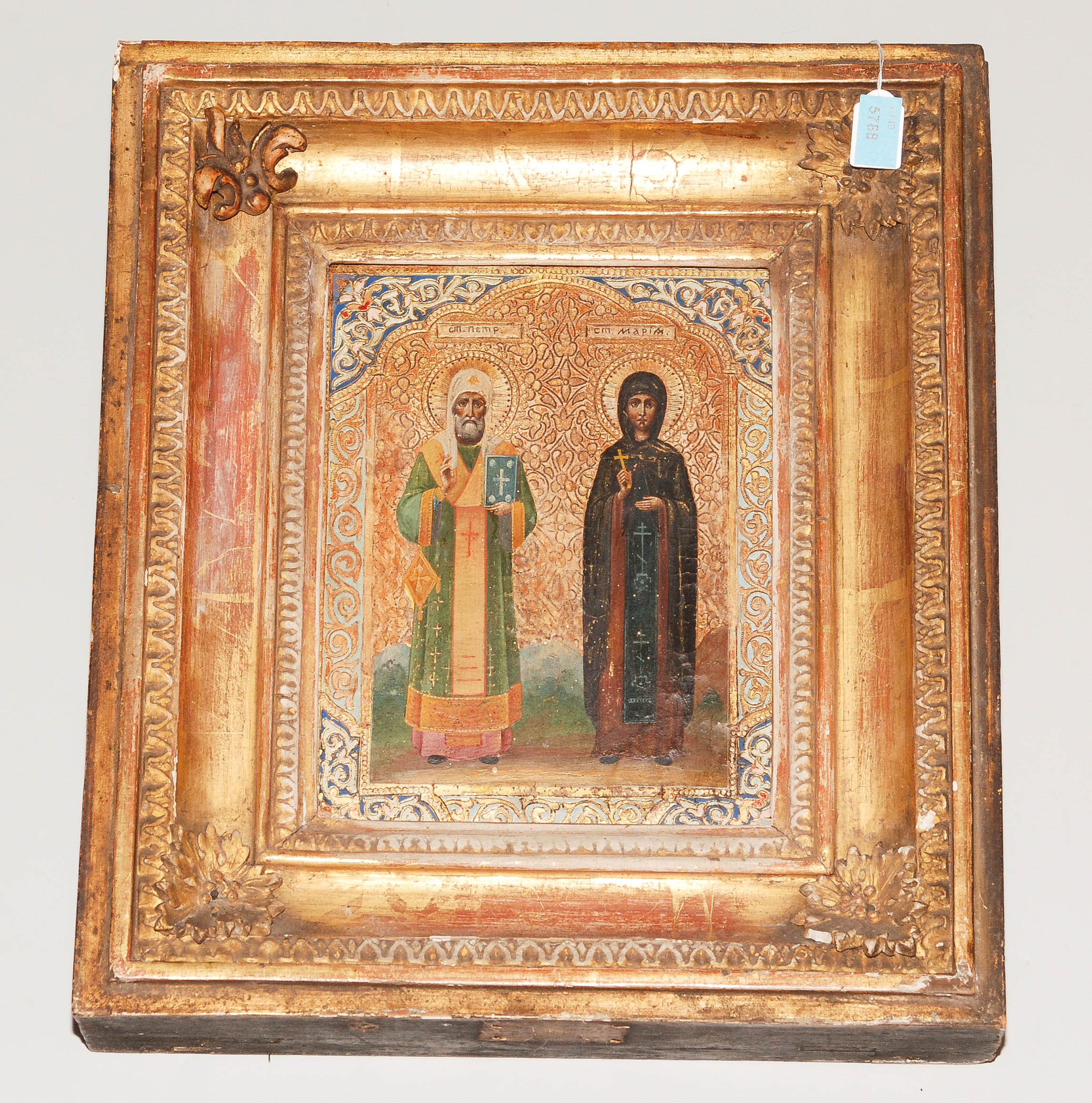 Russisch, Ende 19.Jh. Tempera über Kreidegrund auf Holz. Goldgrund. Ganzfiguren der Hll. Peter und Maria. Hintergrund floral punziert. Umrandung mit Rankengravur farbig bemalt, Emailauflagen imitierend. 21x16 cm. Breiter Holzrahmen mit vergoldeten Profilleisten und floralen Auflagen. 36x31,5 cm.