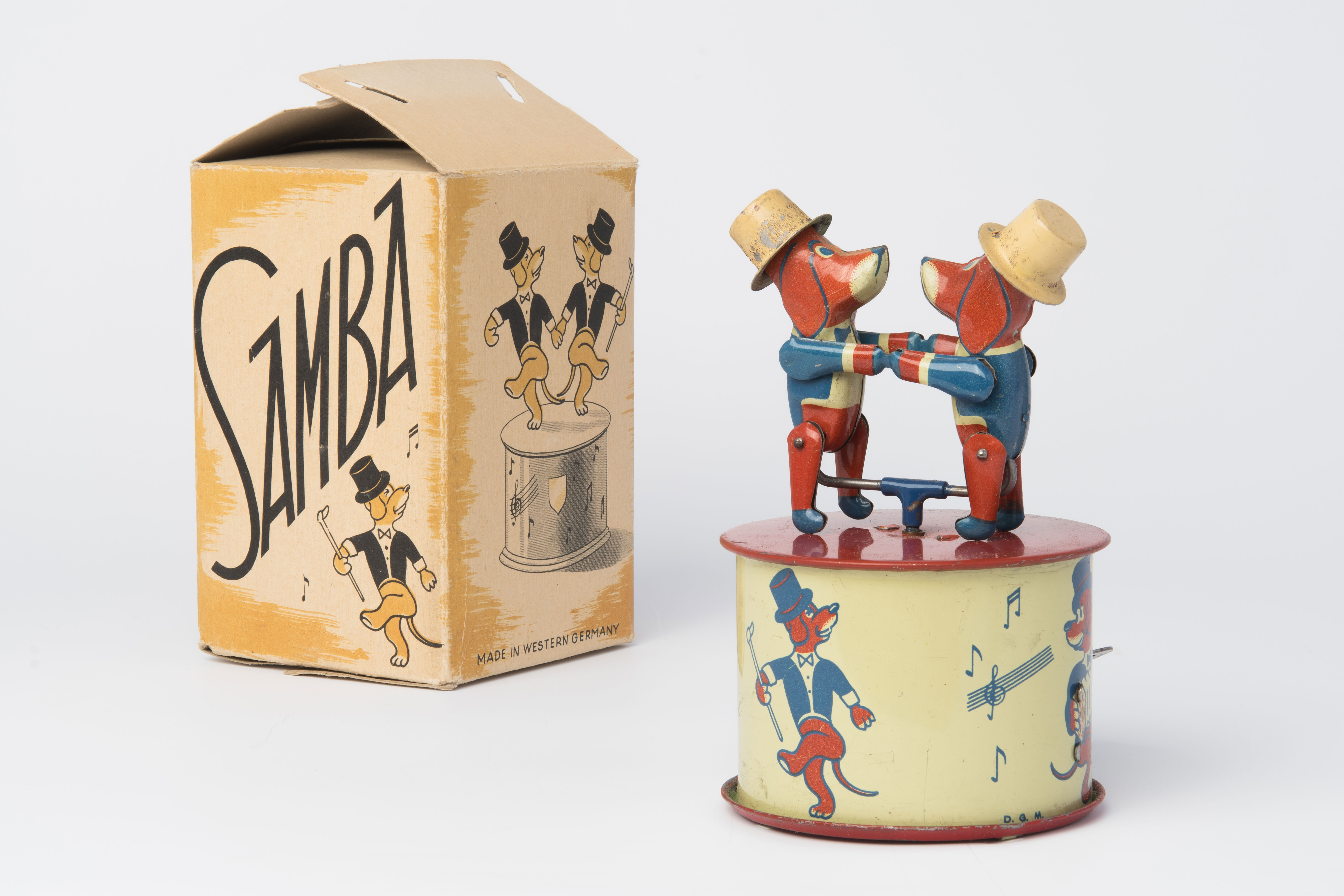 Deutschland, US-Zone. Blech, farbig lithographiert. Tanzendes Hundepaar auf rundem Sockel mit Uhrwerk. Originalkarton. H 13,5 cm.
