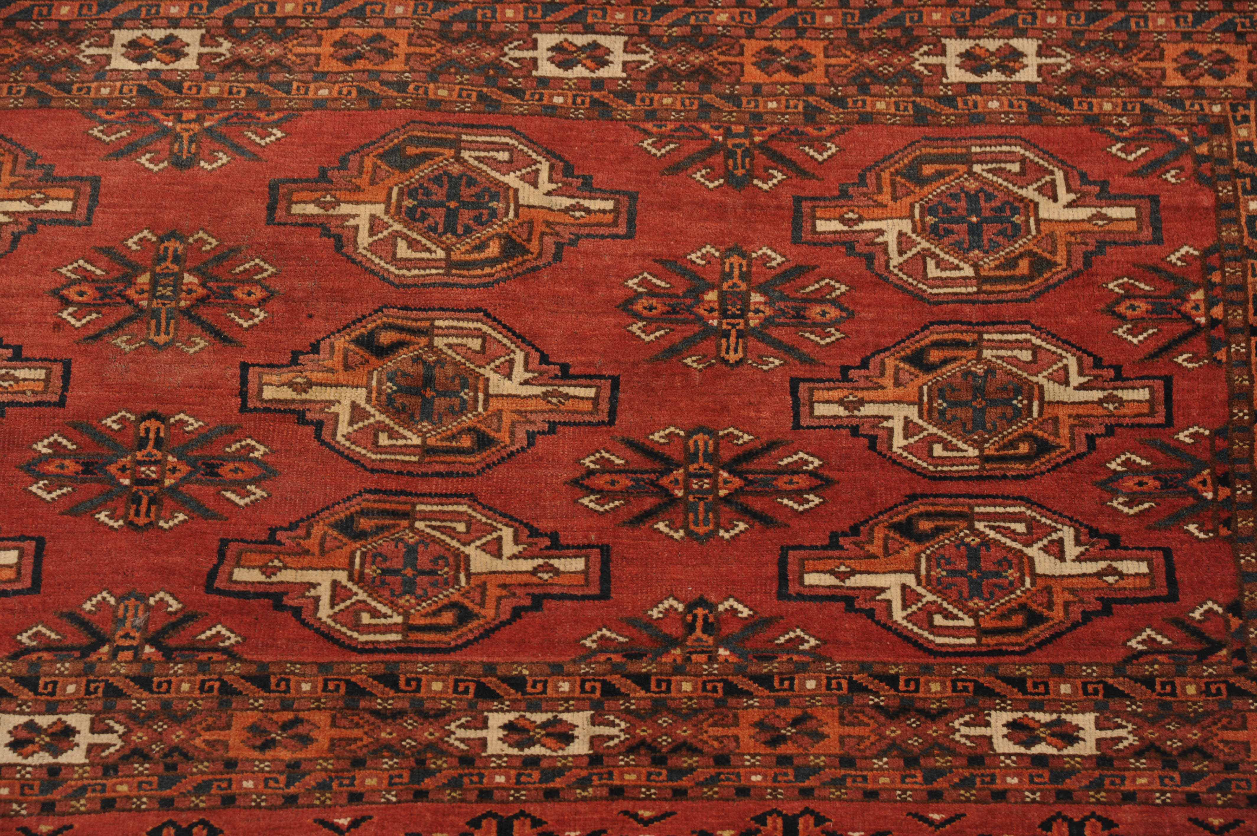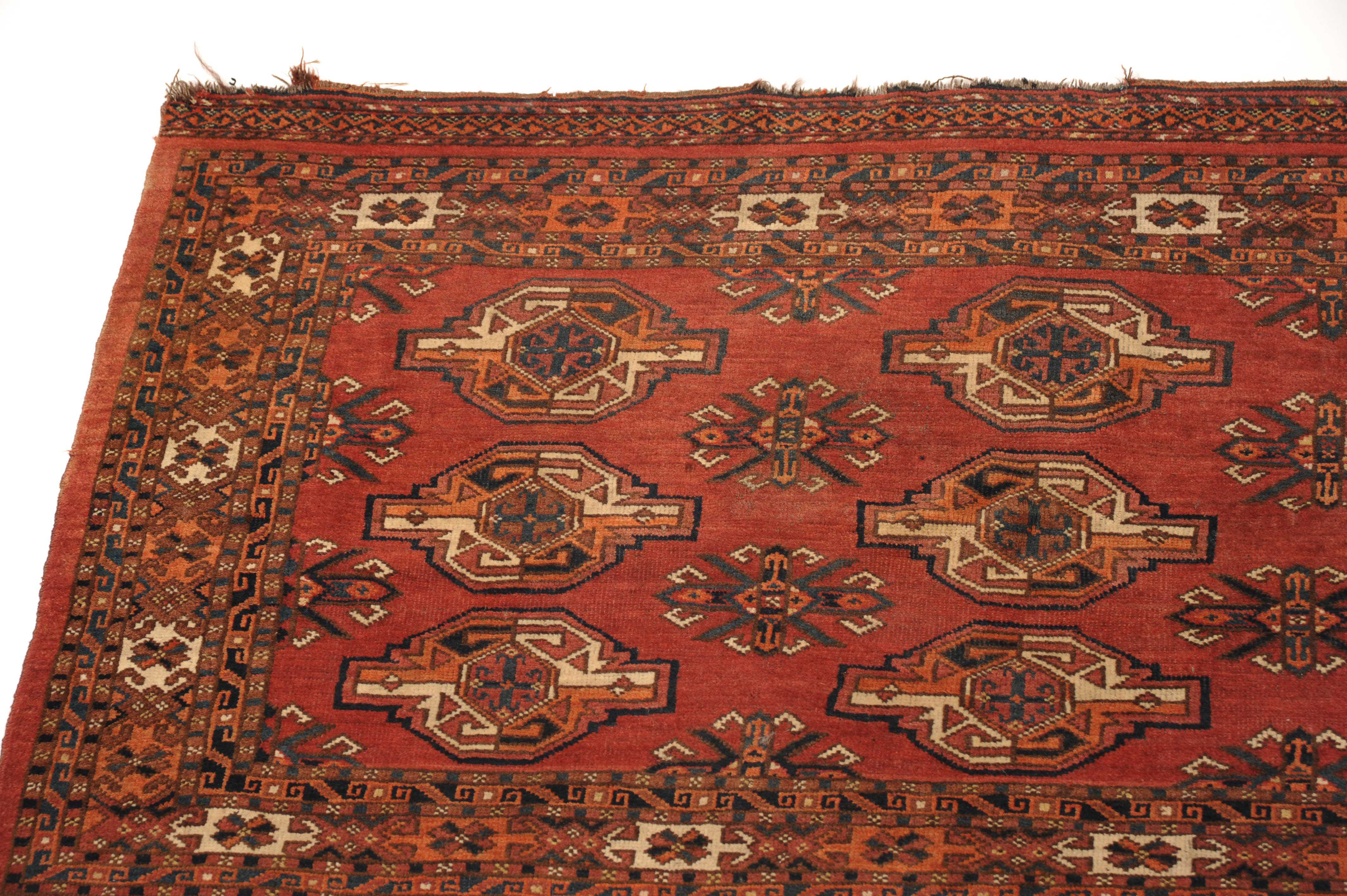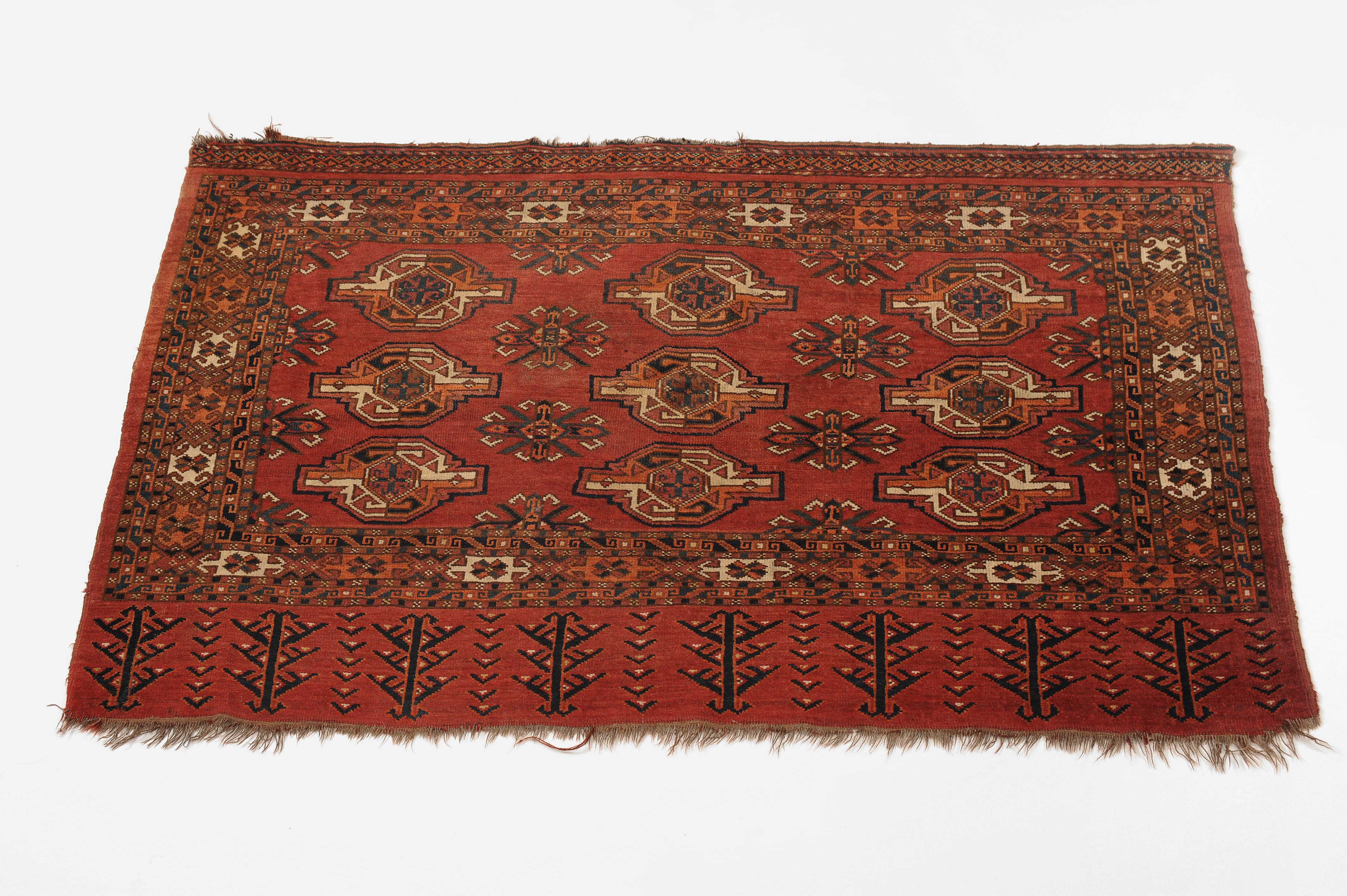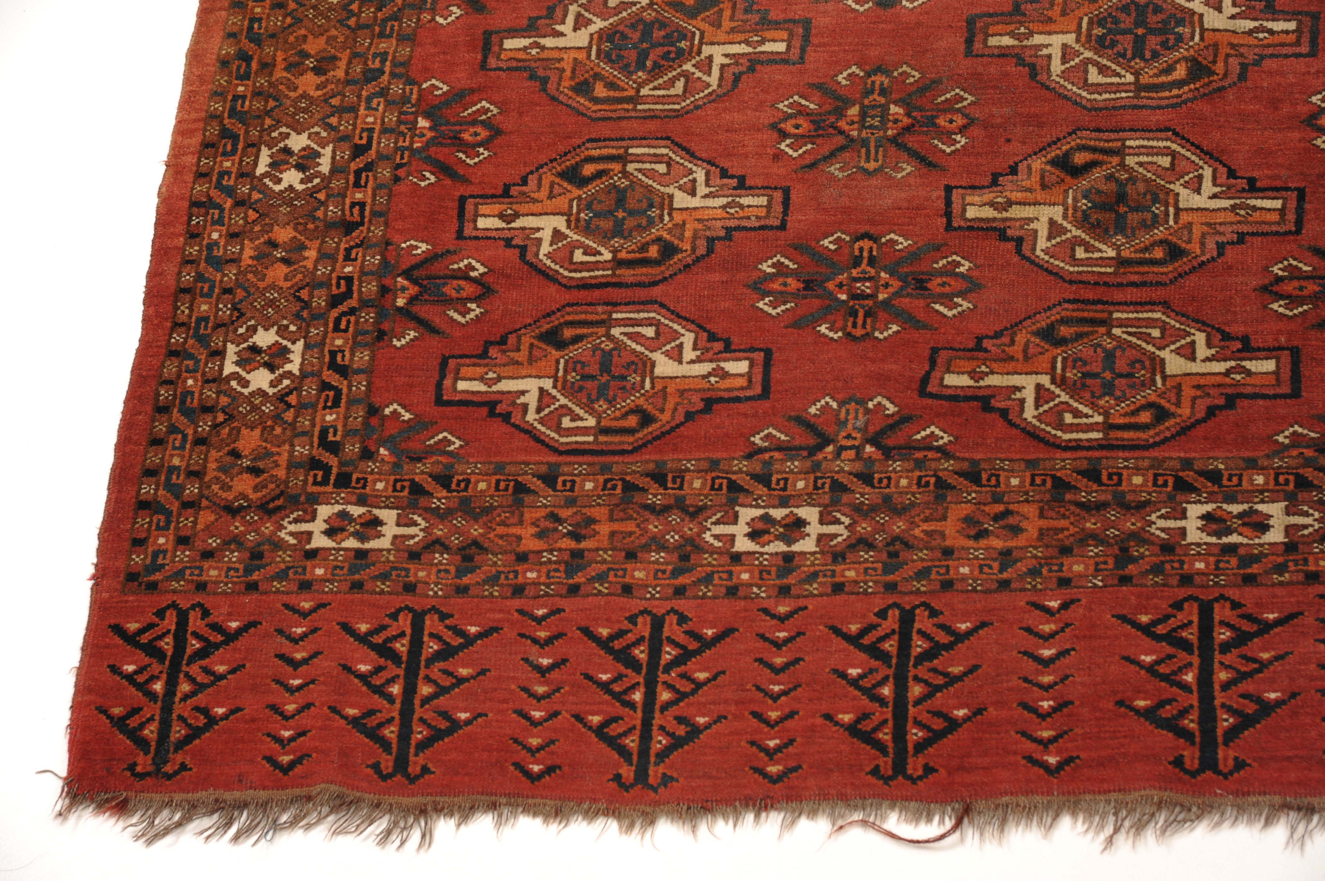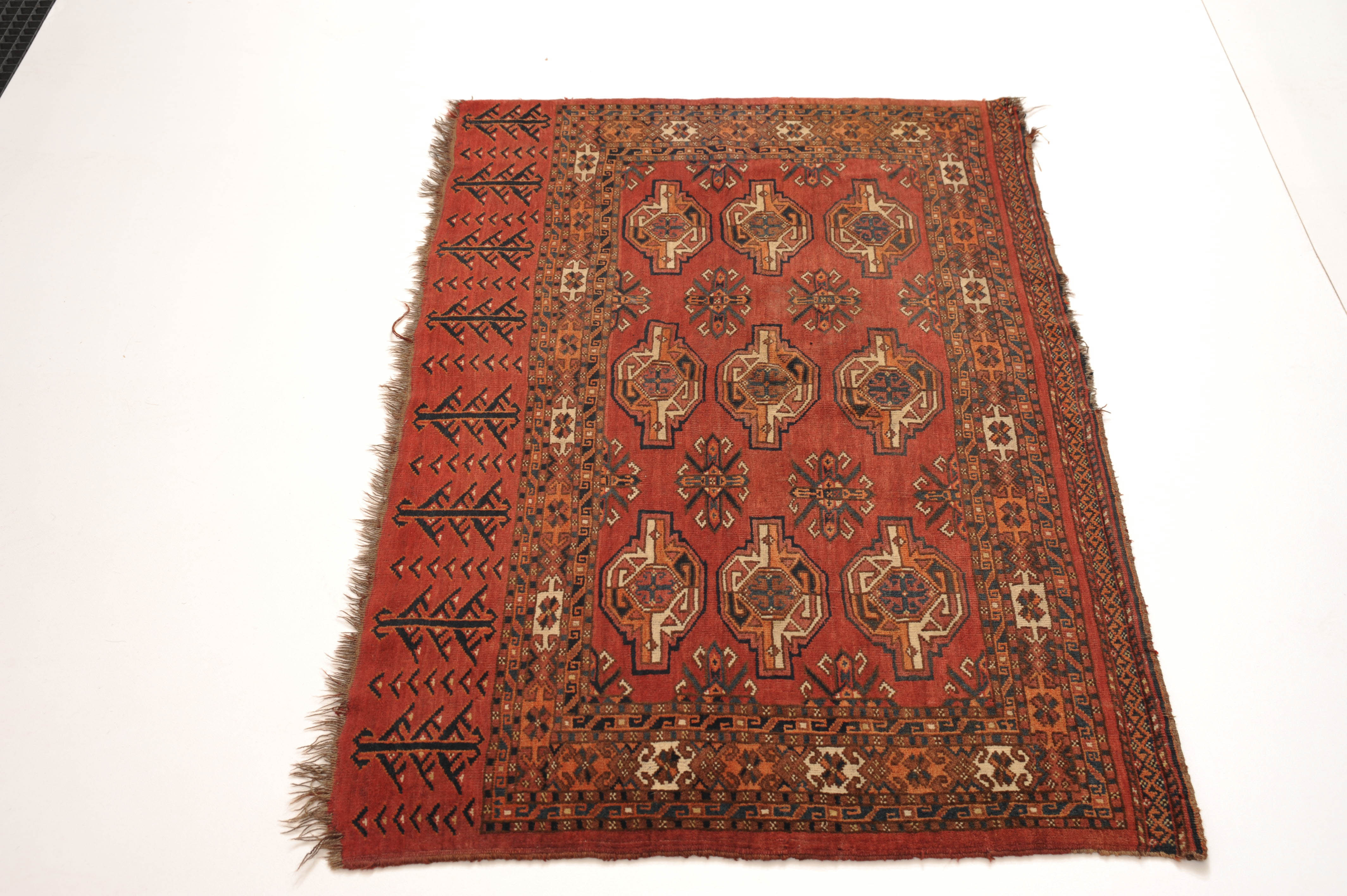 S-Turkmenistan, um 1910. Auf braunrotem Grund liegen 3 Reihen vertikal angelegter Ersari-Göls, flankiert von 2 Reihen mit sekundären Göls. An die Kotschanak-Hauptbordüre grenzt eine mit effektvollen Lebensbäumen belegte Schürze. Gute Erhaltung. 85x144 cm (ft. 2.8x4.8).