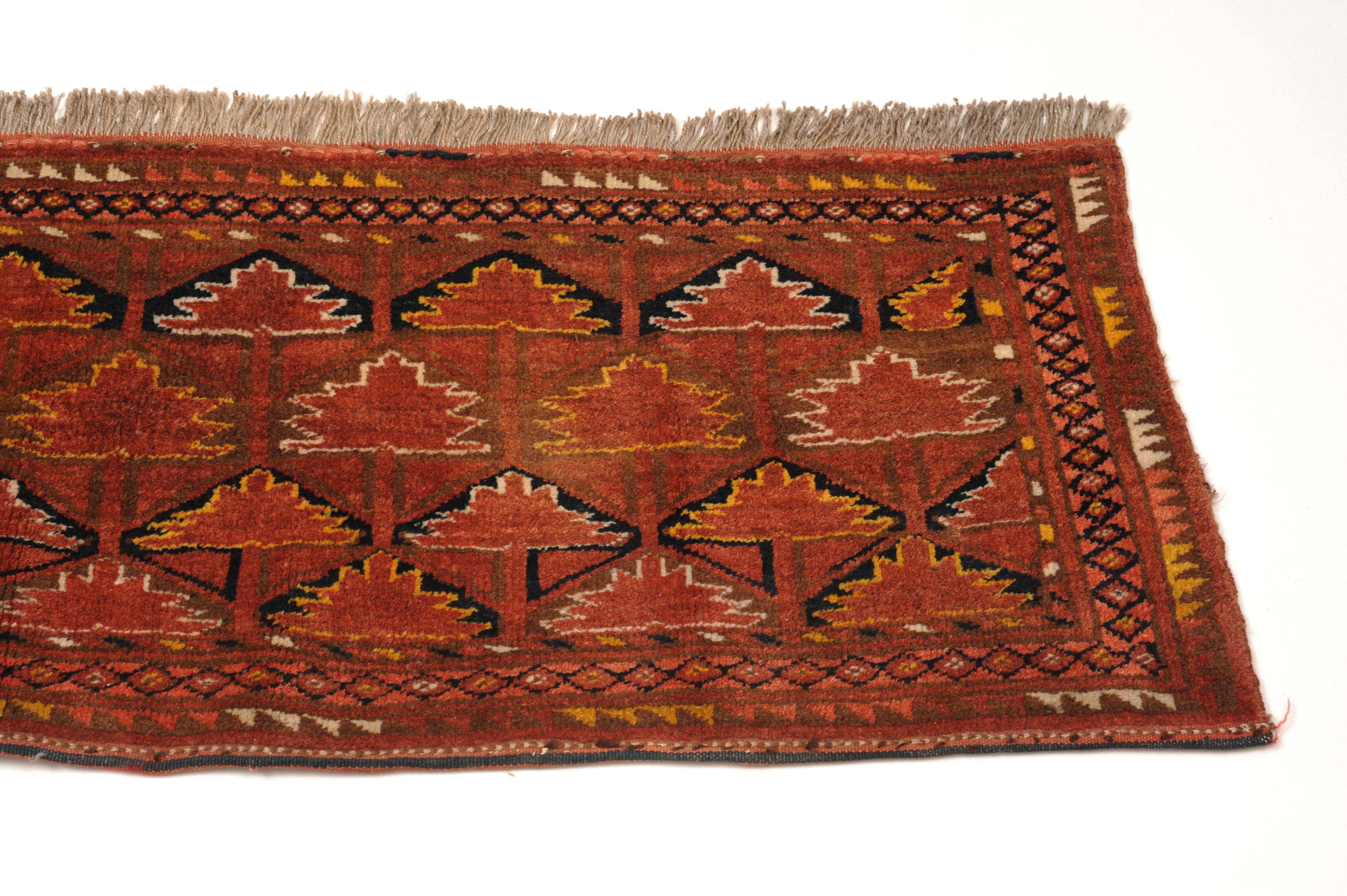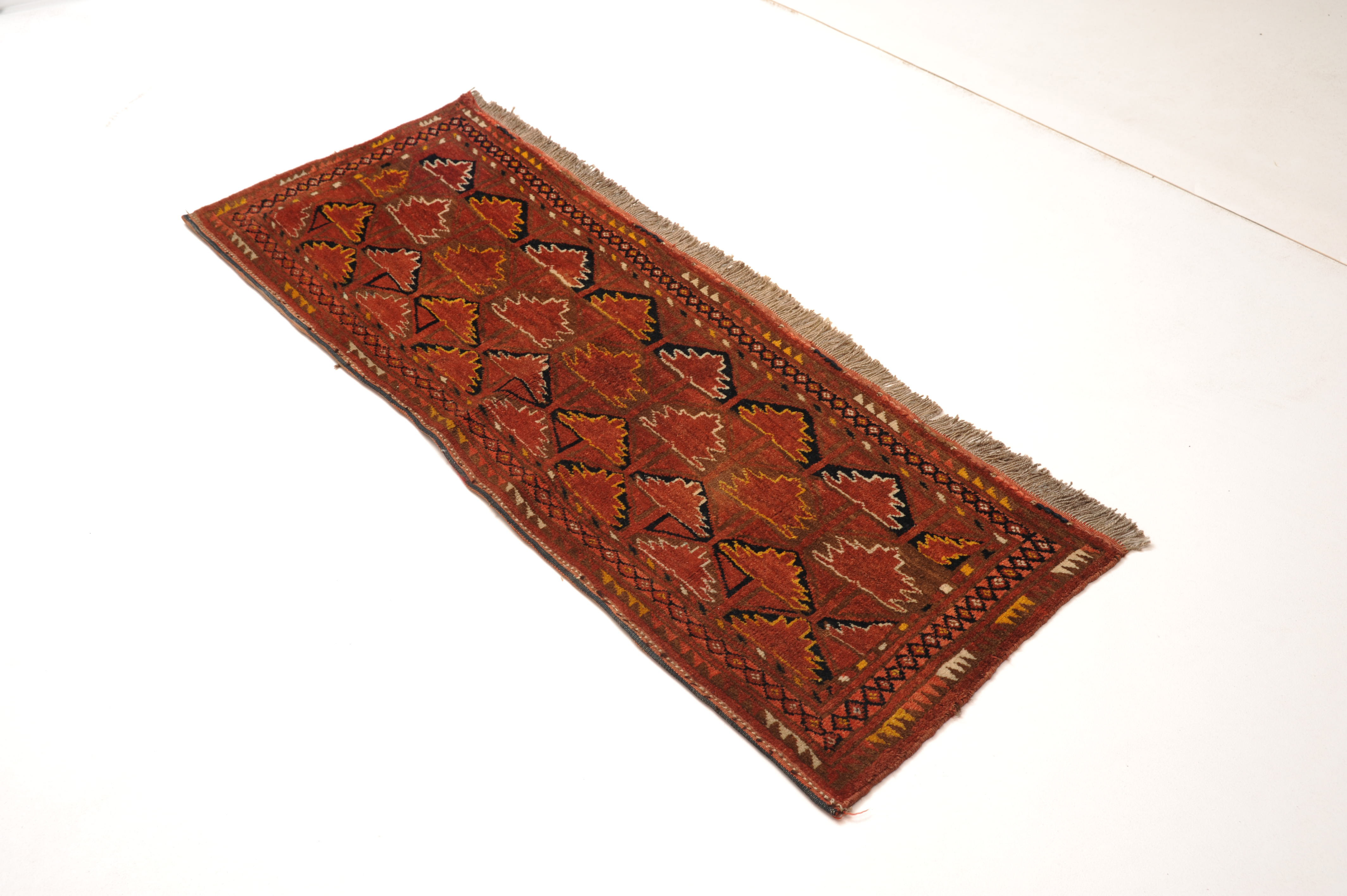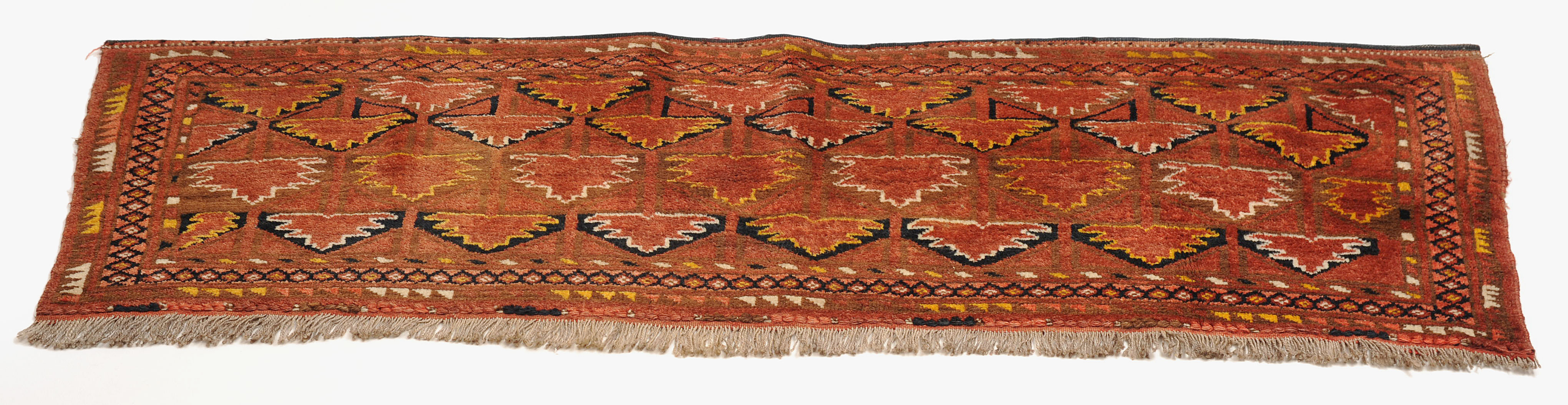 Afghanistan, um 1910. Im braunen Mittelfeld figurieren 4 horizontale blütenverzierte Reihen, die von einer schmalen Rauten-Borte flankiert werden. Gute Erhaltung. 45x145 cm (ft. 1.5x4.8).